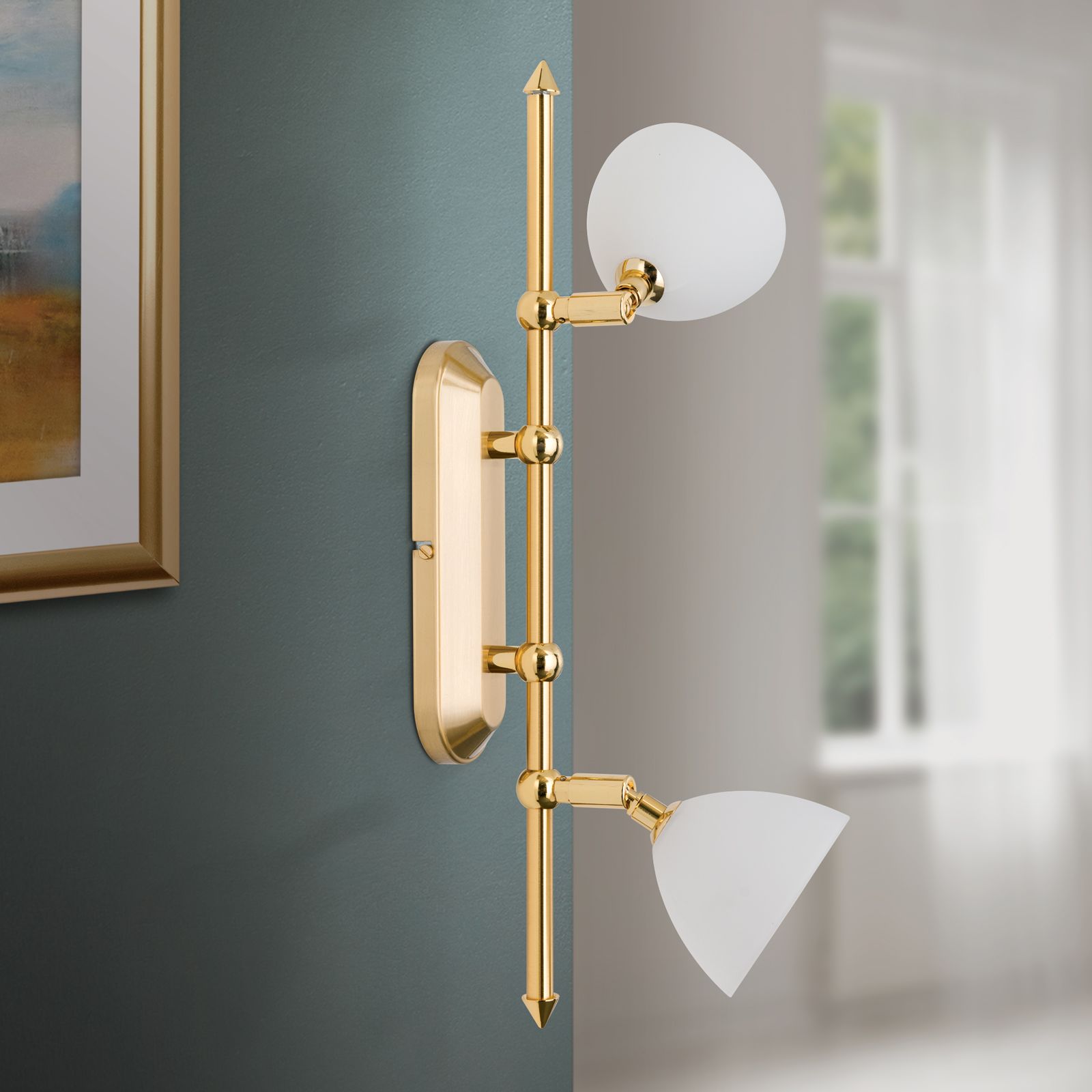Stínidlo z opálového skla také zajišťuje měkké a homogenní rozložení světla. Díky svému funkčnímu a jednoduchému designu a saténově nebo matně zlaté povrchové úpravě lze reflektor integrovat do mnoha obytných prostor.