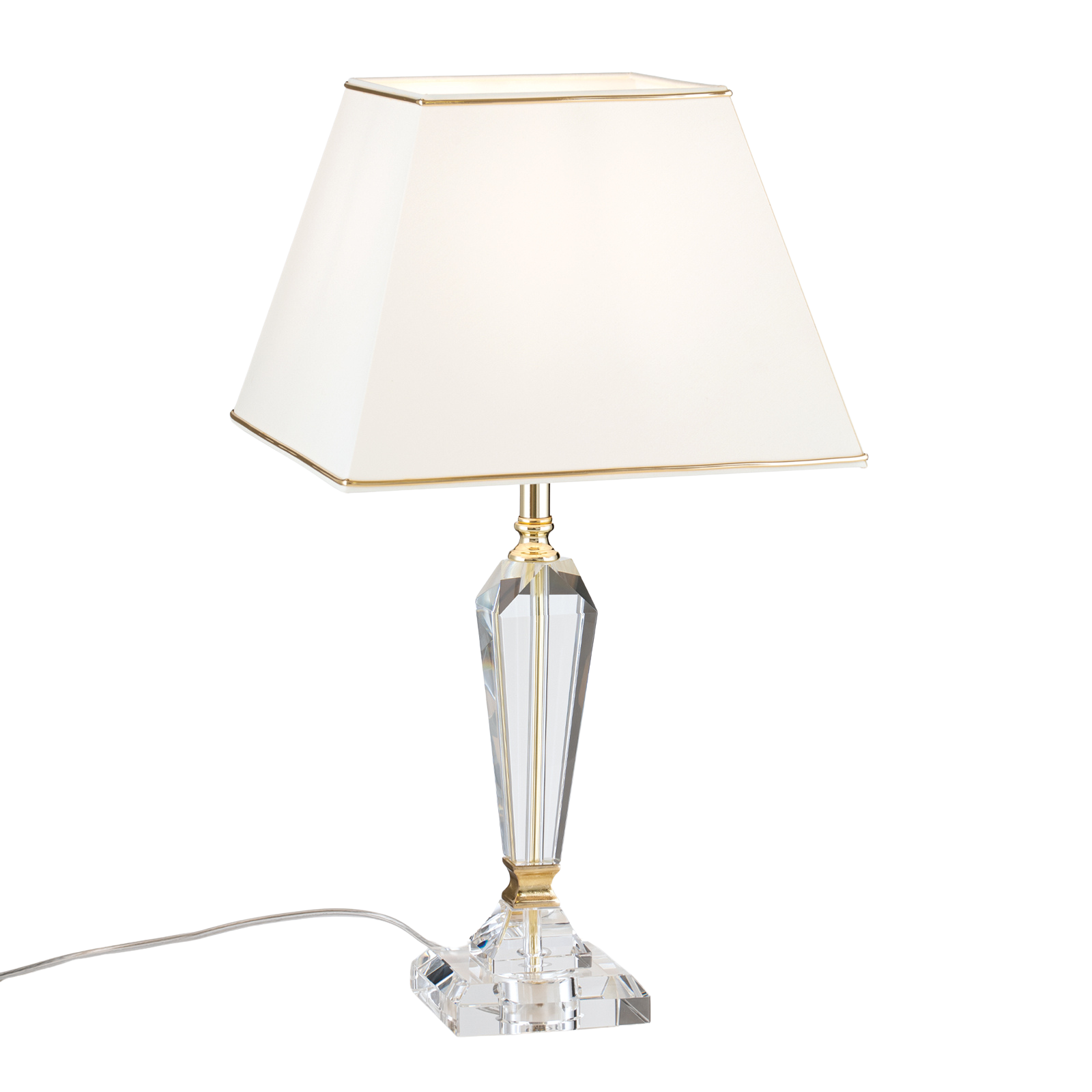 Stolní lampa VERONIQUE zaujme čistými liniemi a kombinací čtvercového textilního stínidla s ozdobným rámem a broušenou štíhlou křišťálovou základnou. Kontrast mezi matným třpytivým látkovým odstínem a lesklým křišťálovým tělem charakterizuje jeho design, který harmonicky zapadne do klasického interiéru. Stylová stolní lampa je vhodná jako akcentační osvětlení v obývacím prostoru i jako noční lampa do ložnice, kde vytváří příjemnou světelnou atmosféru. Lampa je vybavena klasickým držákem žárovky E27. Lampa je k dispozici ve zlato-krémové nebo chrom-bílé verzi a vytváří měkké světlo. Lampu lze snadno zapínat a vypínat pomocí vypínače na průhledném kabelu.