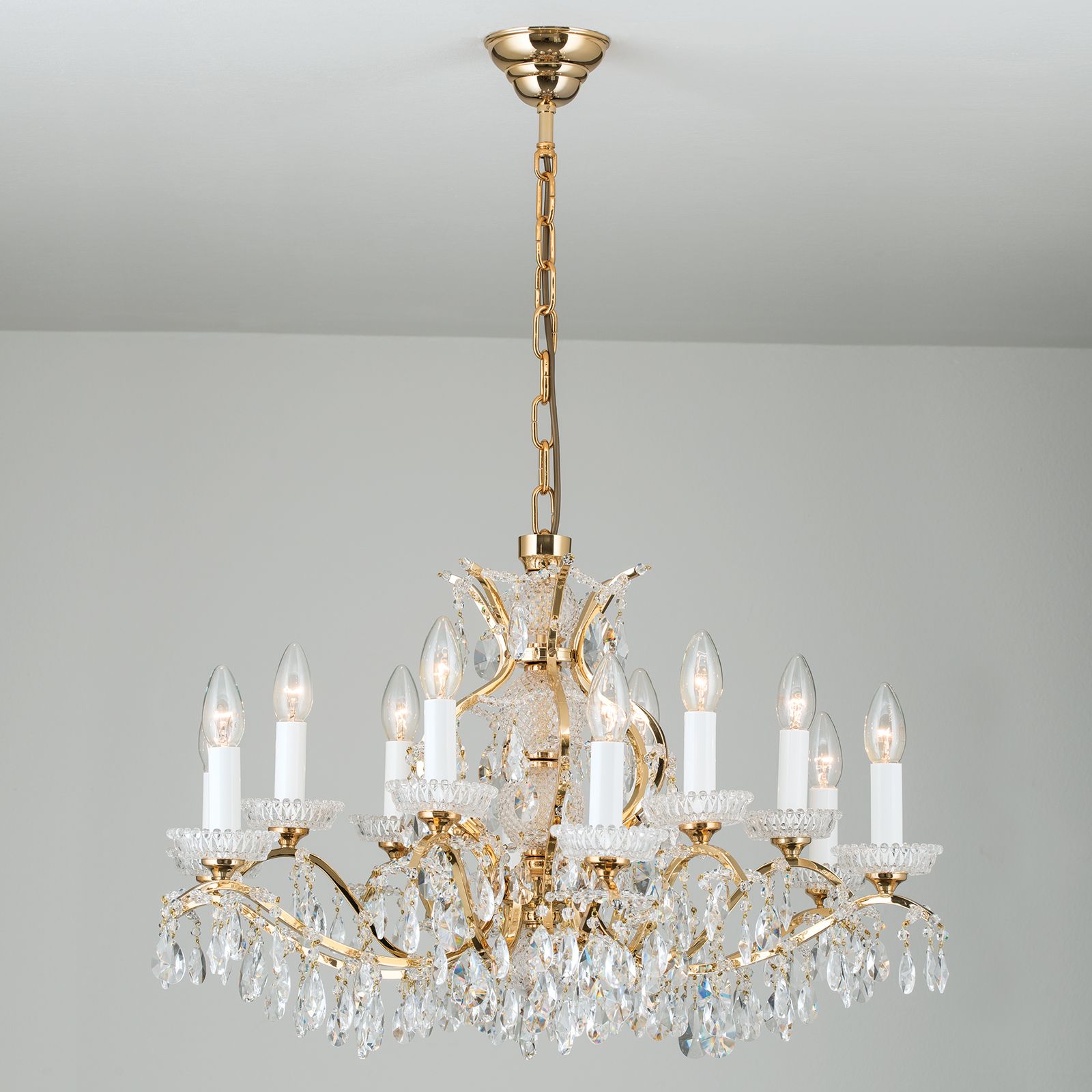 Lustr 6+6 plamenů ze série HIROHITO nás zve na cestu do imperiálních světů. To, co oslovuje japonské Tenno, je vidět i na čtyřech stěnách domova. Dva věnce světla, každý se šesti plameny, obklopují nádherný střed, křišťálový baluster ve tvaru hřídele. To je obklopeno pozlacenými sponami, které se spojují do silně zakřivených širokých ramen. Držáky lamp ve tvaru svíček stojí na odkapávacích podnosech z olovnatého křišťálu. Světelný efekt dvanácti patic E14, každá s maximálním výkonem 40 wattů, spolu se všemi reflexními tělesy - rozeta, řetízek, zlaté tělo, bohaté křišťálové závěsy - se hodí do každé místnosti s velkorysými rozměry. Lustry HIROHITO jsou k dispozici v různých provedeních.
