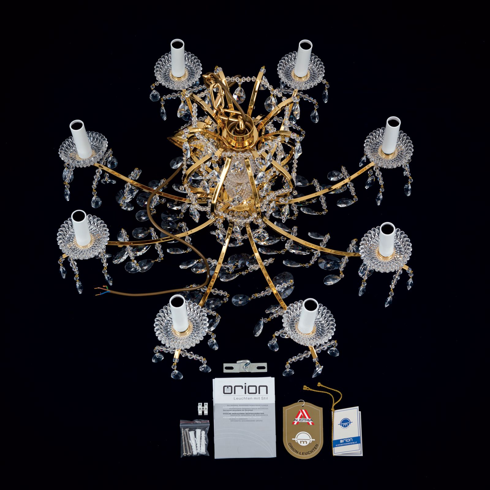 Lustr s 8 plameny ze série HIROHITO má základní vlastnosti barokních lustrů ve stylu Marie Terezie: široká ramena lamp, velkorysé křišťálové závěsy, masivní mosaz a zlatá povrchová úprava jako velkolepé generátory odrazů. Design ramen je obzvláště originální: silné dvojité křivky spojují držáky kalíšek svíček s tělem. Uprostřed je křišťálový baluster. V obývacím pokoji s velkou výškou stropu vytvoří tento lustr úžasně vyvážený světelný zážitek. V kombinaci s dobovým nábytkem vytvoříte královskou atmosféru. Lustr má osm patic E14, každá s maximálním výkonem 40 wattů. Lustry HIROHITO najdete v mnoha variacích.