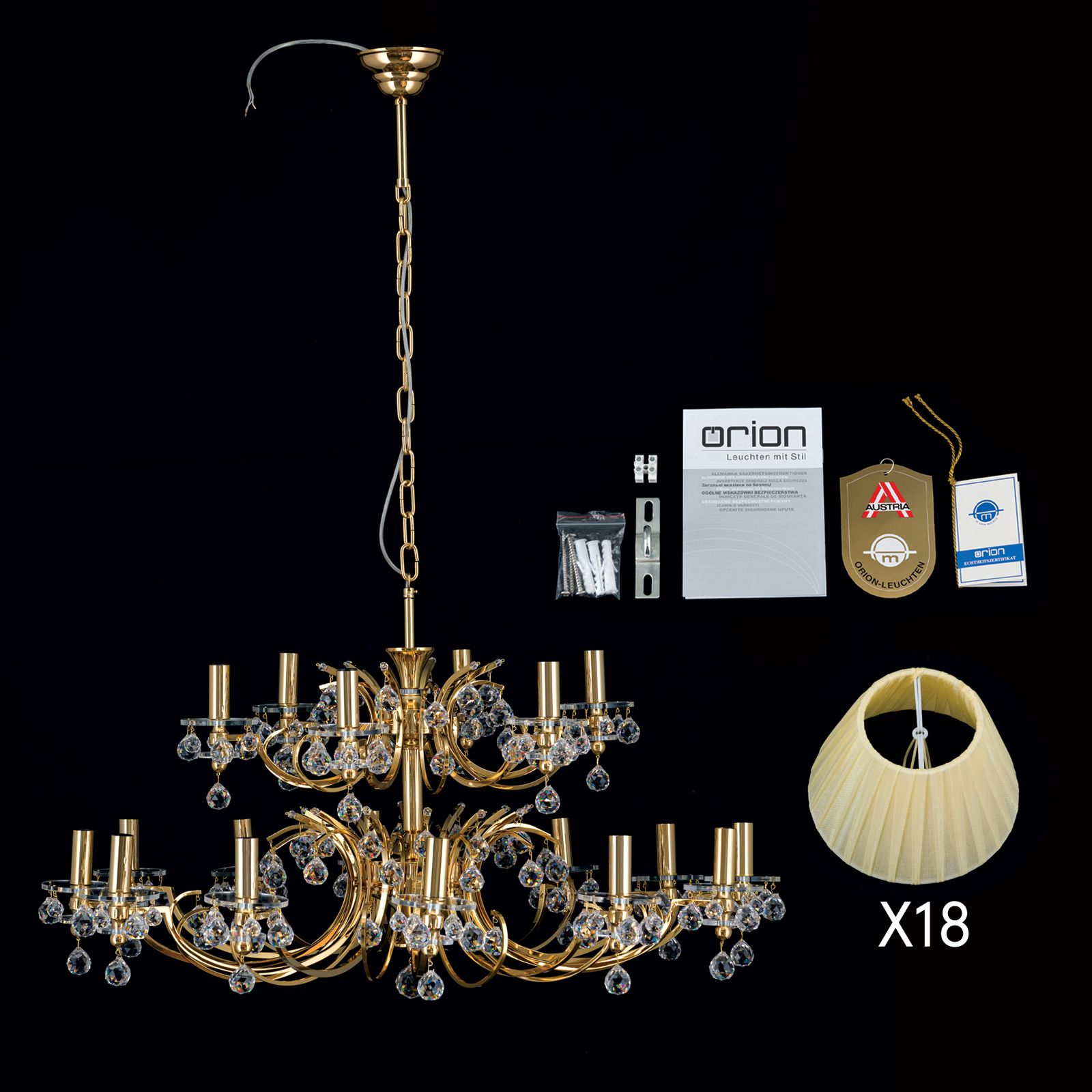 Mimořádně působivý lustr KRISTALLDESIGN zaujme četnými dekorativními prvky. Křišťálové závěsy SPECTRA® Swarovski® Crystal, třpytivé látkové odstíny a lesklý povrch outfitu jsou dokonale sladěny a mimořádným způsobem dotvářejí vzhled. Ve výšce 52 cm se působivých 18 plamenů rozprostírá po dvou patrech, které zajišťují homogenní rozložení světla díky látkovému stínidlu. Zásuvky E14 mohou být vybaveny 40 watty na zásuvku a v případě potřeby stmívat pro vytvoření příjemné atmosféry. Hlavním znakem jsou však křišťálové koule, které se stále častěji vyskytují na deskách lamp. Když lustr zapnete, lom světla odhalí fascinující hry světla, které jsou umocněny lesklým povrchem rámu. Lustr je dostupný v chromovém provedení s bílými látkovými stínidly a zlaté s látkovými stínidly v barvě champagne. Toto zboží je zboží s doručením kurýrem.