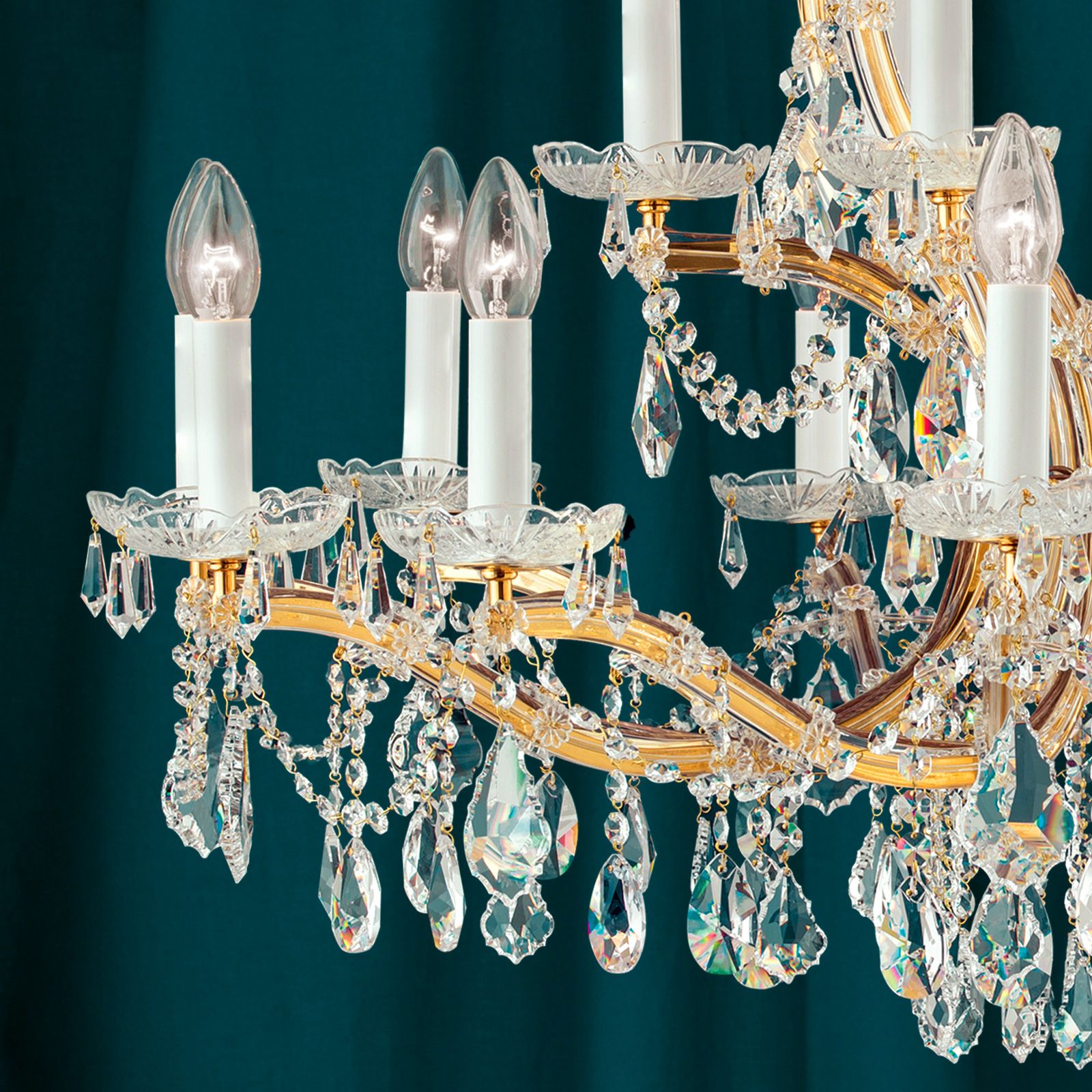 Lustr s 18 plameny ze série MARIA THERESIA dělá čest svému jménu díky korunce s rozevlátými, pozlacenými a glazovanými sponami. Dvě tyčinky s věnci světel atmosféricky rámují korunu. Široce vyčnívající spodní ramena přenášejí stylové světlo po celé šířce místnosti. Jiskra a třpyt cenných křišťálových závěsů vykouzlí uvnitř hvězdnou oblohu. Při plném osvětlení to vypadá, jako by vycházelo slunce. Taková nádhera vyžaduje prostorné pokoje. To nabízí konferenční místnost, luxusní restaurace nebo foyer luxusního hotelu. Lustr je vybaven osmnácti paticemi E14, každá s výkonem až 40 wattů. Svícny v této sérii najdete v různých variacích.