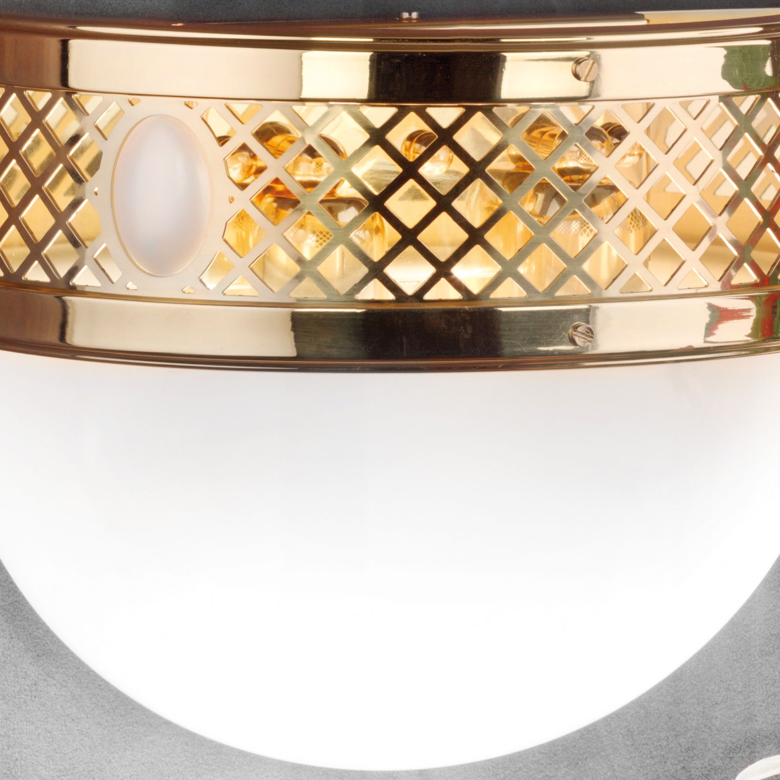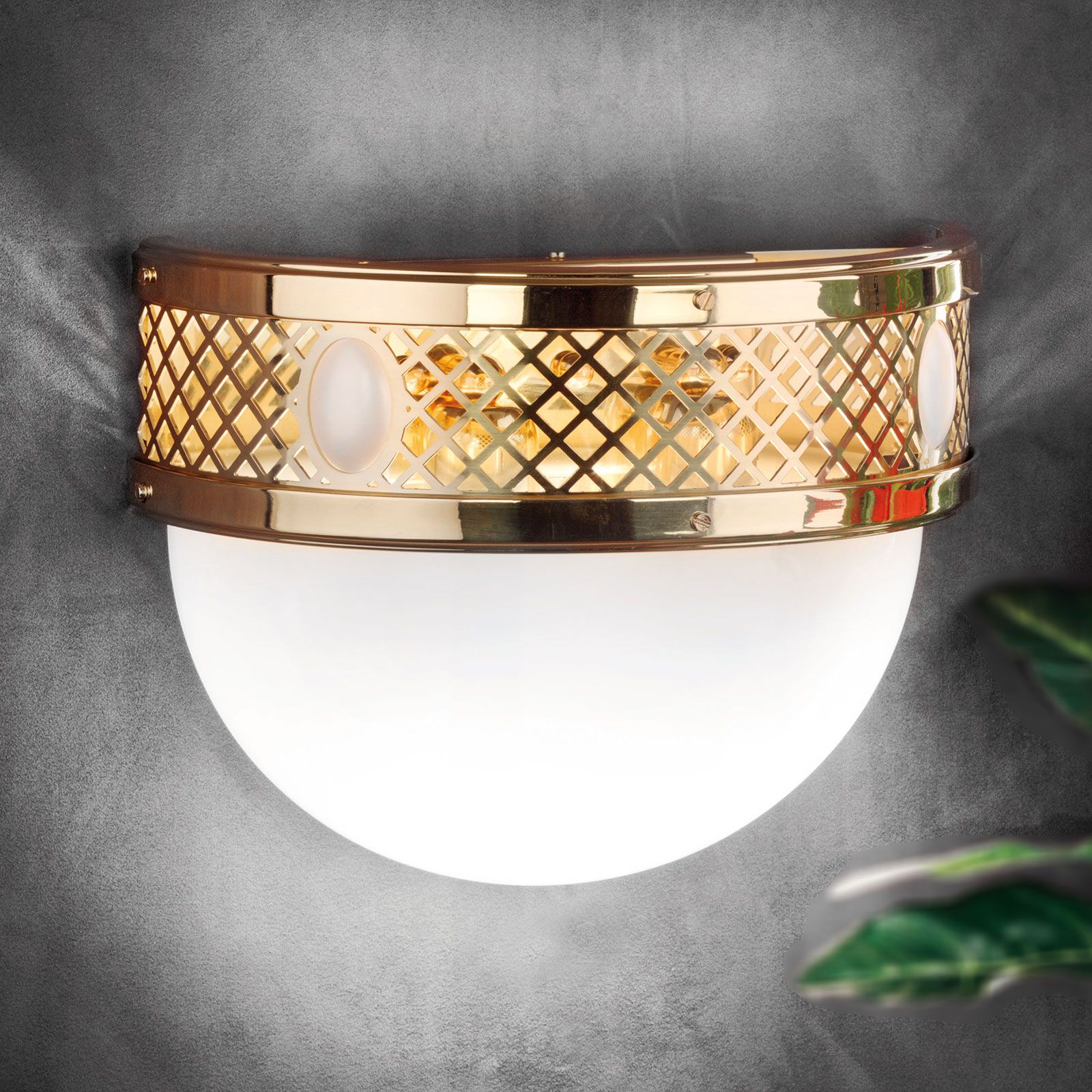 Design nástěnného svítidla vychází ze secese vídeňského fin de siècle, což znamená, že jeho forma a funkce jsou esteticky v souladu. Mosazný rám s lesklým povrchem a ozdobnými kamínky propouští světlo skrz mřížku a vrhá na zeď elegantní svatozář. Polokulové skleněné stínidlo je satinováno a jemně vyzařuje světlo do místnosti - může to být obývací pokoj, ložnice nebo jídelna, ale i chodba nebo vstupní prostor. Nástěnné svítidlo je vybaveno dvěma paticemi E27, každá s výkonem až 60 wattů. Tato lampa je k dispozici také ve verzi Patina.