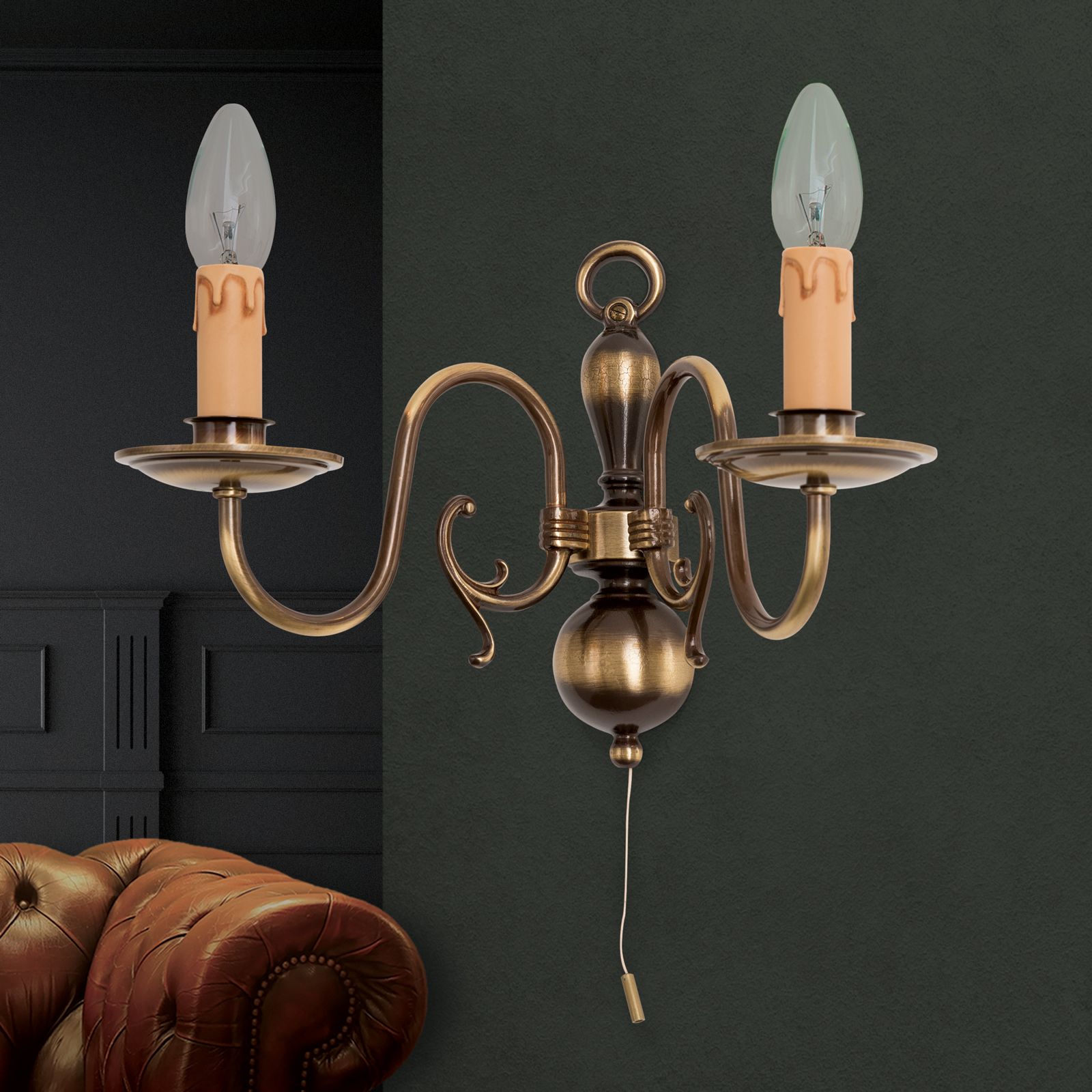 2žárovkové nástěnné svítidlo FLÄMISCH je díky svému starožitnému patinovanému vzhledu vhodné pro kombinaci s důstojnými, kvalitními interiéry. Stylový design těla světla, založený na vlámském umění z tepaného železa, vytváří domáckou, intimní atmosféru. Vzniklo měkké světlo, teplé barvy, velkoryse čalouněný nábytek a prostor pro dobrý pocit. Atmosféru dotváří také poryv větrných lamp s blikajícími svíčkami. Nástěnné svítidlo poskytuje výkon až 40 wattů každé prostřednictvím dvou patic E14. Světlo je stmívatelné a snadno se ovládá pomocí tahového spínače. Použití energeticky účinných žárovek pomáhá šetřit životní prostředí, klima a peníze.