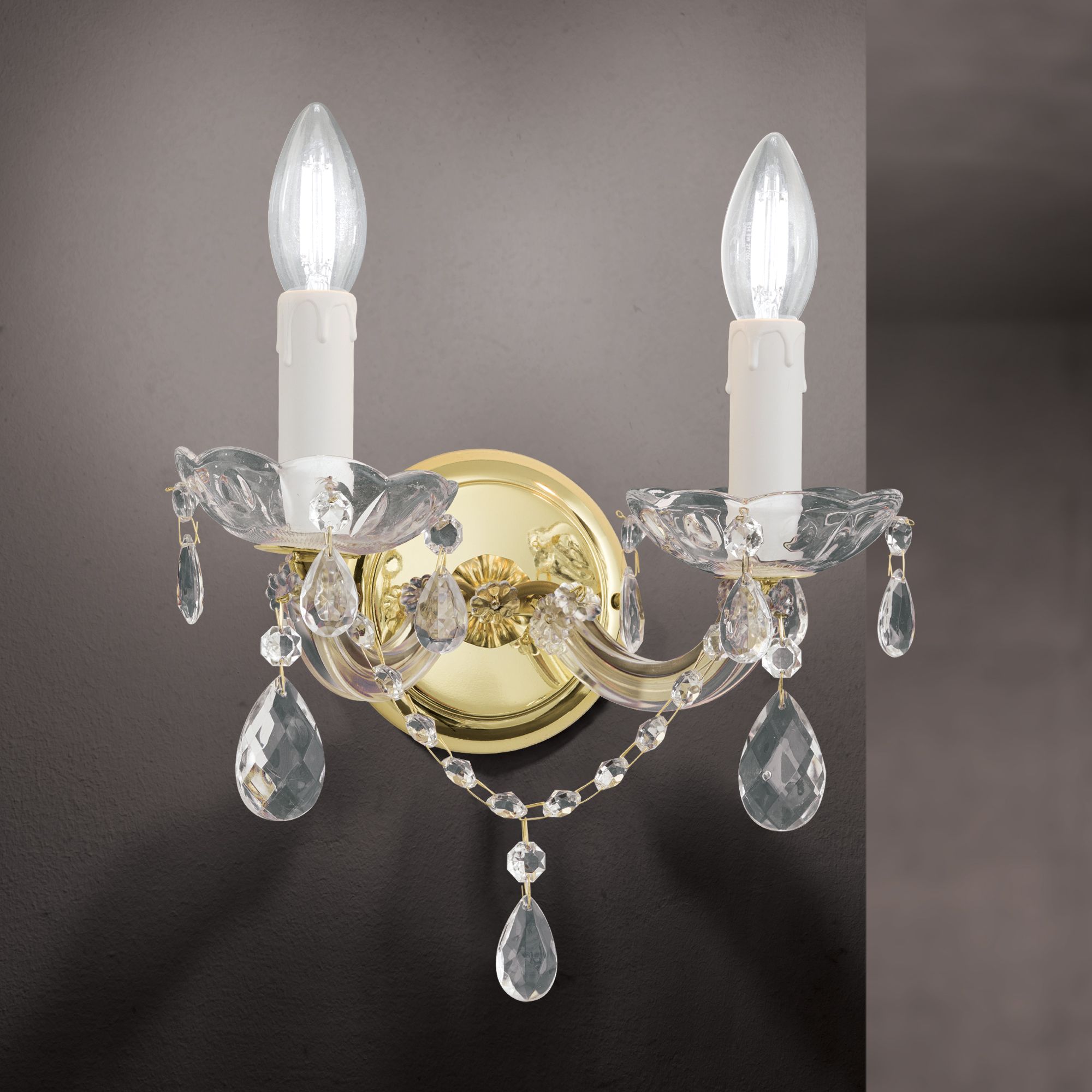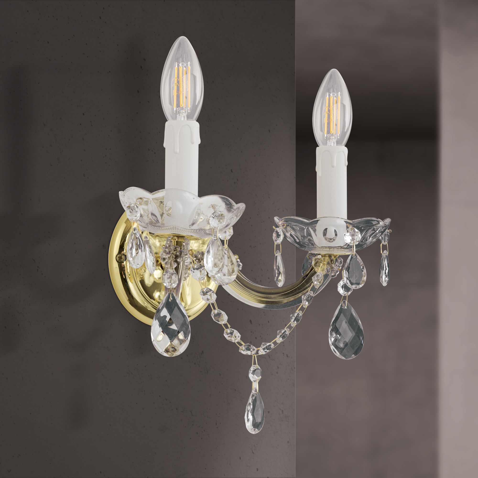 Nástěnné 2-žárovkové svítidlo z produktové řady MARIE CLAIRE lze pro svůj vznešený vzhled označit za nástěnnou dekoraci. Jako diadém, který korunuje vznešenou hlavu, tato lampa povyšuje místnost na noblesu. Vysoce kvalitní sklářská práce, krystaly, řetízky, zlatá nástěnná rozeta: vše vyzařuje klidnou krásu. Pokud do objímek dáte i svíčky poryvů větru, je obraz dokonalý. Nástěnné svítidlo se dvěma paticemi E14 dodává dvakrát výkon až 40 wattů. Klima a životní prostředí stojí za poslední zamyšlení: pomáhají energeticky účinné žárovky LED. Série MARIE CLAIRE obsahuje kromě jednožárovkového nástěnného svítidla také lustry: 15-světlo, 9-světlo, 8- světlo, 5-žárovka.