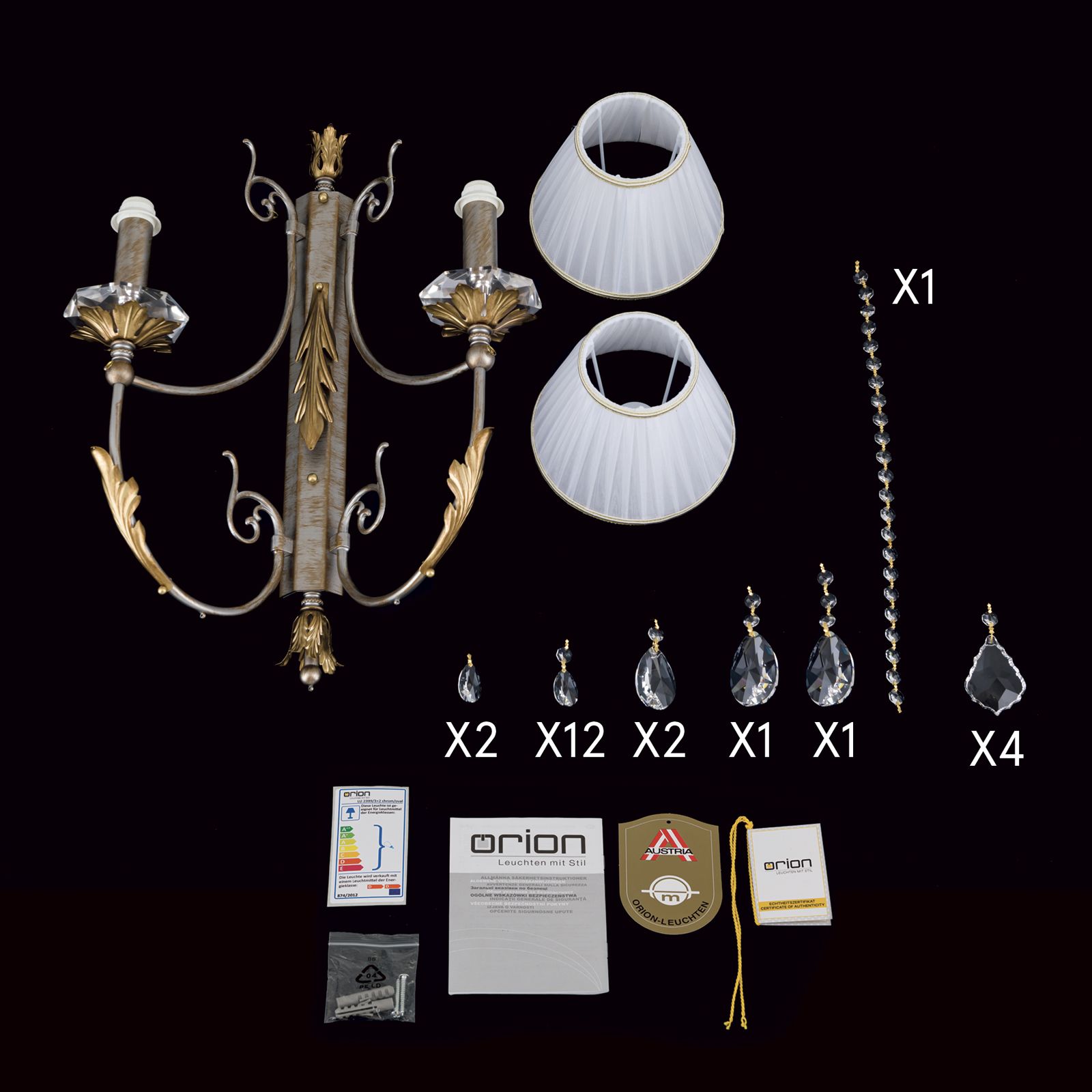 Nástěnné svítidlo ze série MIRAMARE se dvěma plameny v sobě harmonicky spojuje lehkost a eleganci. Jeho teplé bílé světlo se rovnoměrně rozprostírá přes látkové stínidlo, vytváří fascinující stínové efekty v plisované tkanině a způsobuje, že krystaly se třpytí a tančí v místnosti a vytvářejí útulnou atmosféru. Decentní, ale přesto kvalitní dekorace na ramenech lampy, která jsou zdobena listy a úponky, spolu s ručně malovaným tělem dodávají této lampě sofistikovaný nádech. Ať už je toto nástěnné svítidlo umístěno vlevo nebo vpravo od cenného starožitného nábytku nebo použito jako lákavé osvětlení v recepci či vstupní hale, vyzařuje z něj přátelská nádhera. Je vybaveno dvěma paticemi E14.