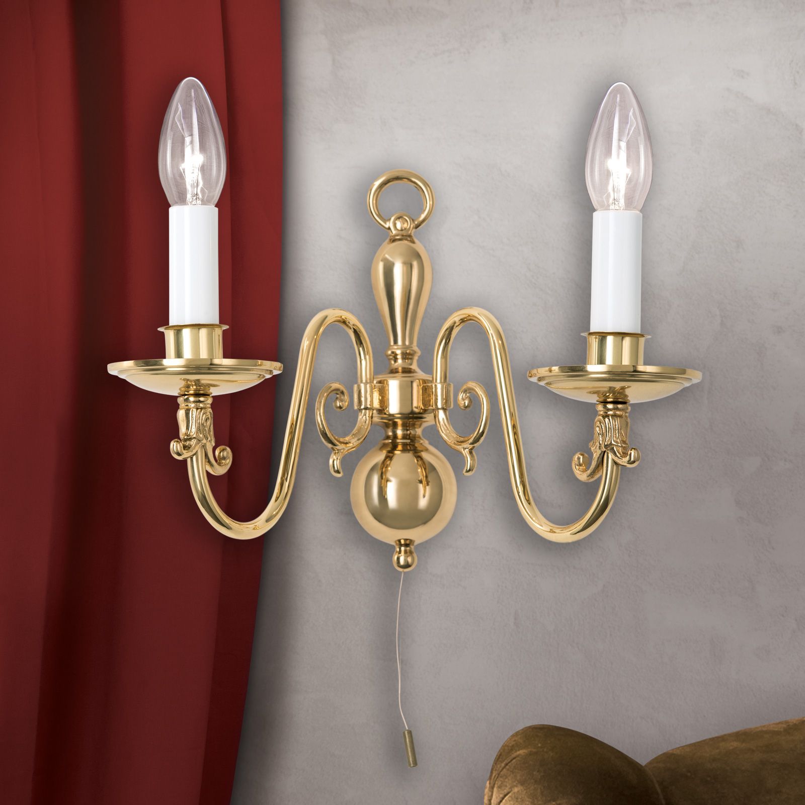 2-žárovkové nástěnné svítidlo ze série FLÄMISCH kombinuje všechny stylové prvky vlámského lustru v té nejmenší podobě. Svíčky (držáky) jsou v objímkách ve tvaru misky. Slzové misky mají jemné úponkové zdobení. Ramena lustru se otáčí klasickými S-oblouky směrem ke středu nástěnného rámu. Kulovitý a balustrový tvar hřídele vede k prstenci, který využívá prstenec lustru jako držák stropního řetězu. Lesk mosazi odráží světlo v obloucích, vypouklinách, miskách a prstenech a teplým paprskem prozáří útulný kout, měkkou pohovku nebo dobový kus nábytku. Dvě zásuvky E14 poskytují každý až 40 wattů. Dvoužárovková lampa ze série FLÄMISCH je k dispozici také v [Patina] (020.0346-05).