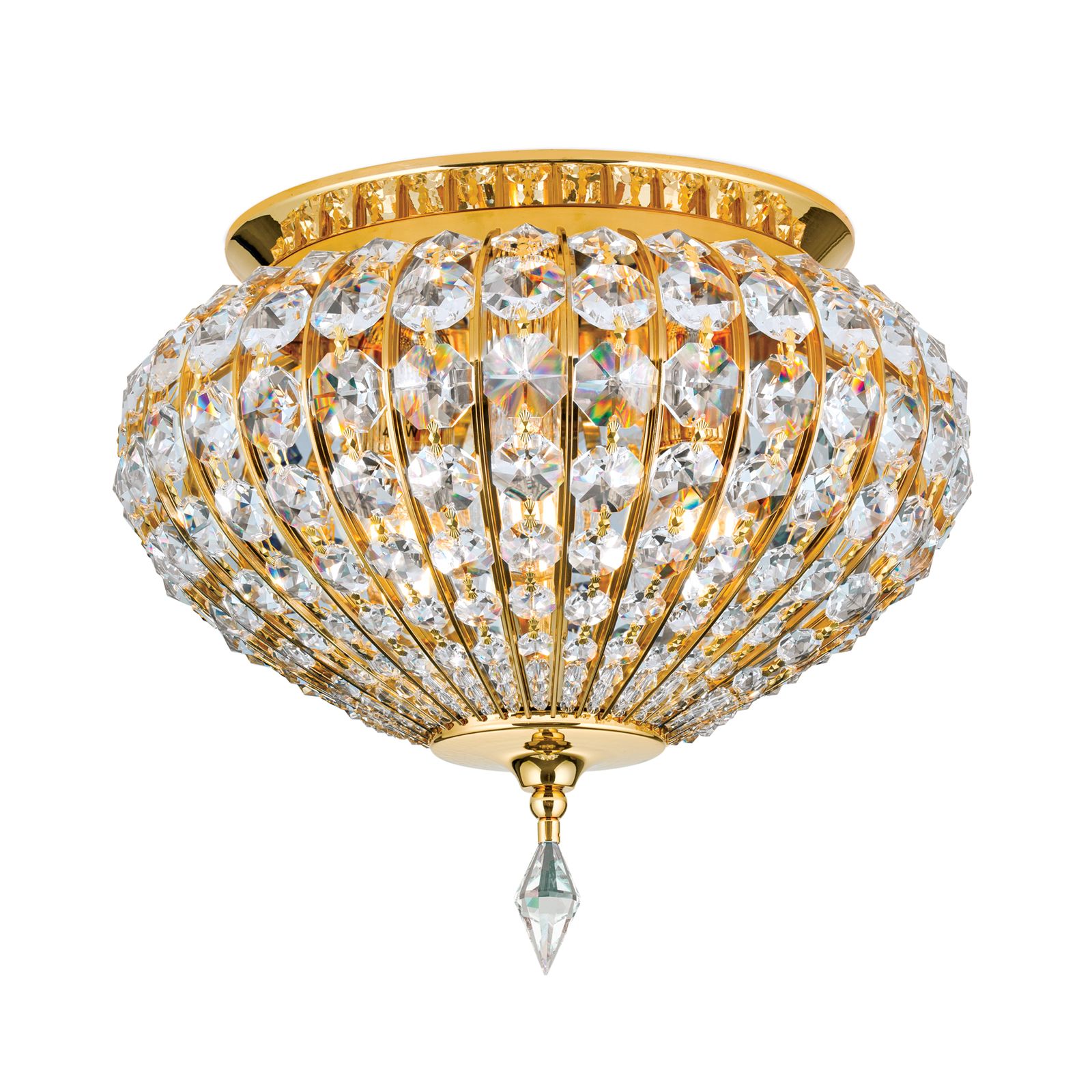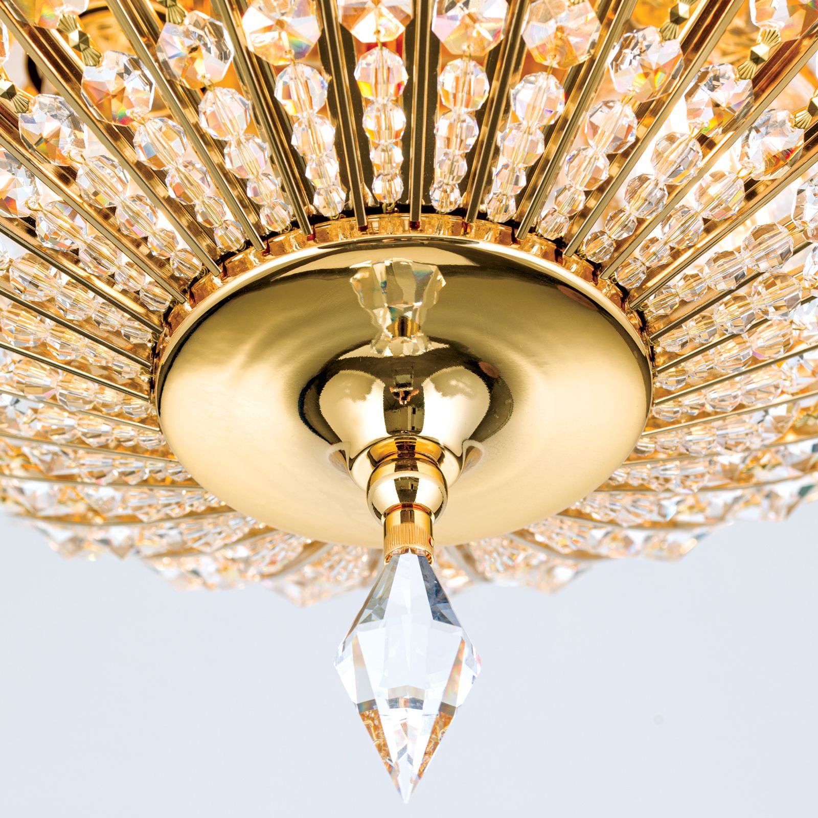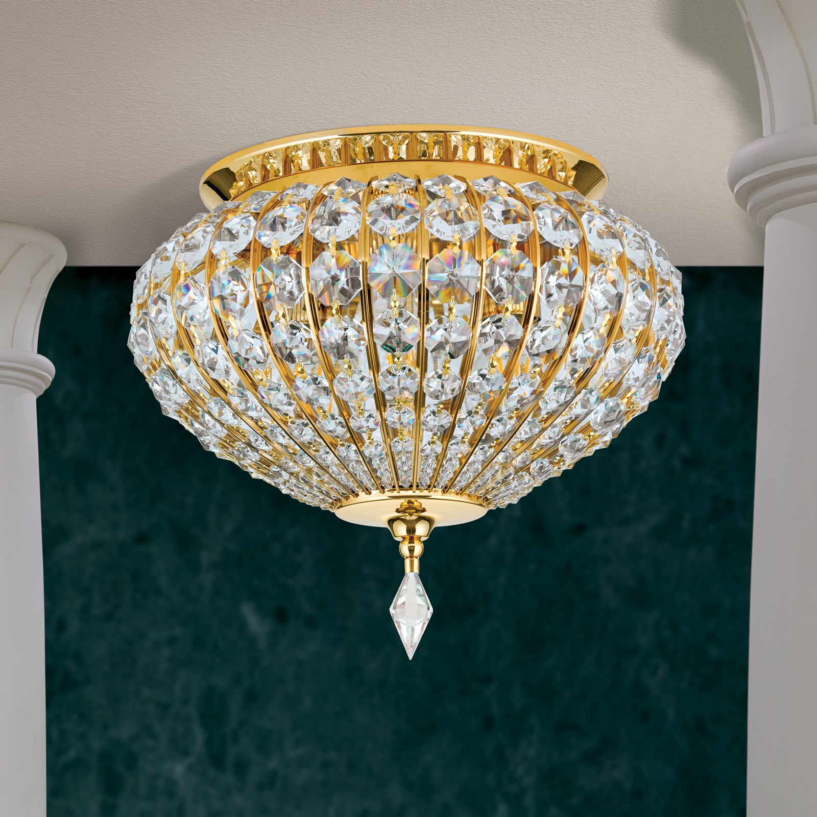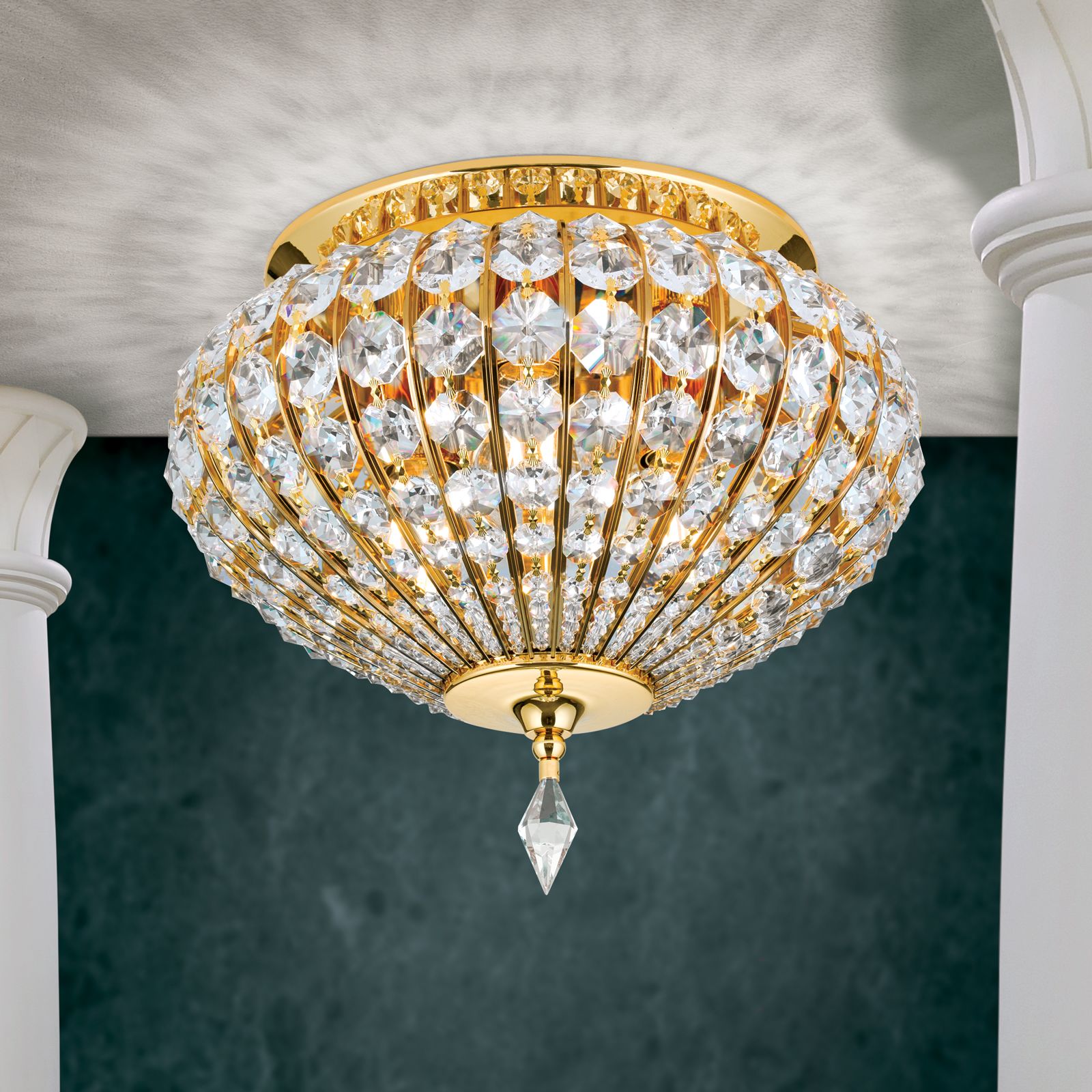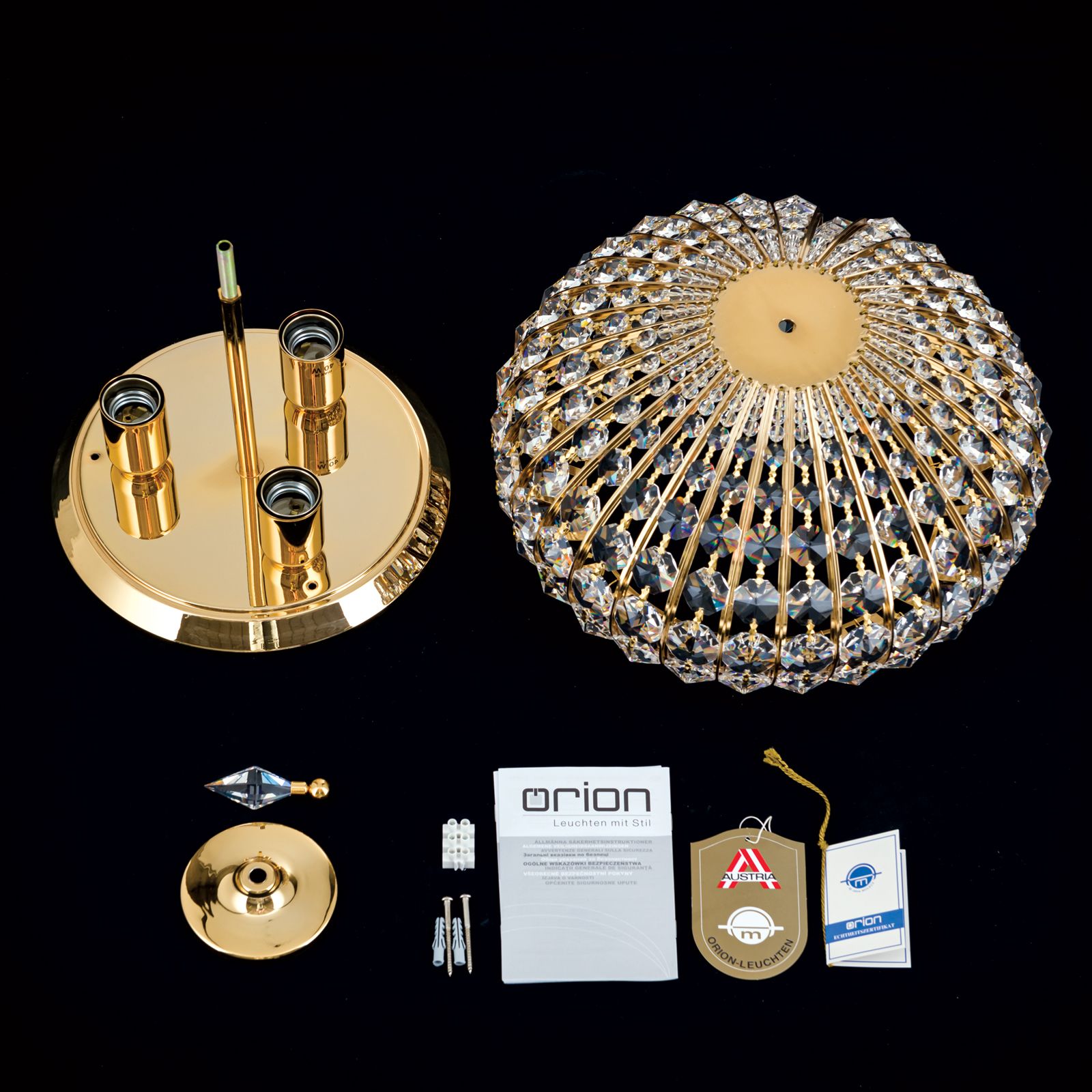 Stropní svítidlo ORIENTAL z vysoce kvalitních materiálů je elegantní a klasické v orientálním stylu. Čepice SCHÖLER CRYSTAL® a masivní mosazné díly pozlacené 24 karátovým zlatem spolu dokonale ladí a tvoří kopuli, která připomíná velkolepé orientální stavby. Možnosti využití jsou rozmanité, a tak jej lze instalovat do každého klasicky zařízeného obývacího pokoje, kde vzbudí rozruch. 3 žárovky v paticích E27 jsou ukryty za třpytivými křišťálovými závěsy. Lámáním světla vytvářejí jedinečné a působivé světelné odrazy. Stropní svítidlo je k dispozici v různých [verzích] (071.0478-021).