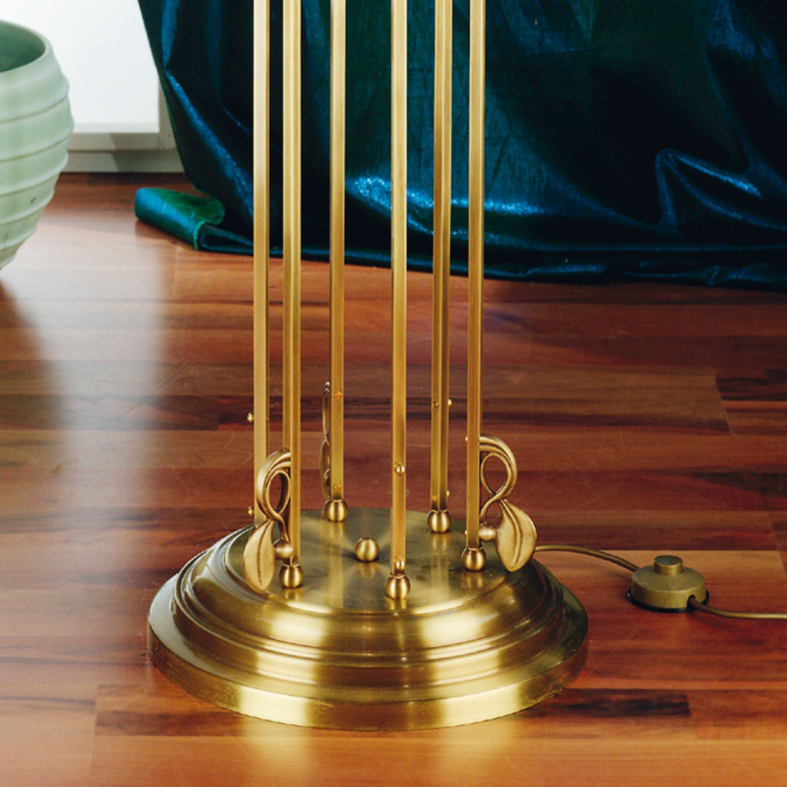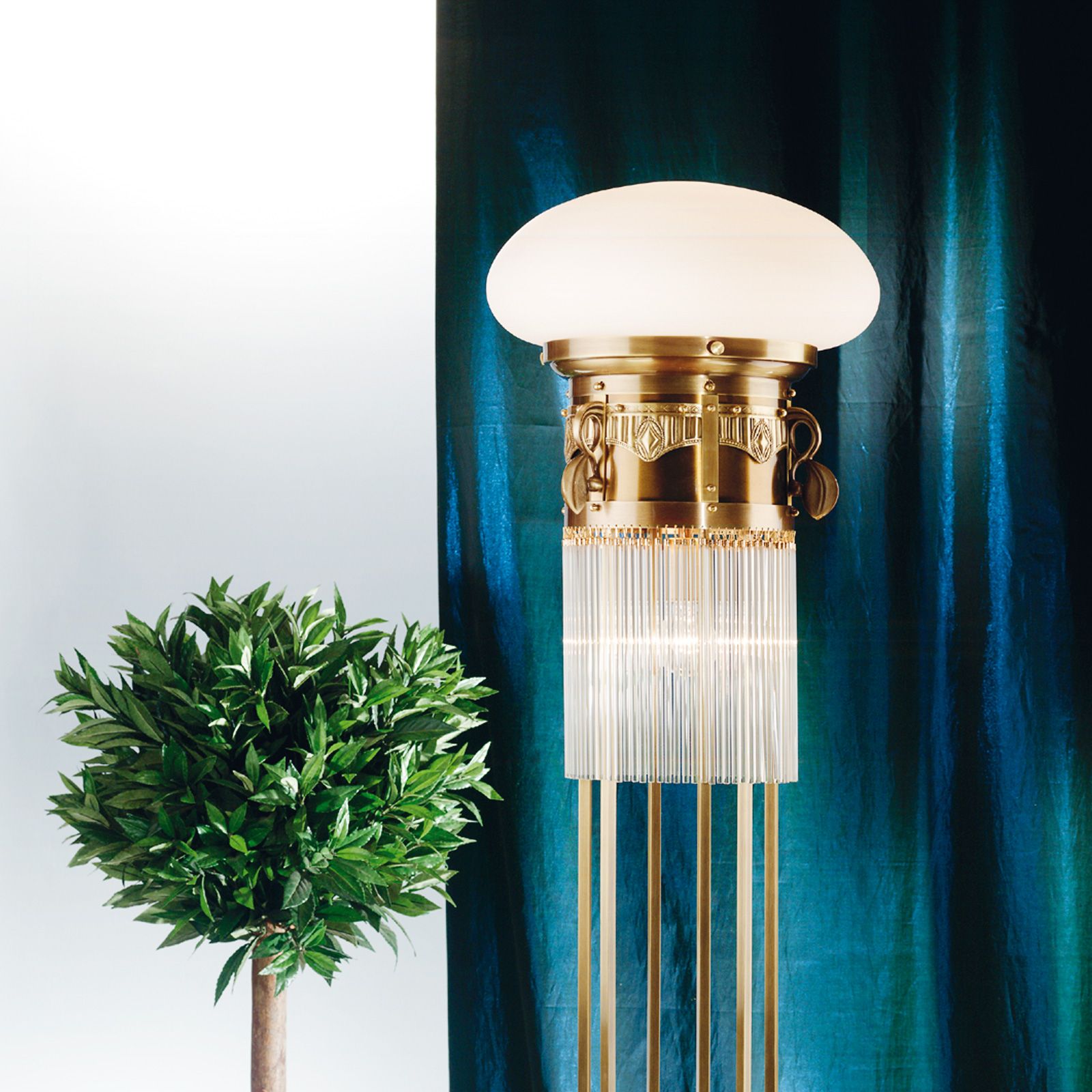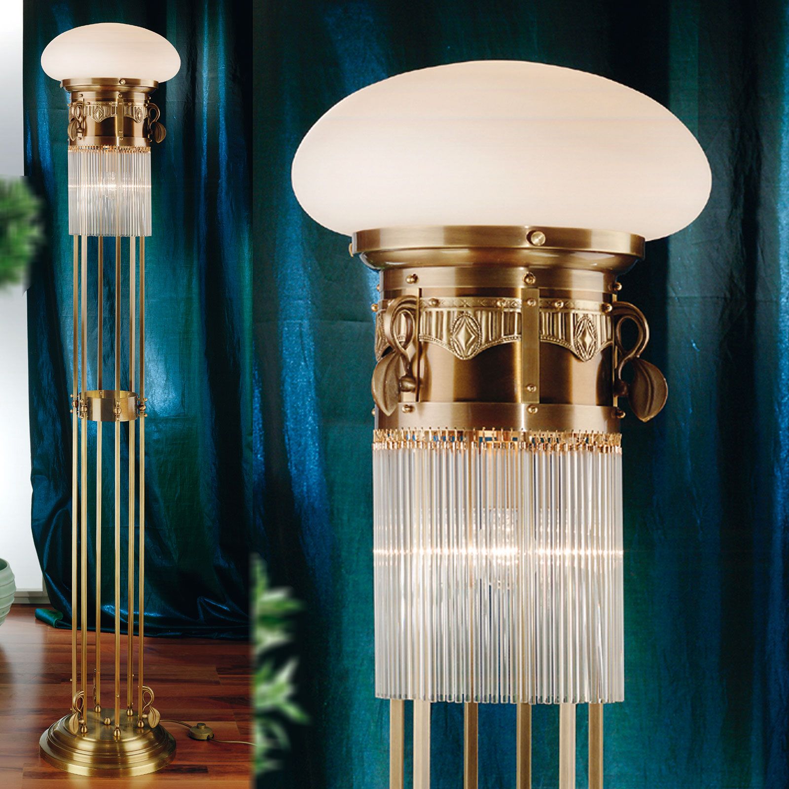 Stojací lampa je velmi nezávislý designový prvek místnosti. Je to lampa a nábytek zároveň, stabilní a mobilní, ve dne v pozadí a večer v popředí. Stojací lampa ze série ADELE také upoutá pozornost ve své třídě. Umělecká jemná struktura vytváří nádherně proporční postavu od hlavy až po základnu lampy. Z klasicky členěného základu vyrůstá šest čtvercových vzpěr. Hlavu tvoří oválné skleněné stínidlo nasazené na mosazném ozdobném pásku. Z toho světlo prší skrz pevné skleněné tyče do útulného koutu obývacího pokoje a secesního salonku hotelu. Lampa je vybavena dvěma paticemi E27, každá s maximálním výkonem 60 wattů, a je k dispozici také ve verzi [Zlato] (120.1095-04). Lze jej snadno ovládat nožním pedálovým spínačem.