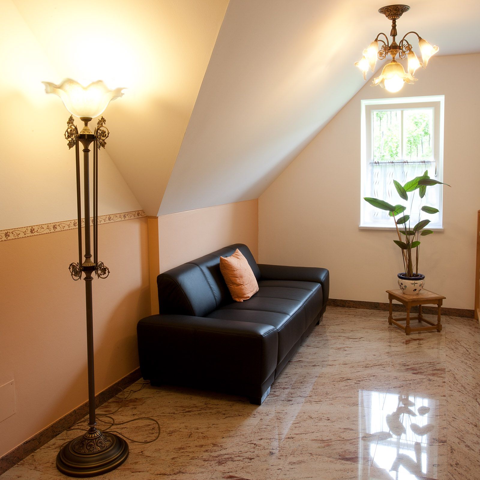 Stojací lampa z kolekce TOSCA je snovou prezentací romantiky a krásy. Drážkovaný, elegantně štíhlý sloup je lemován čtyřmi filigránovými sponami s volutami, úponky a listy. Vzestupné směřování kompozice vrcholí květinou ze saténového skla, která se otevírá směrem ke stropu. Světlo je distribuováno primárně nahoru, ale zároveň matným stínidlem vyzařuje do místnosti měkké okolní světlo. Tato stojací lampa vytváří zasněný designový akcent v souborech starožitného nábytku. Tato lampa se bude skvěle vyjímat vedle pohovky, křesla nebo v oblasti místnosti, kterou chcete obzvlášť zvýraznit. Stojací lampa má patici E27 až do 60 wattů.