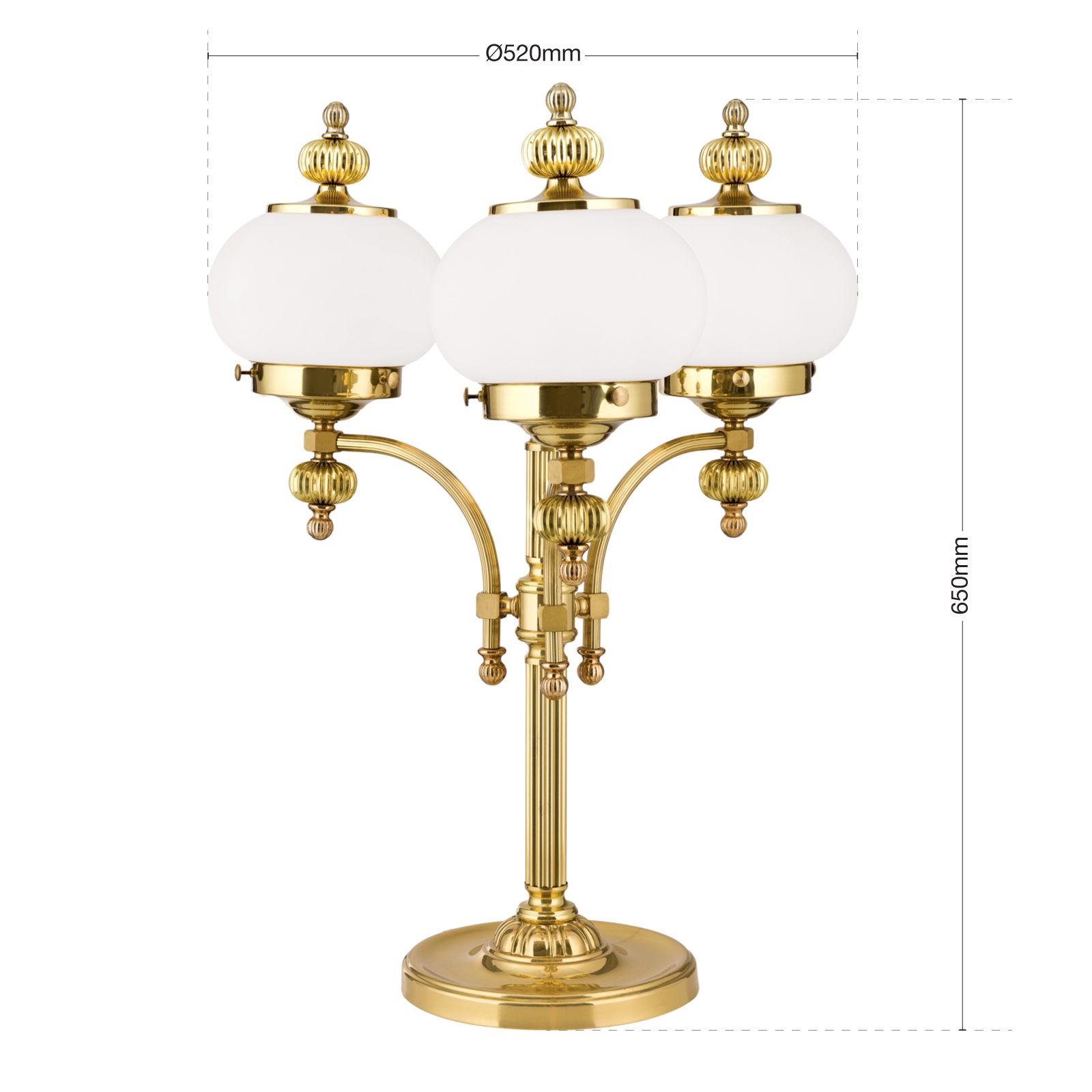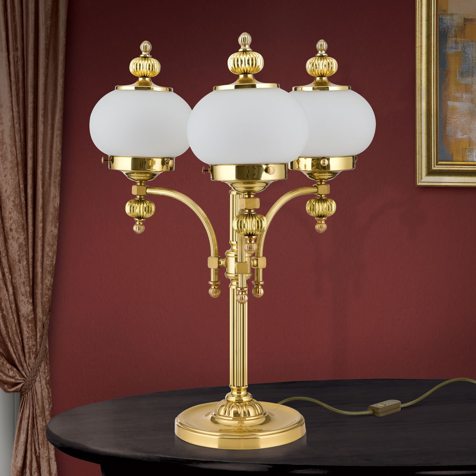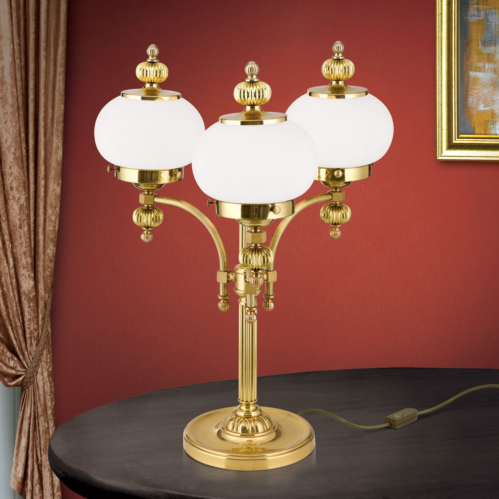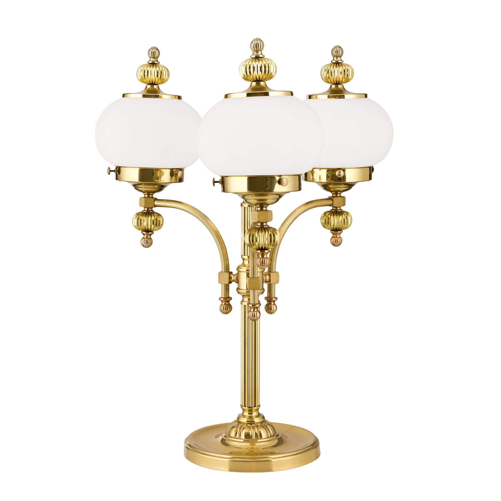 Stolní lampa WIENER NOSTALGIE, 3-žárovka, lesklá mosaz, s opálově matnými skly