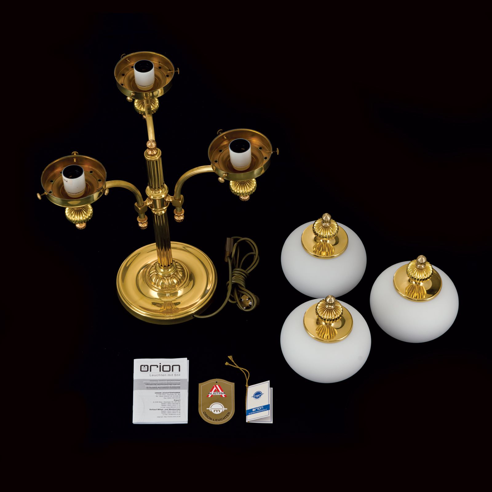 Jeden produkt ze série WIENER NOSTALGIE obzvláště vyniká: 3ramenná stolní lampa. Jestli je něco, co charakterizuje duši vídeňské kavárny, je to tento designový skvost: dokonale tvarovaná, hravá elegance, ale bez přehnaného zdobení, maximální funkčnost, půvabná zdrženlivost i přes vysoký lesk. Drážkovaný sloup drží tři široce zakřivená ramena, umělecké skládací koule tvoří konzolu kolem opálově matných odstínů. Tento skvost se bude skvěle vyjímat na malém stolku, příborníku nebo psacím stole. Lampa je vybavena třemi paticemi E27, každá s maximálním výkonem 60 wattů. Stolní lampa je alternativně dostupná v patinované verzi se stínidly šampaňské matné.