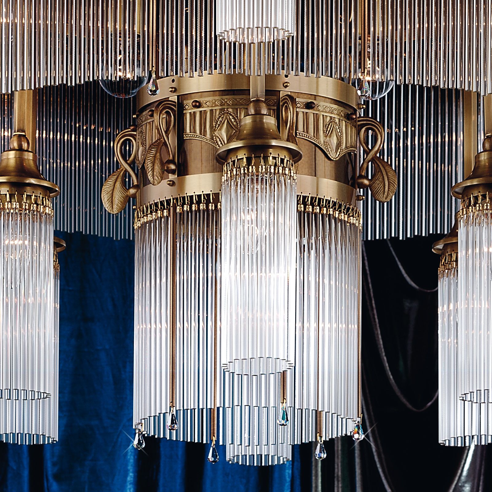 Abyste mohli zažít svou plnou nádheru, potřebuje secesní stropní svítidlo ADELE s pozoruhodným průměrem 120 centimetrů prostor k rozložení. Pokud máte to štěstí, že máte taneční sál, který si můžete říkat po svém, secesní kavárnu s velkým pokojem pro hosty, hotel s lobby pro hosty nebo obzvlášť velkou konferenční místnost, měli byste zvážit stropní lustr ze série ADELE. Tato kompozice lampy s 25 světly přitahuje každé oko. Věnec z miskovitých bordur, listoví, skleněných tyčí a mosazných dekorací se snoubí pod matným zlatým baldachýnem pod stropem. Plameny připomínají planety kroužící kolem působivého středu světla pod oblohou. Lampa má osmnáct patic E14 s maximálním příkonem 40 wattů a sedm až 60 wattů každá.