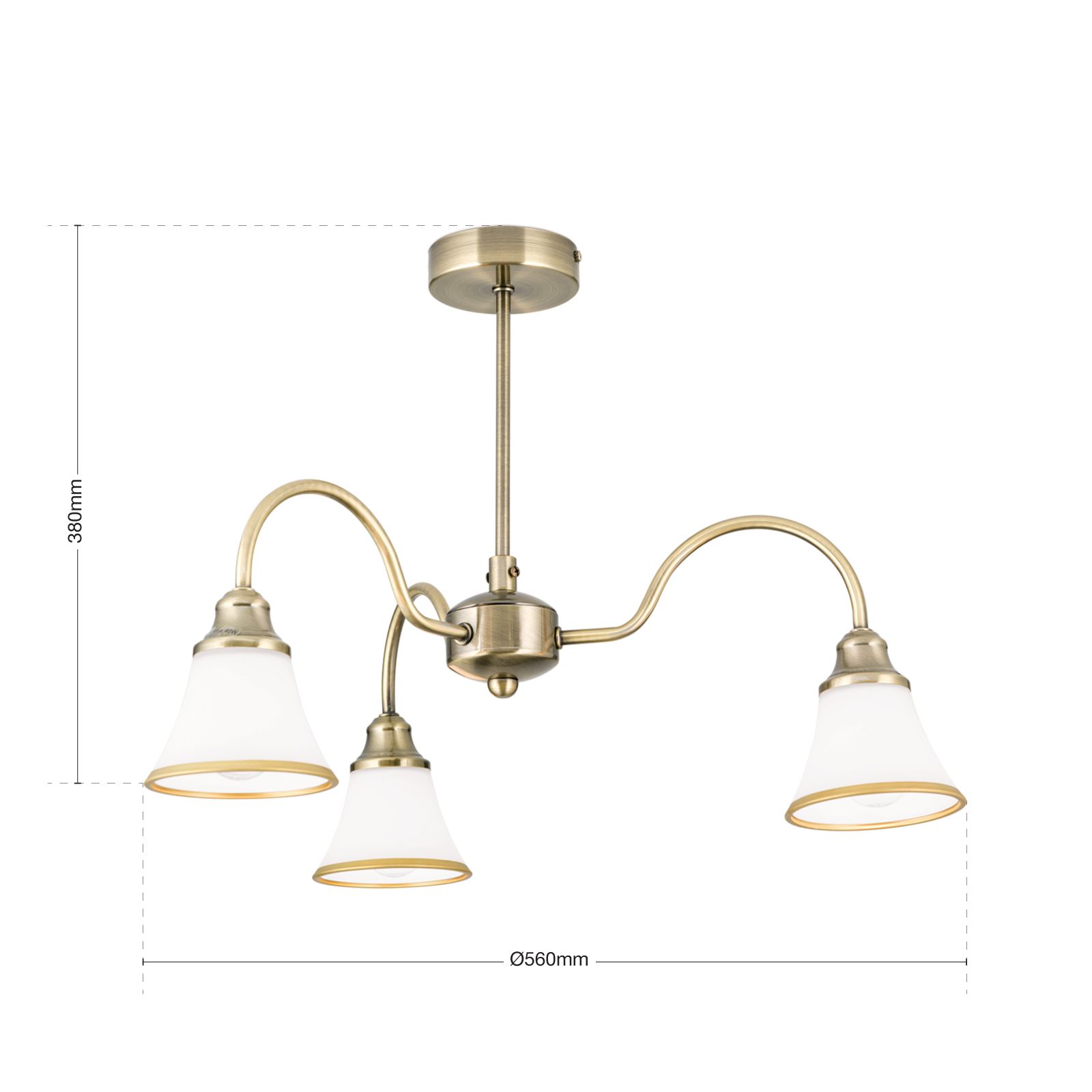 3-žárovkový lustr MAJA zajistí dobré osvětlení každého místa. Stínidla jsou podpořena zakřivenými rameny z matné mosazi, která vyzařují světlo dolů. Opálové matné sklo stínidel zaručuje příjemné a neoslňující světlo. Design završuje patinovaný povrch, který zdobí i spodní okraj skleněných stínidel. Lustr o celkové výšce 38 cm a průměru 56 cm je vybaven třemi paticemi E14 a lze jej osadit maximálně 40 watty na jednu patici. Pro energeticky úsporné základní osvětlení se doporučuje použití úsporných LED diod ve tvaru kapky. Perfektním doplňkem je stmívač s fázovým řízením, pomocí kterého lze stmívat závěsné světlo a vytvářet různé světelné nálady.