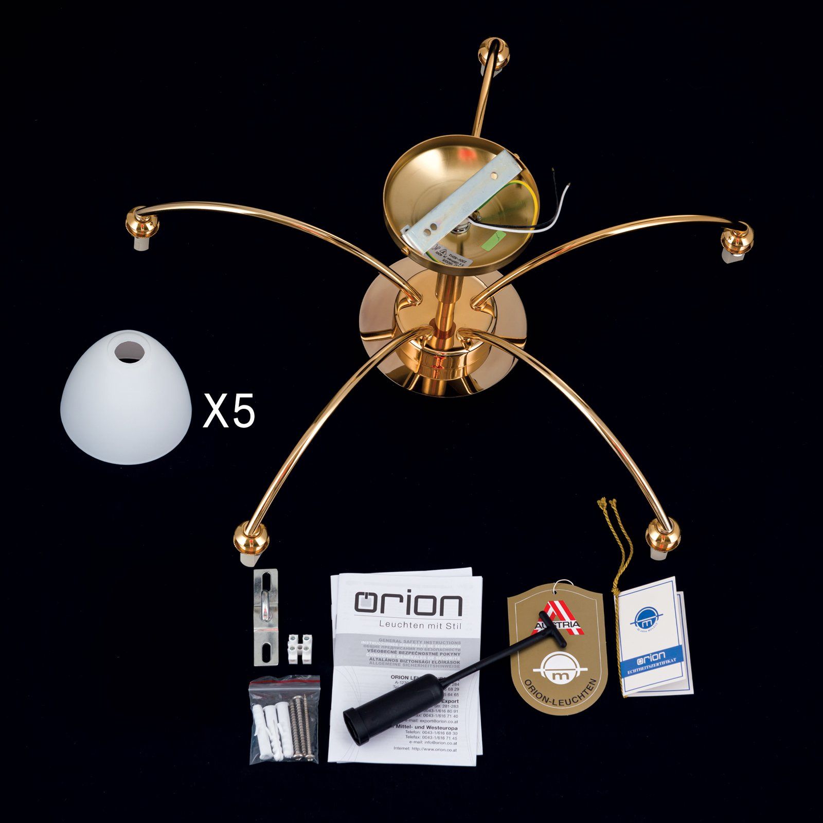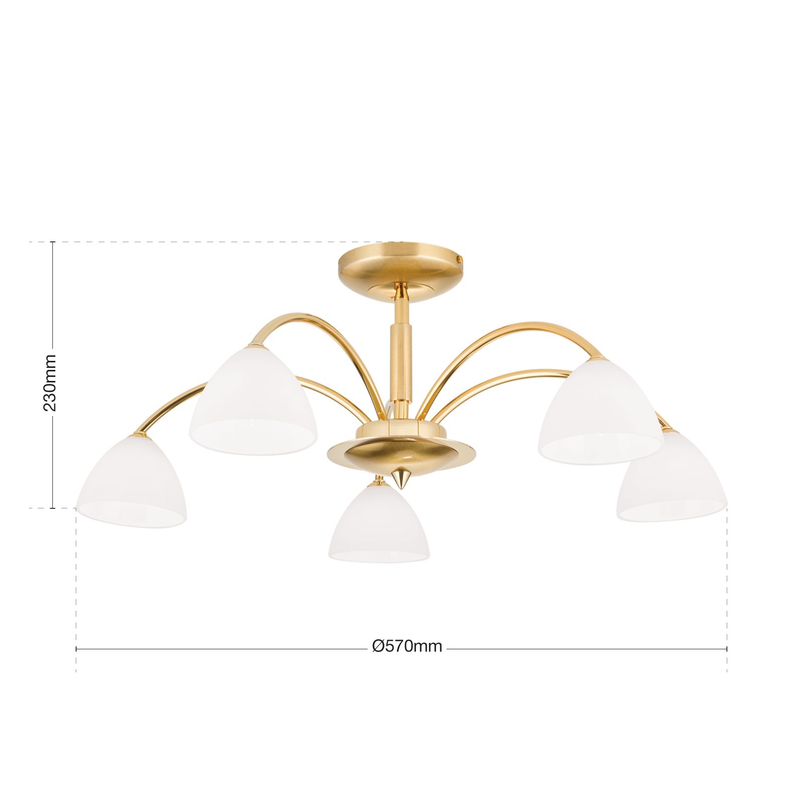 Stropní svítidlo z rodiny osvětlení OPALDESIGN lze díky svému funkčnímu vzhledu snadno integrovat do místností s moderním nebo klasickým prostředím. Stínidla směřující dolů jsou vyrobena z opálového matného skla, svítidla jsou z mosazi a mají povrchovou úpravu ve zlaté nebo saténové barvě. Stropní svítidlo je vybaveno 5 zásuvkami G9 a může být vybaveno maximálně 40 watty na zásuvku. Jemný oblouk ramen lampy se odráží ve skleněných stínítkách, které jemně rozptylují světlo a přispívají k útulnému základnímu osvětlení v kuchyni, jídelně, obývacím pokoji nebo předsíni. Je k dispozici také ve verzi s [7 plamenů] (012.1600-08).