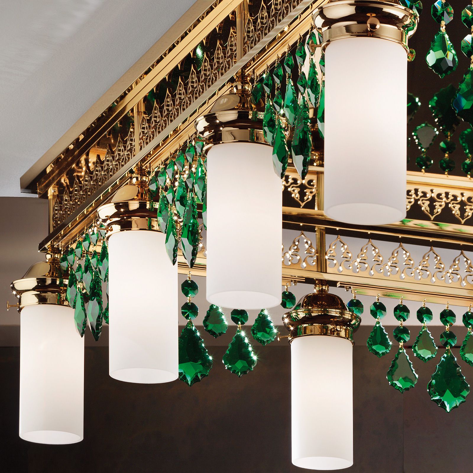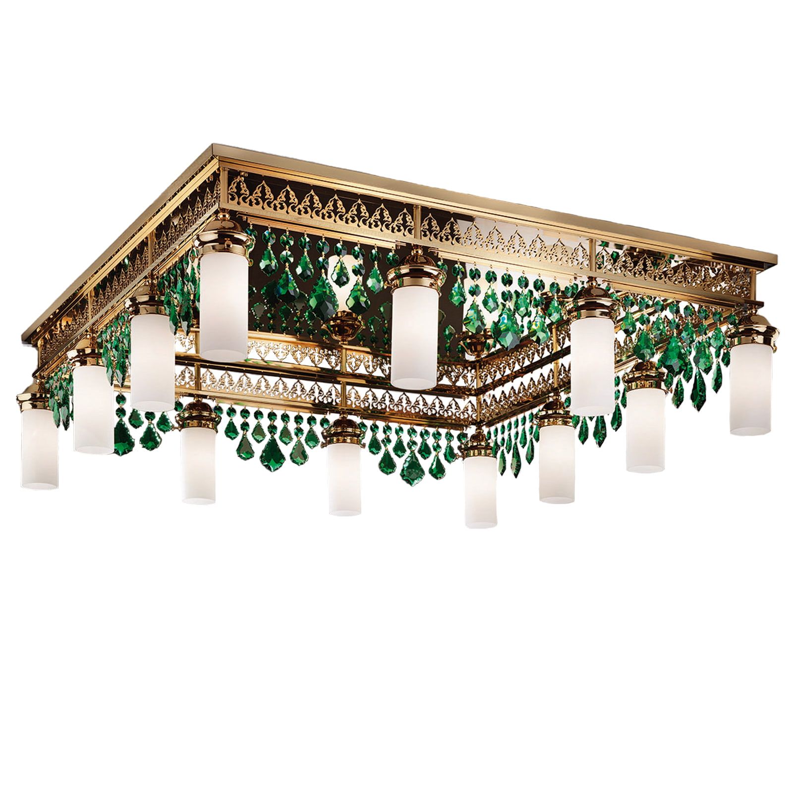 Stropní lustr ORIONtal, 12 plamenů, zlatý, se zelenými křišťálovými kyvadly