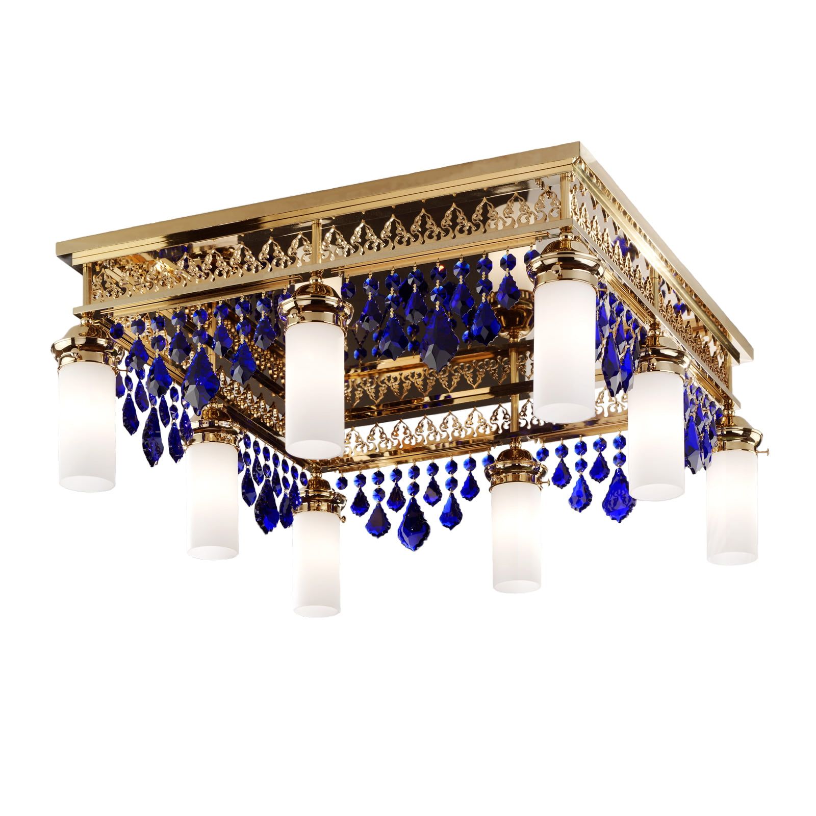 Stropní lustr ORIONtal, 8-ti žárovkový, zlatý, s modrými křišťálovými kyvadly