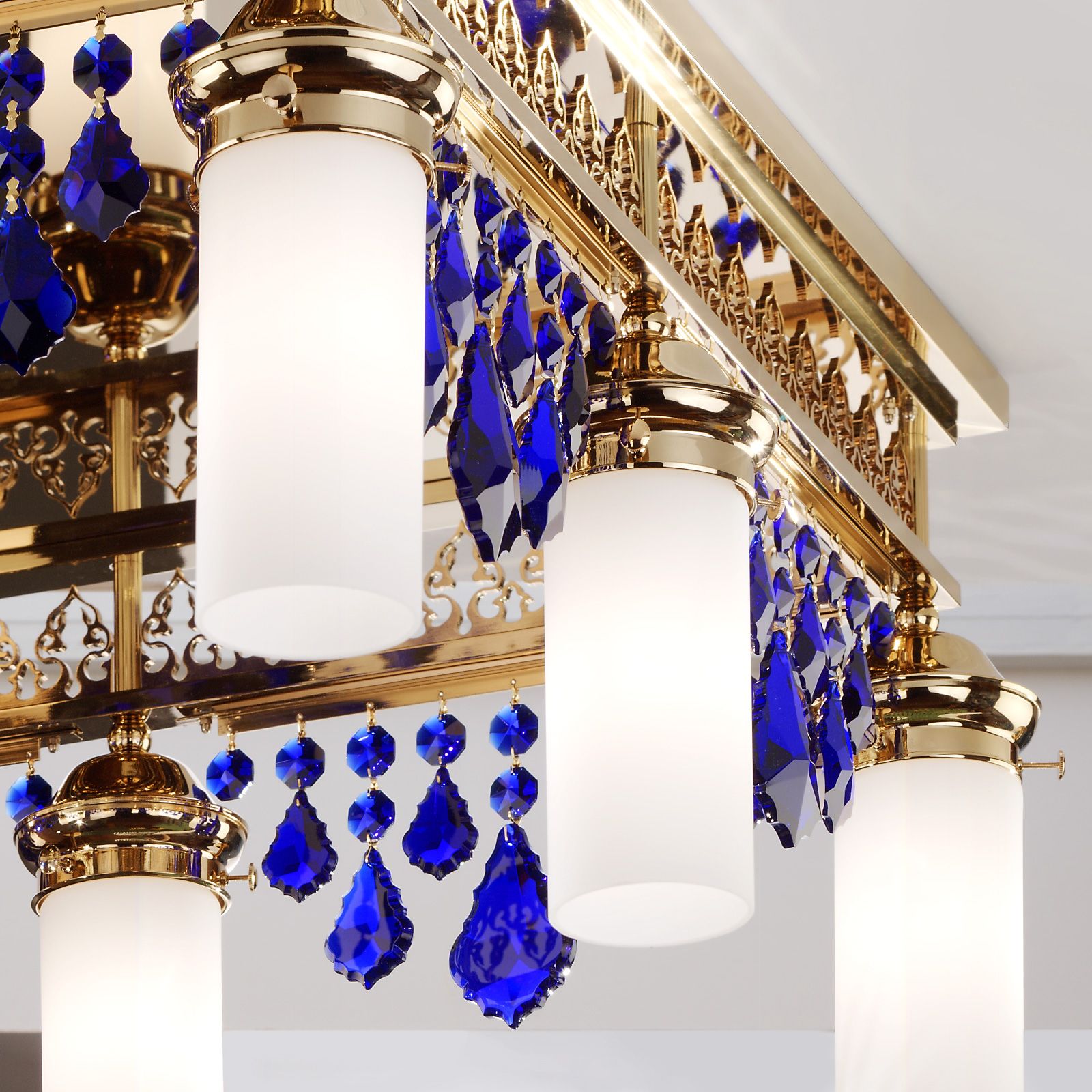 Kolekce ORIONtal přináší orientální nádheru do vašich čtyř stěn. Stropní lustr s 8 plameny z této série ohromuje naprostou sbírkou nádherných prvků: 24 karátové pozlacené zrcadlo, pozlacené lemování, opálově modré krystaly v závěsné a finální verzi, opálové matné skleněné stínítka. Díky vysoké kvalitě zpracování si tento šperk mohou užívat celé generace. Toto závěsné světlo může zaplavit obývací pokoj v moři modrého světla. Křišťálovou stěnou se třpytí zlaté hřebeny vln, měkké světlo osvětluje i velké obytné prostory. Díky stmívatelnosti lze modlitebny nastavit do různých světelných nálad. Světlo má osm patic E27, každá s maximálním výkonem 60 wattů. Lampa je k dispozici také ve verzi [3 žárovky] (012.1705-04) a [20 žárovek] (012.1704-39).