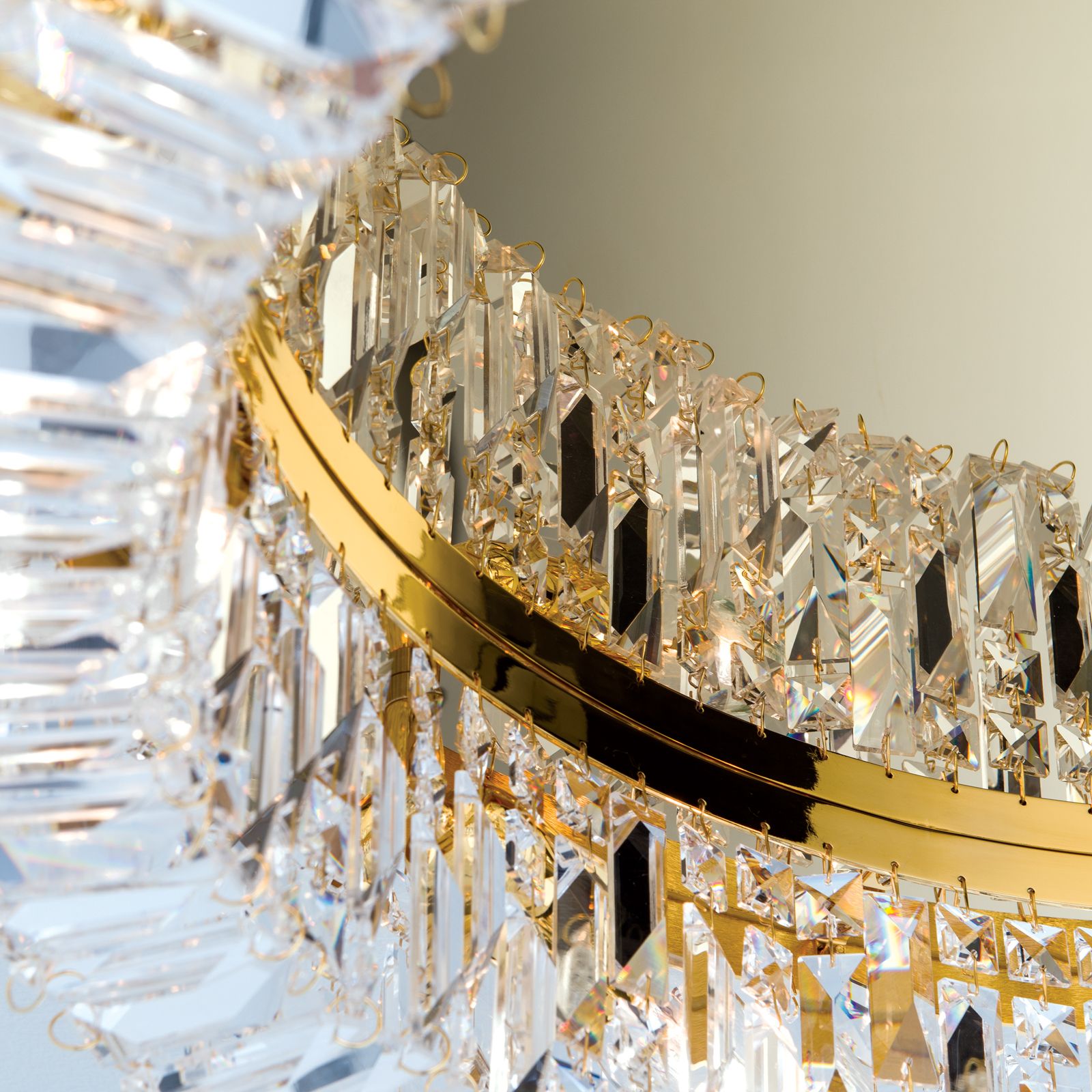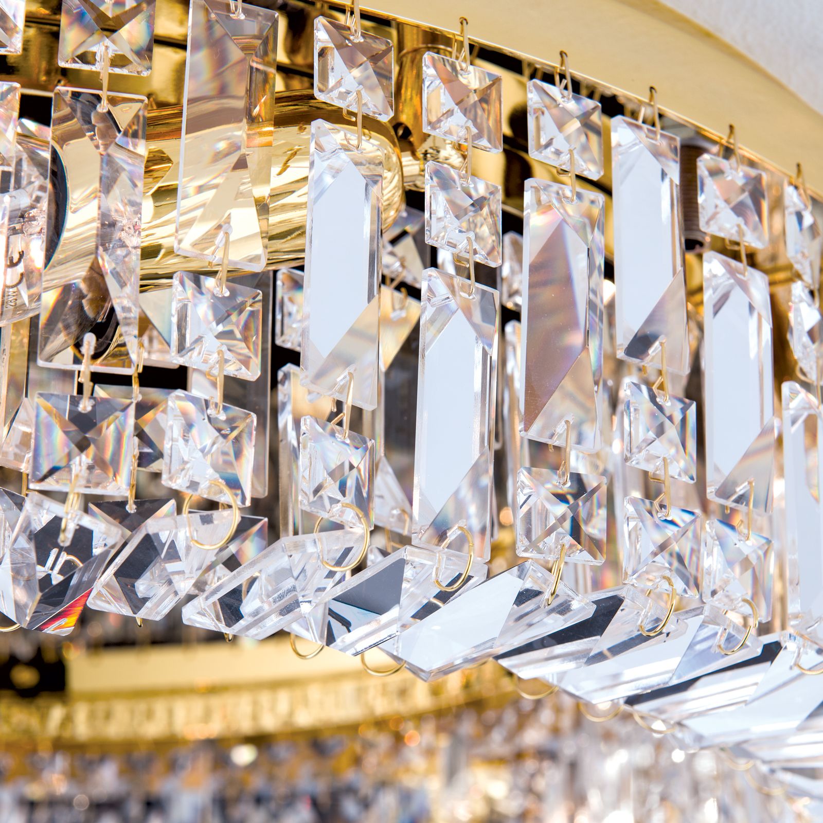Stropní svítidlo ze série RING vyzařuje moderní šmrnc a lze jej použít různými způsoby. Nic nestojí v cestě jeho instalaci v ložnici, obývacím pokoji, jídelně nebo dokonce ve vstupním prostoru a zajišťuje brilantní osvětlení. Kombinace chromovaného mosazného rámu s čirými krystaly SCHÖLER CRYSTAL® se skvěle doplňují a dělají z lustru extravagantní zařizovací prvek. Četné křišťálové hranoly zapůsobí jak při zapnutí, tak při vypnutí a vytvářejí nádherné odlesky. Je vybavena 6 zásuvkami E14, může být vybavena maximálně 40 watty. Lustr o průměru 60 cm má výšku 14 cm a je tak ideální do místností s nízkou výškou stropu. Lampa je dostupná v chromové a zlaté verzi.