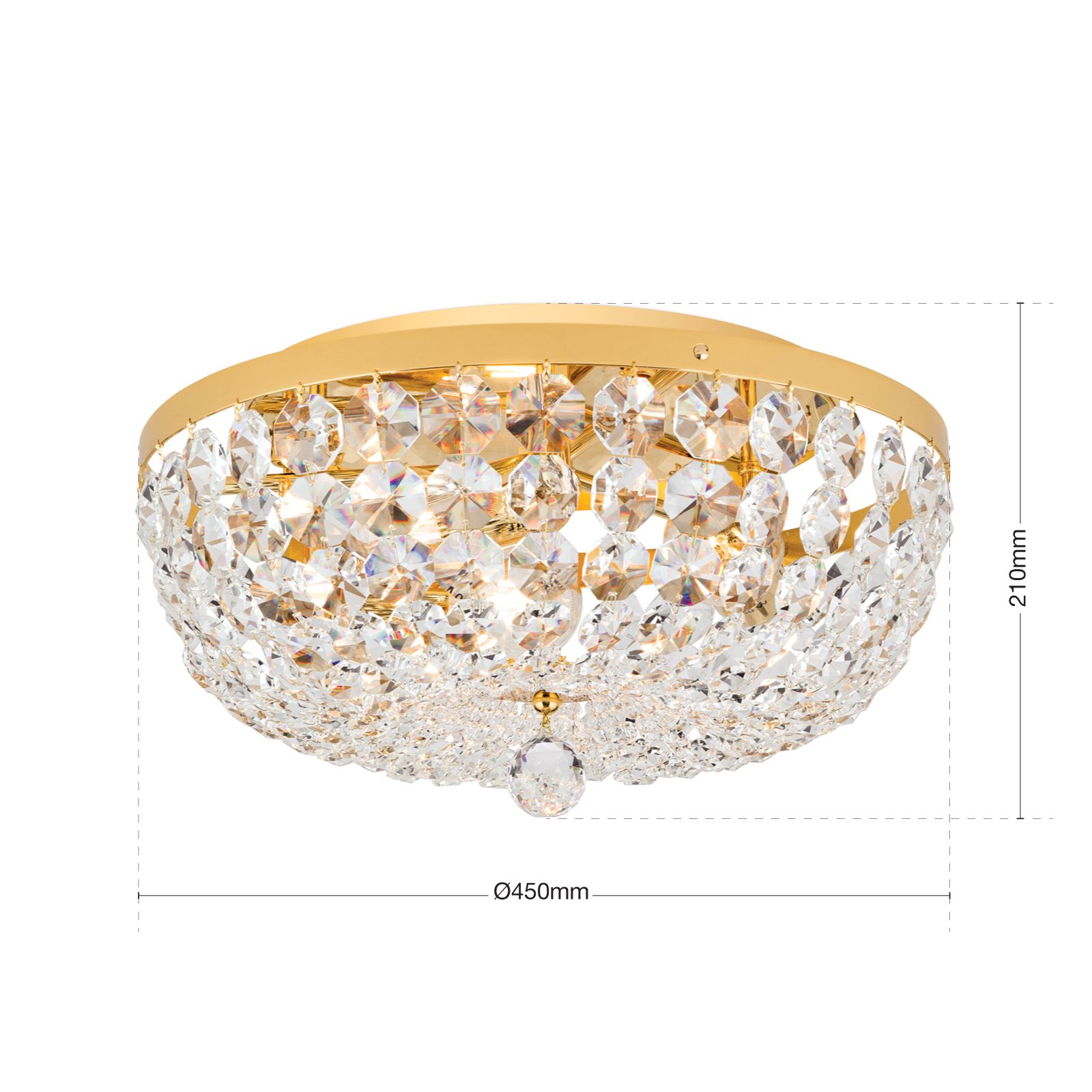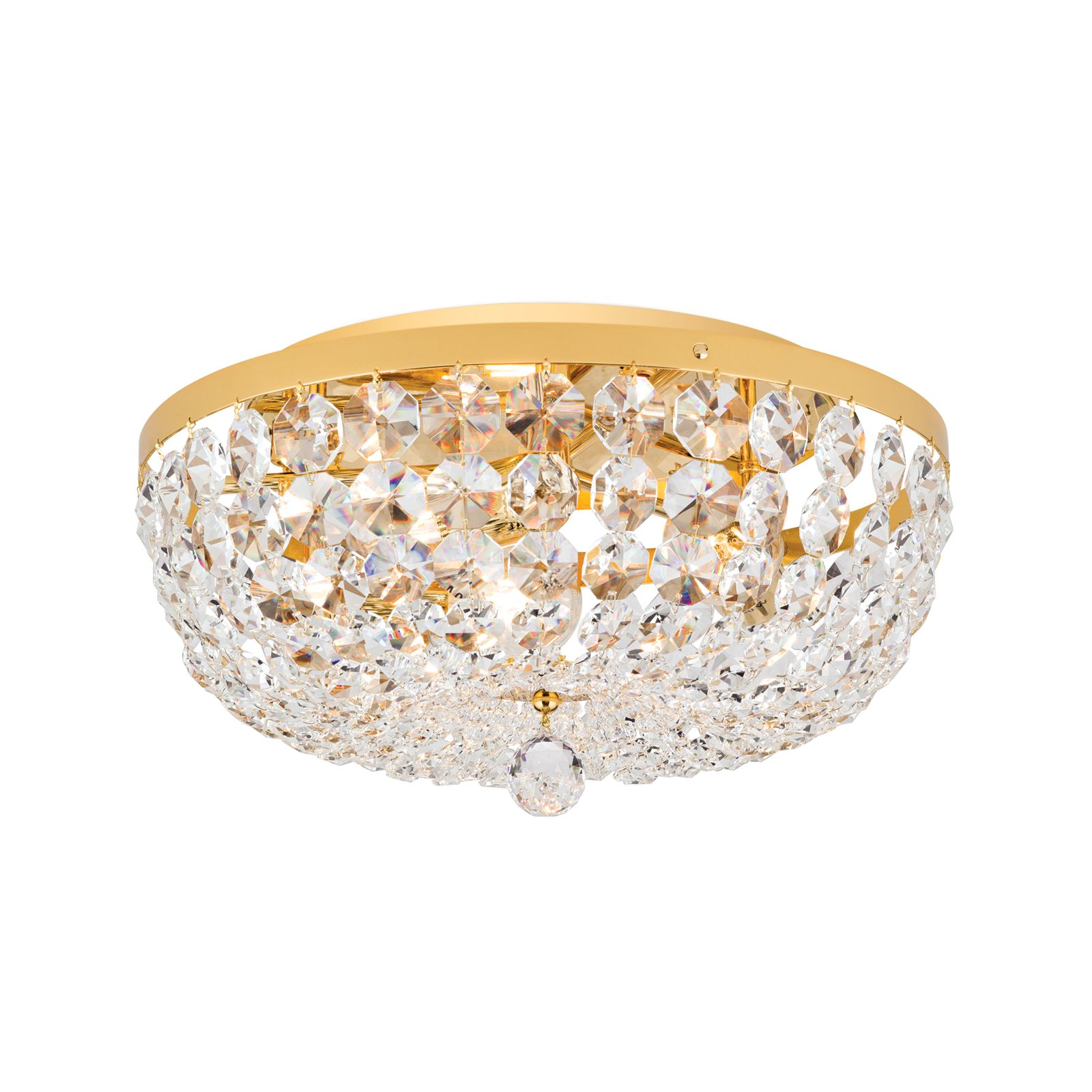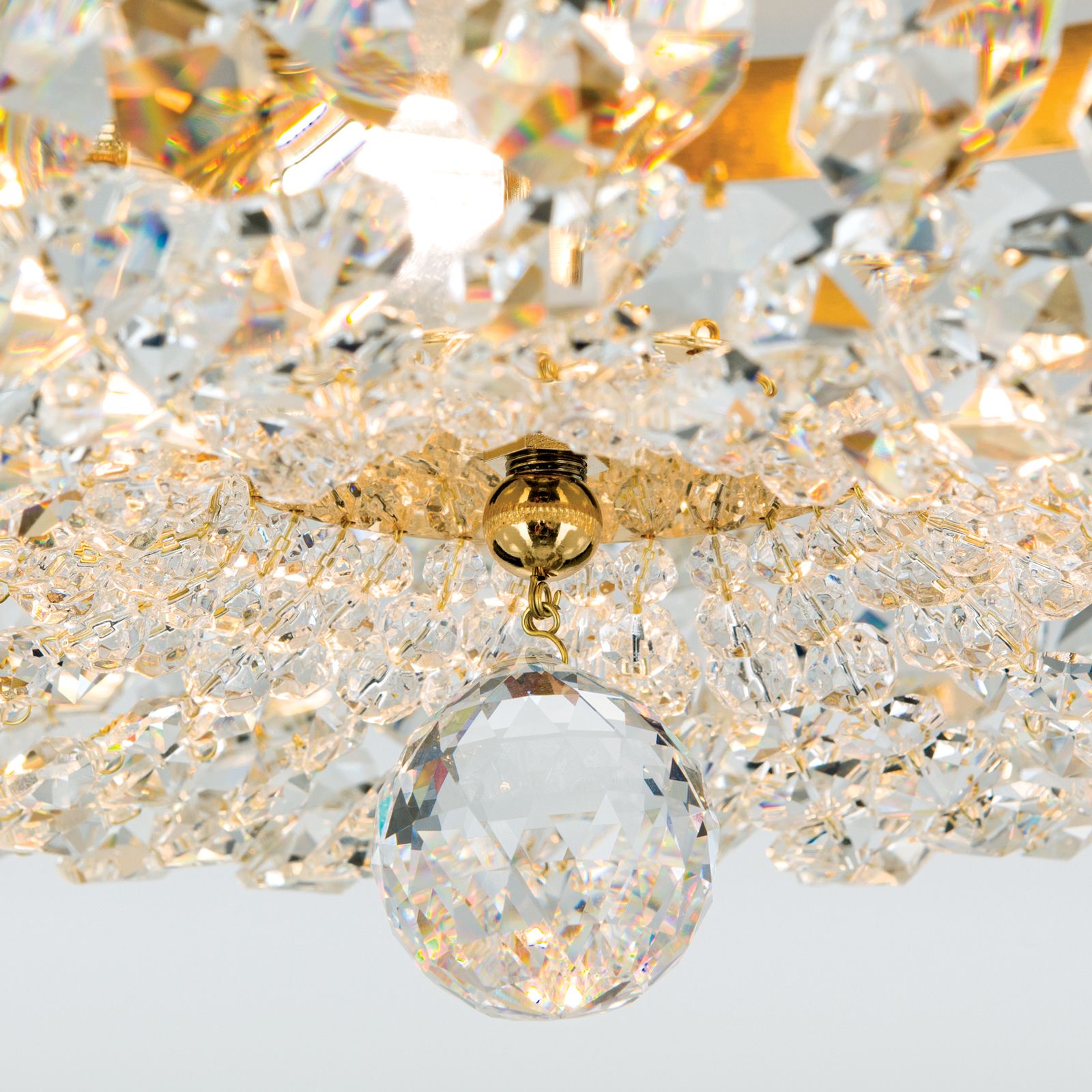 Vysoce kvalitní materiály jako mosaz a kvalitní krystaly od Schöler charakterizují stropní lustr SHERATON, který je stejně jako celá stejnojmenná série ručně vyráběn v továrně na osvětlení ORION ve Vídni. Skvěle se hodí do klasicky zařízených interiérů s luxusním nábytkem v soukromých i komerčních prostorách a ponoří místnost do třpytivého moře světel. Četné krystaly SCHÖLER CRYSTAL® vytvářejí jedinečnou jiskru, která je umocněna lesklým 24 karátovým zlatem. Stropní lustr o průměru 45 cm a výšce 21 cm je vyroben z masivní mosazi. K nenápadnému kovovému kroužku jsou připevněny řetízky vyrobené z býků, které se sbíhají a tvoří uprostřed fasetovanou křišťálovou kouli. 3 zásuvky E27 lze provozovat s maximálním výkonem 60 wattů na zásuvku a jas lze regulovat pomocí stmívače. Stropní lustr SHERATON je k dispozici s různými průměry.
