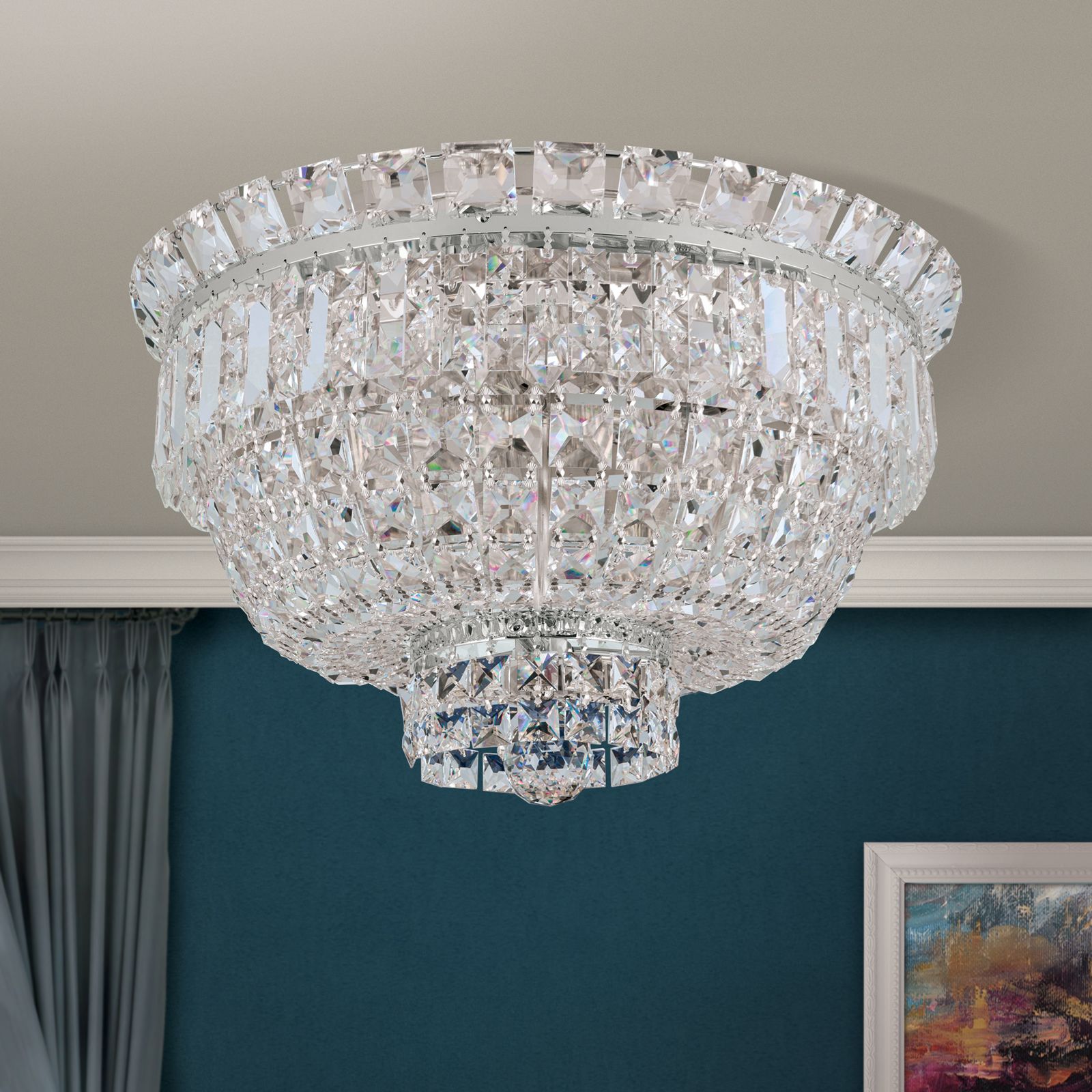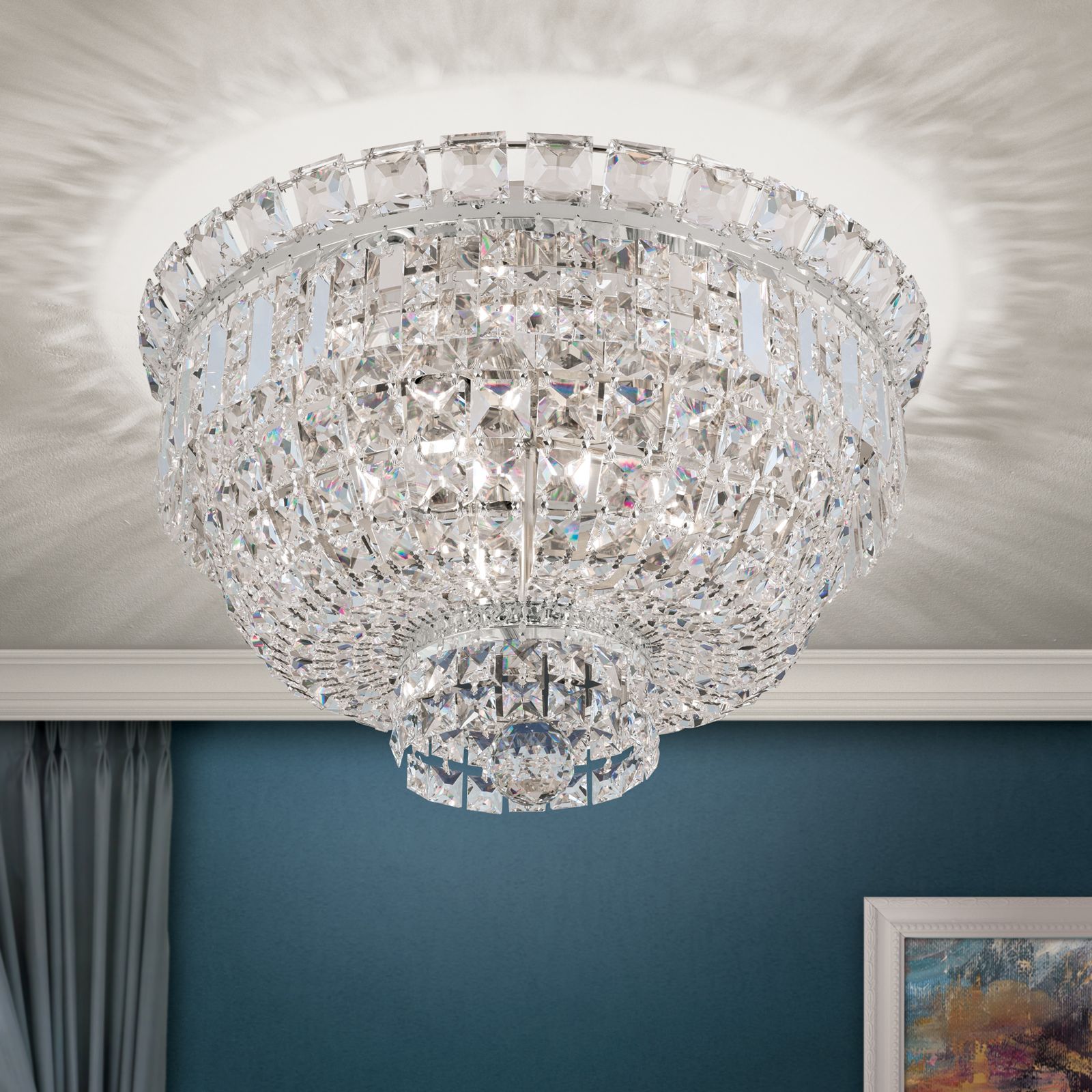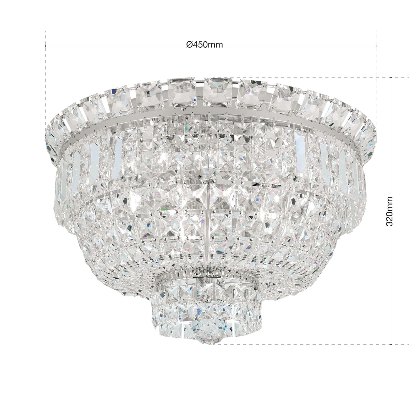Moře křišťálů dělá ze stropního lustru AMBASSADOR skutečný šperk ve vašich čtyřech stěnách. Ať už je instalován ve vstupním prostoru, v obývacím pokoji nebo v jiné místnosti, nádherně osvětlí požadovaný prostor a poskytuje jedinečné odrazy světla. Nespočet hranolů a čtvercových kamenů vyrobených z krystalů STRASS® Swarovski® Crystal se uprostřed sbíhá a tvoří menší křišťálový věnec, který má uprostřed elegantní křišťálovou kouli. Rám je vyroben z pochromované masivní mosazi a lesklý povrch dodává další jiskru a lesk. Žárovky ve 3 paticích E27 jsou zcela skryty za křišťálovými řetězy a mohou být vybaveny maximálně 60 watty. AMBASSADOR je k dispozici v chromu a 24 karátovém zlatě.
