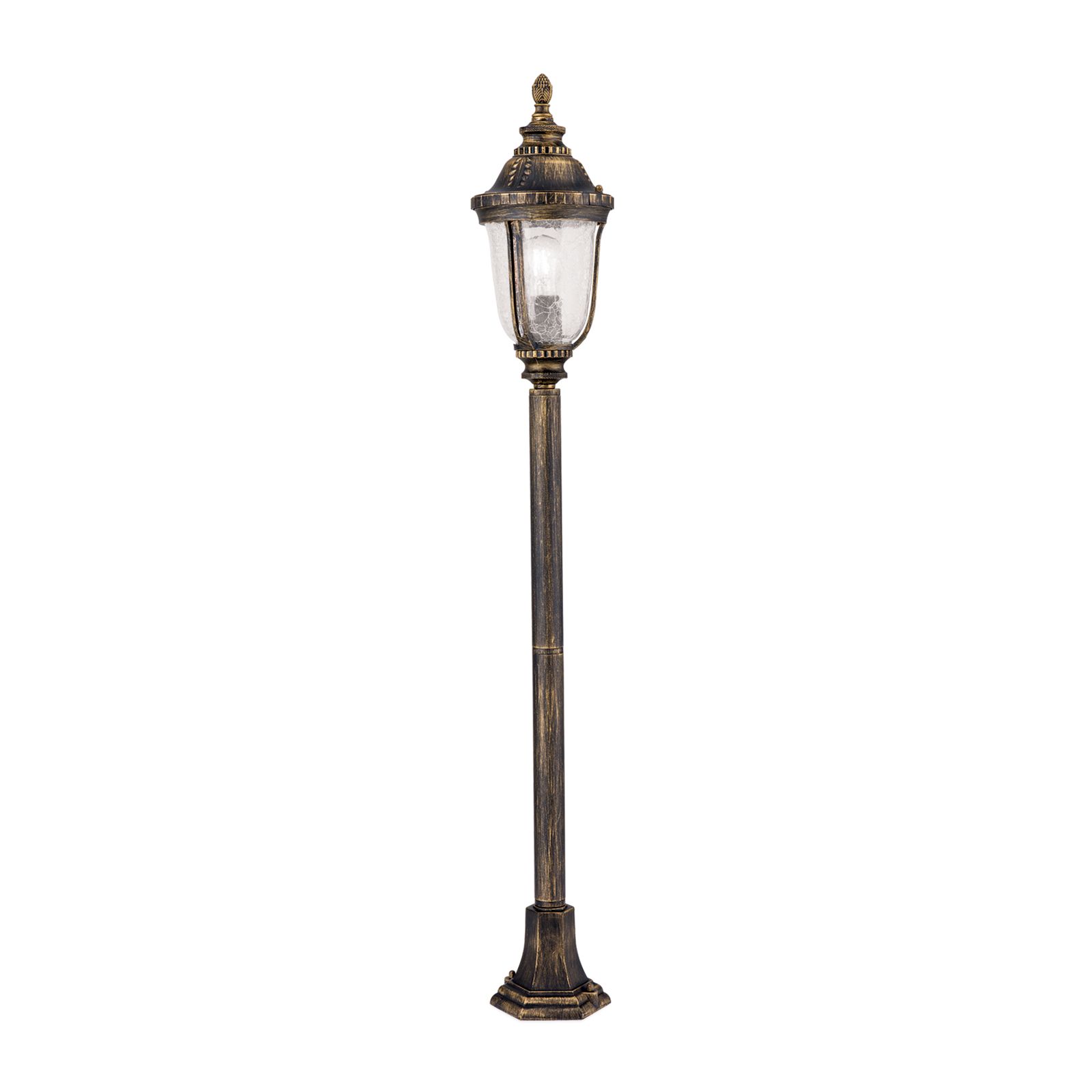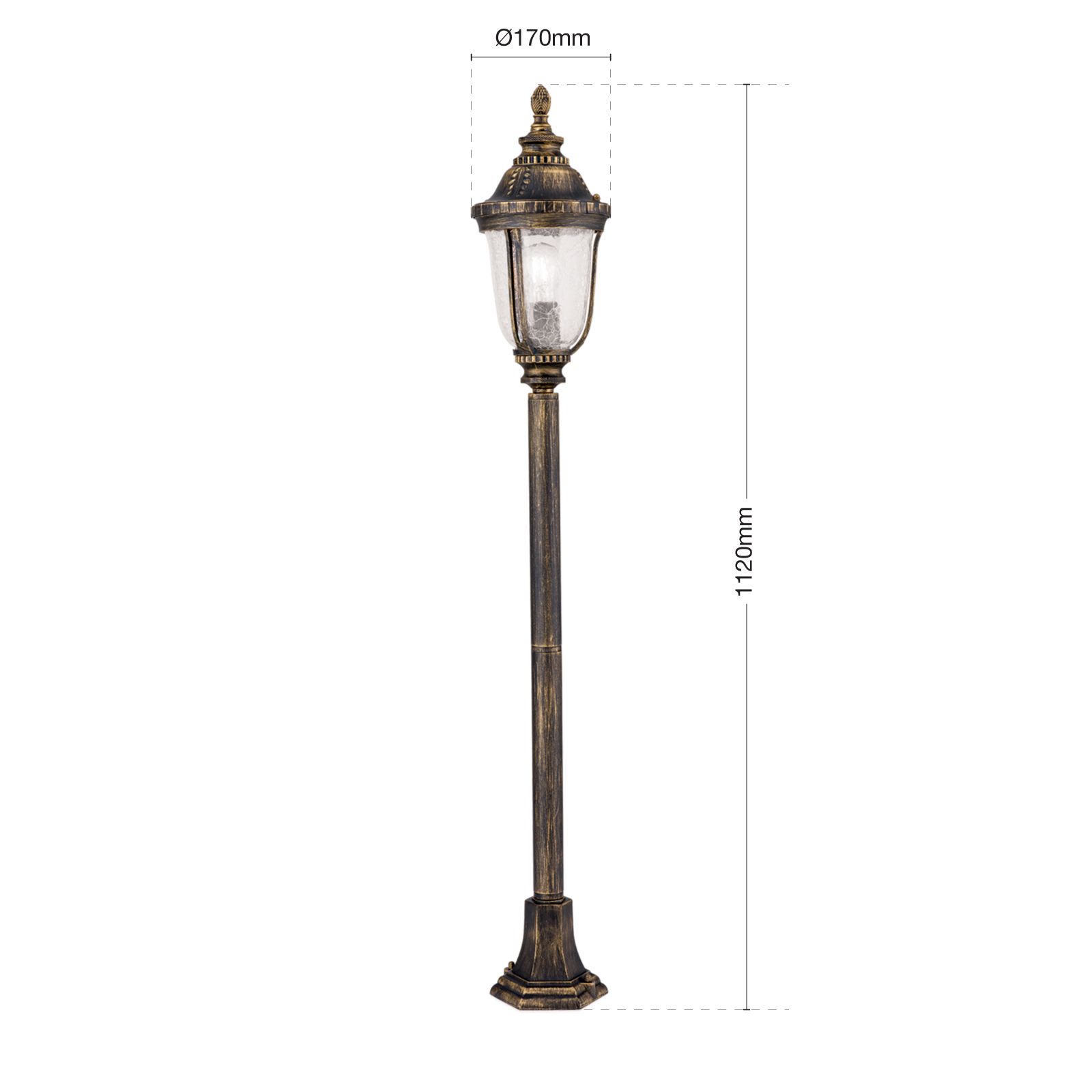 Romantická, nostalgická série venkovních svítidel AUGUST obsahuje kromě tyčových, základnových, nástěnných a závěsných svítidel také elegantní světlo na cestu. Umístěný podél štěrkové cesty nebo zahradní cesty poskytuje nejen důležité orientační světlo ve tmě, ale také vytváří elegantní a romantický nádech. Četné dekorativní prvky, jako jsou flétny, polní vlysy a šiška korunující lucernu, spolu se stínítkem lucerny z vlnitého skla a povrchovou úpravou patinovanou barvou, zajišťují její starožitný vzhled. Objímka E27 vám umožňuje vybrat si lampu podle vlastních preferencí, ať už jde o vintage lampu nebo energeticky úspornou lampu.