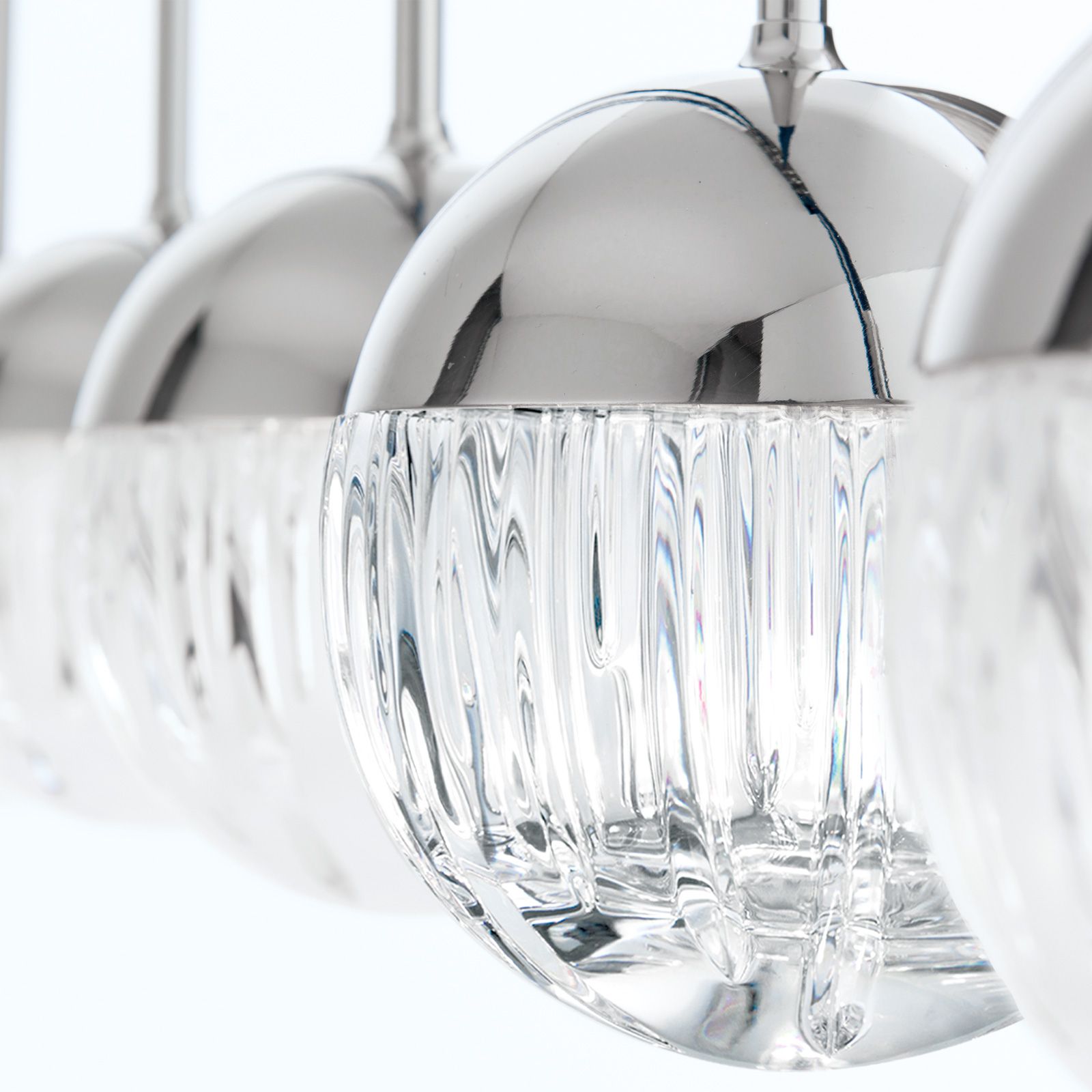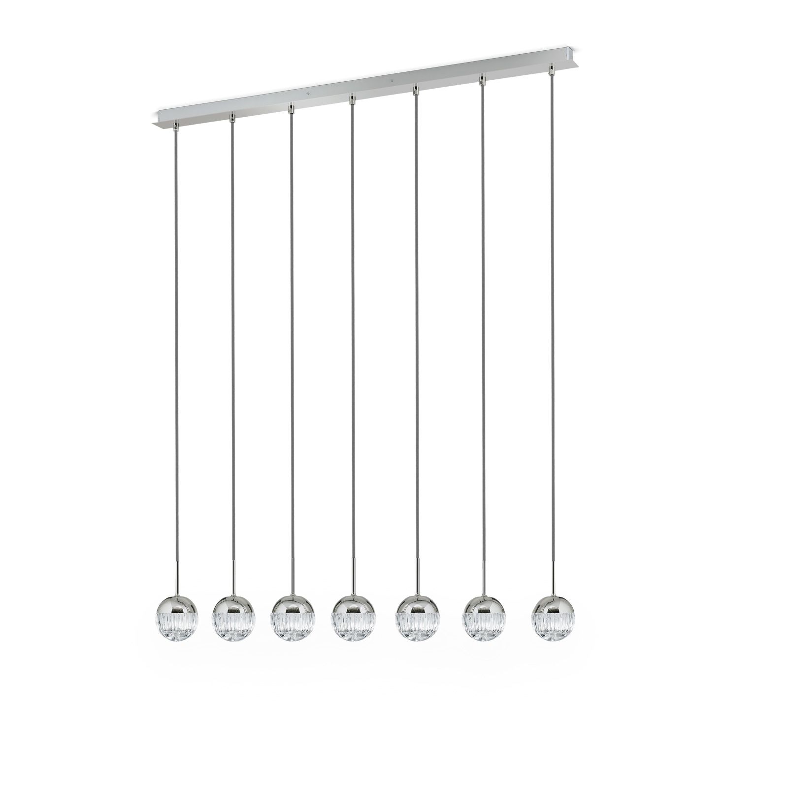 7-flames pendant lamp BALL is a true highlight above any dining table: its light balls are made of high-quality high lead crystal glass and can be suspended from the canopy at varying heights. The glass is framed by refined solid brass in surface finishes shiny nickel or 24 carat gold plating to fit into many different colour concepts..