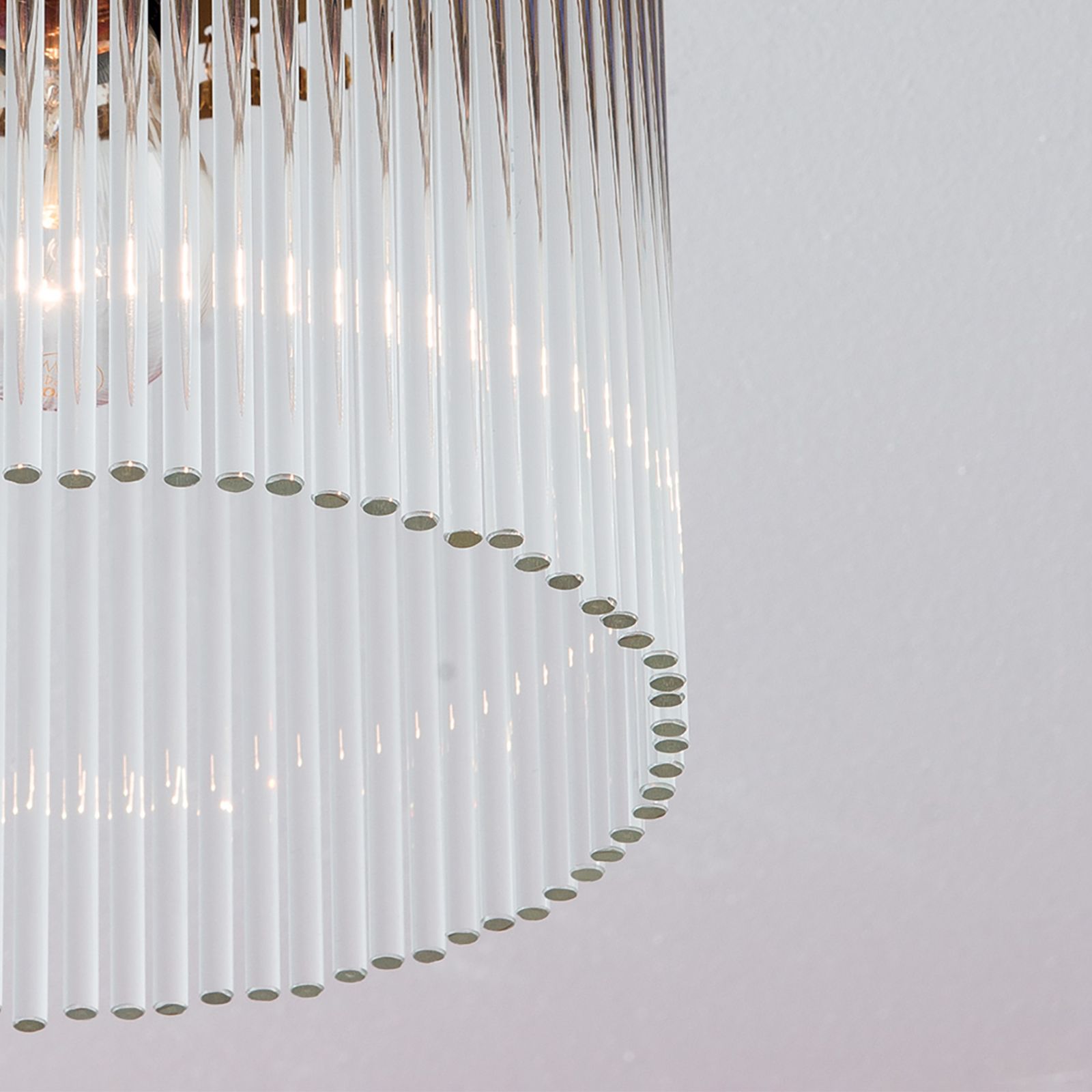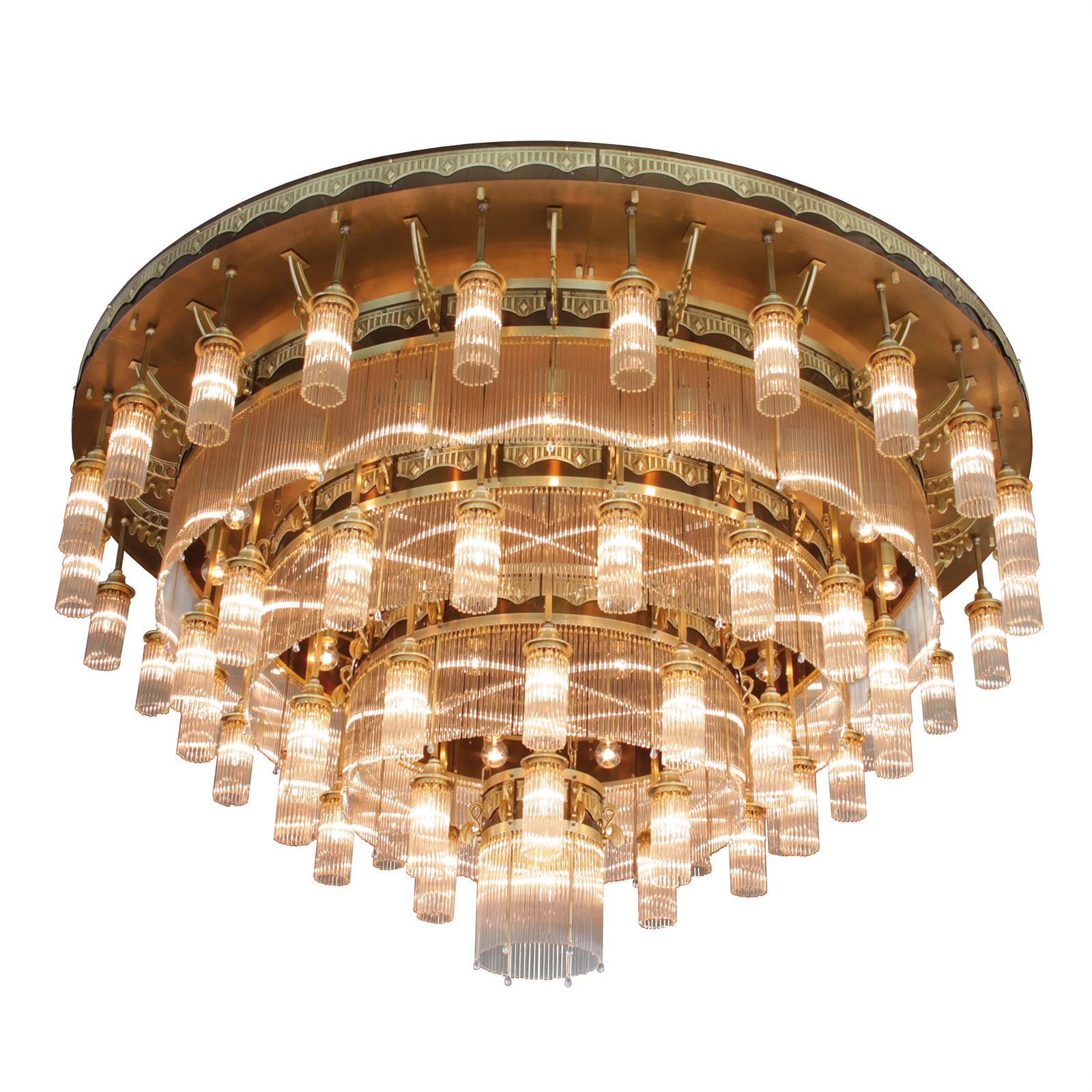The 4-storey, 61-lamps ceiling chandelier from the ADELE series floats proudly like a Mongolfière hot-air balloon over a festive banquet, an international conference, any spacious premises where audiences gather. Wreaths of lights condense towards the centre to form a compact luminous body. An armada of glass rods streams warm, powerful light into the room or hall. The brasswork reflects the rays glowing golden down from the ceiling.