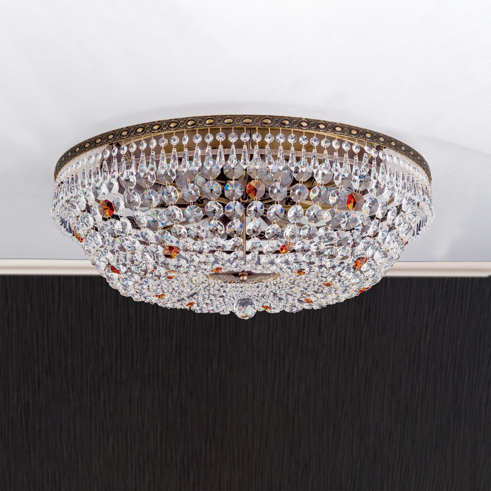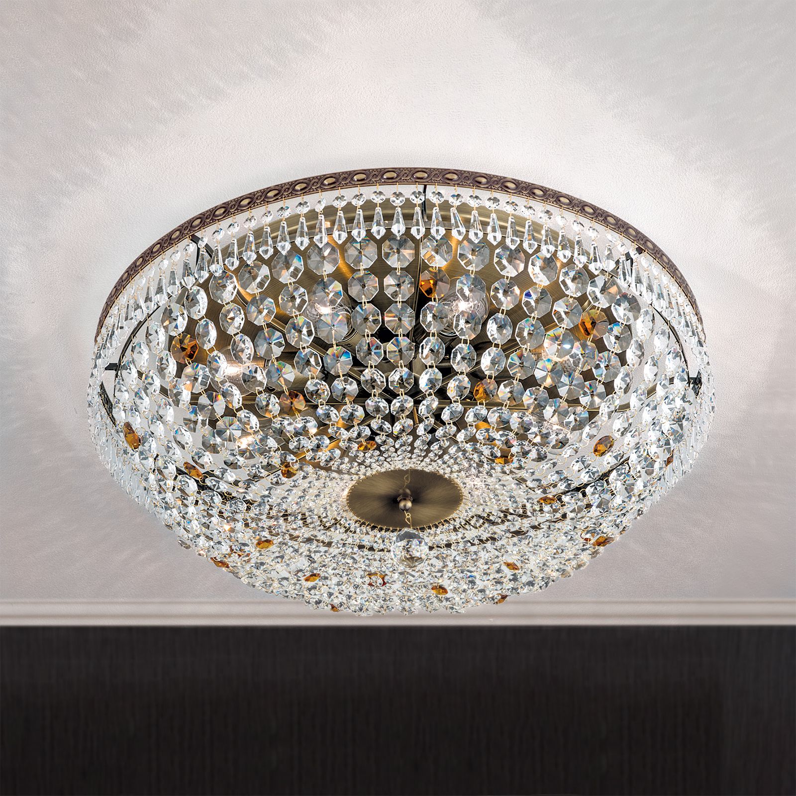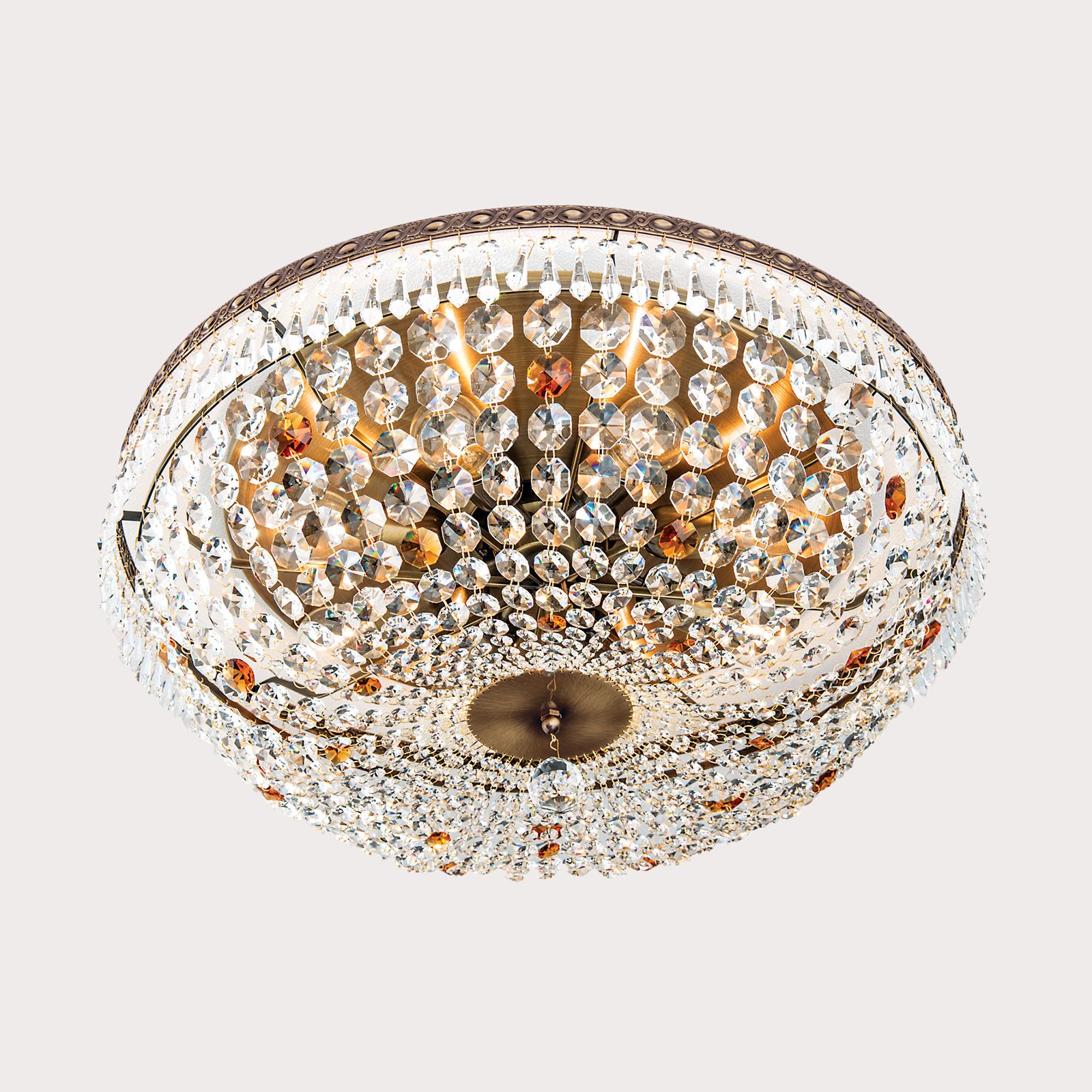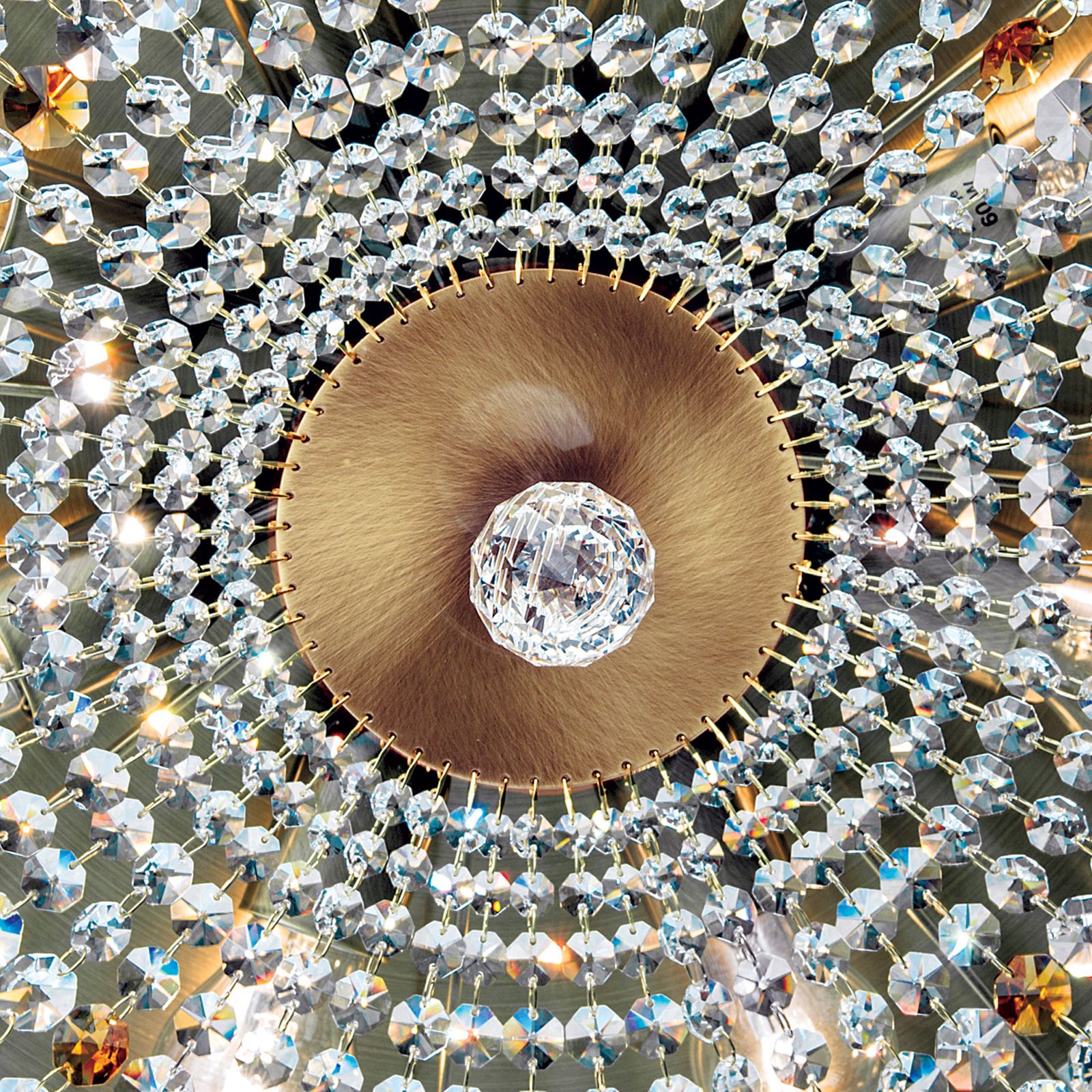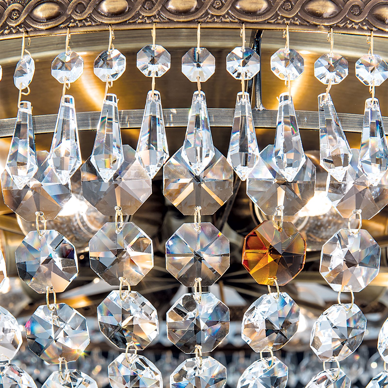 Countless crystals in drop an octagon shape hang down from a richly decorated metal ring made of solid brass. The discreet, inner ring carries the crystal chains running to the centre where they are fiaxated on a mirrored decorative plate. Special feature of the light are deliberatedly placed amber-coloured crystals and the centrally hanging faceted crystal ball, that seems to float. Its 8 bulbs in E27 sockets are hidden behind the crystals and can be operated with 60 watts maximum each to provide even large rooms with sufficient light.