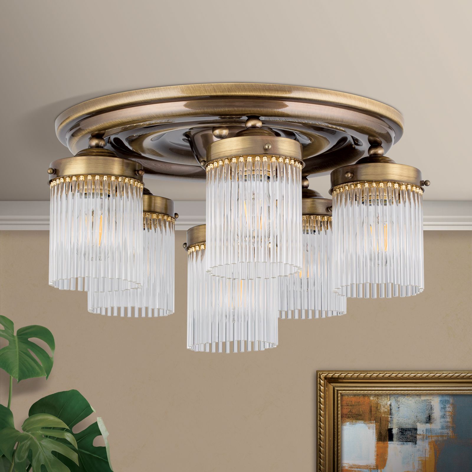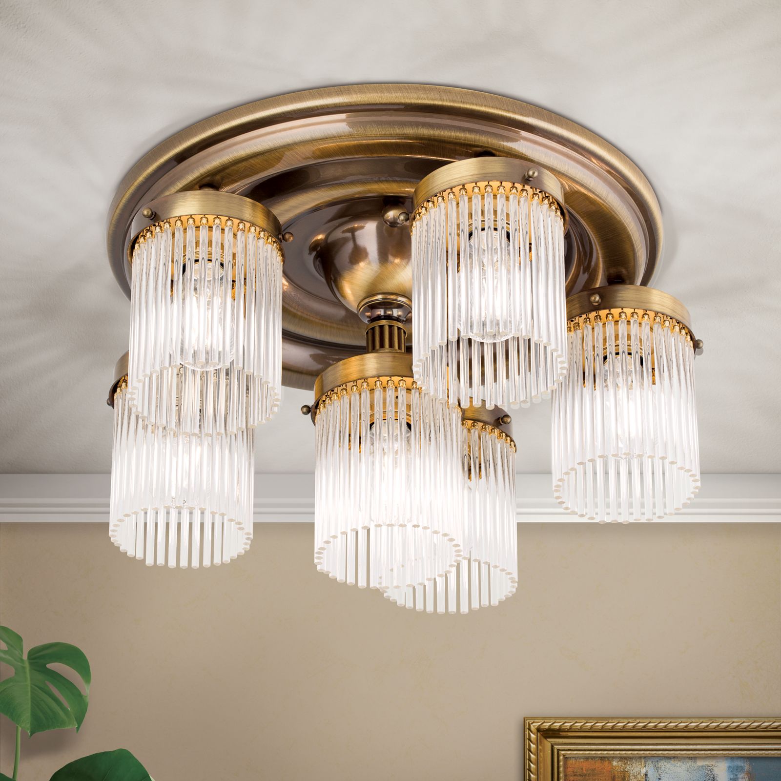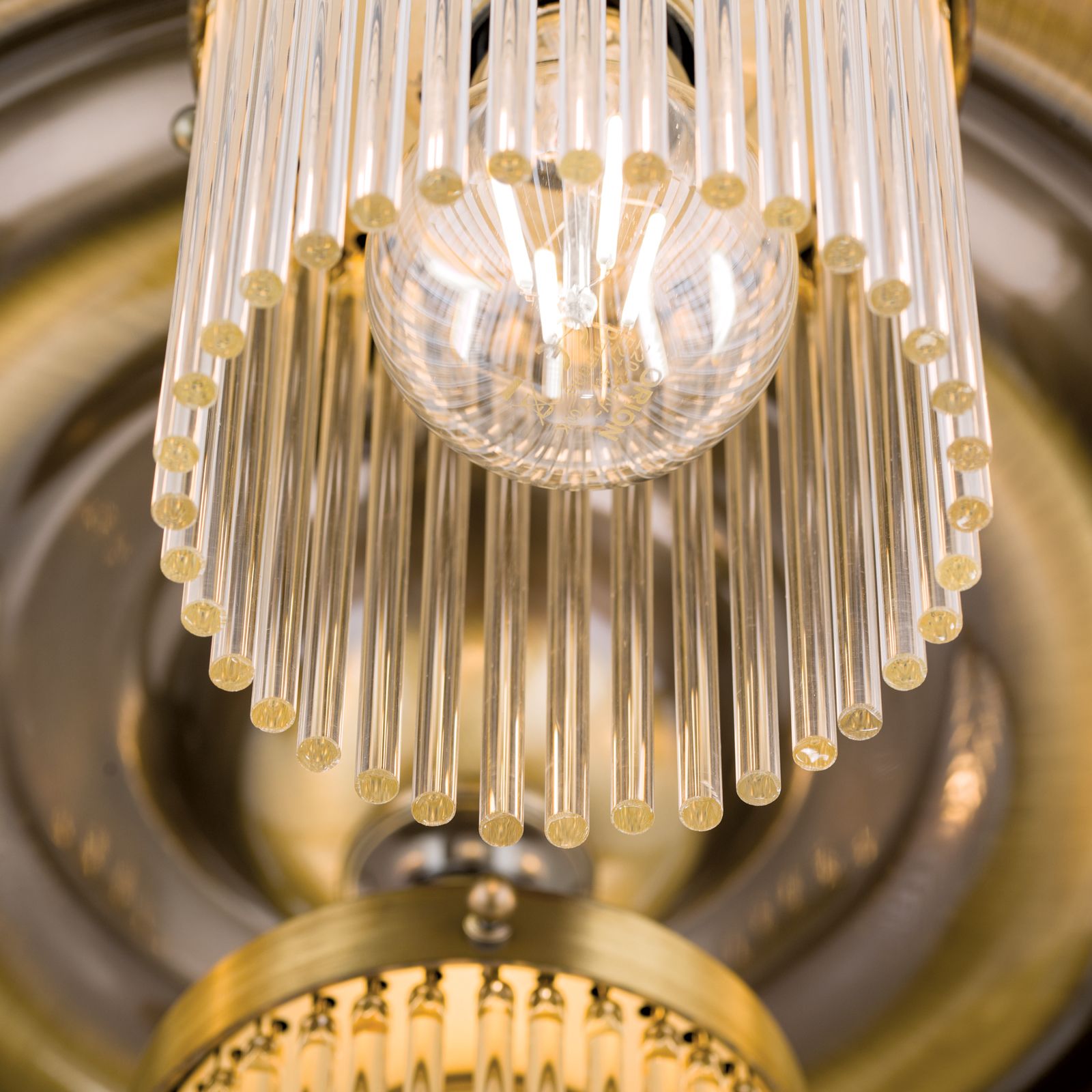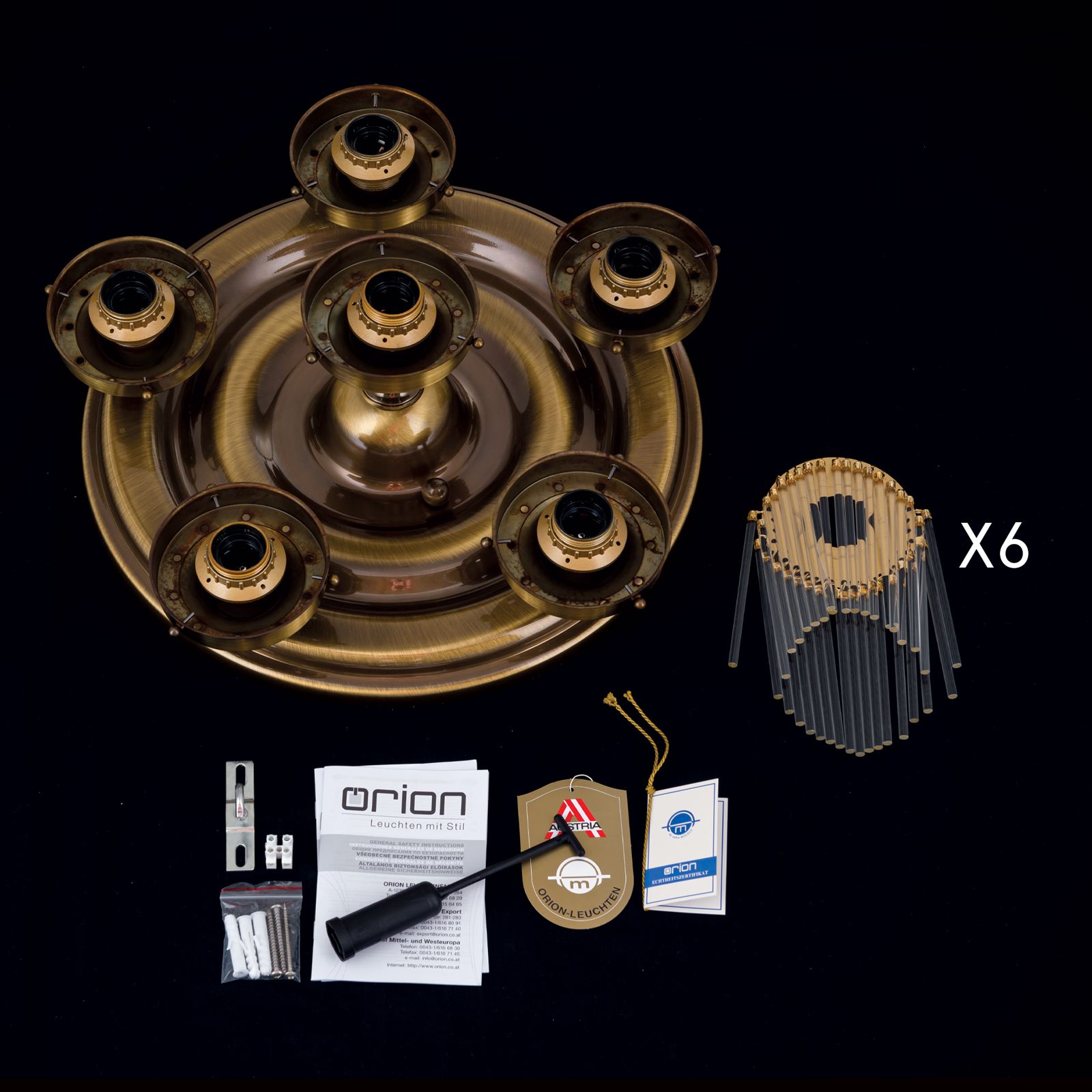 STÄBCHENSERIE by Orion highlights an essential feature of Art Nouveau: the beauty of simplicity. The 6-flame ceiling chandelier from this series is based on a simple composition. A kind of discus comprised of several discs tapering towards the bottom forms a classicist base. Five flames circle a central flame set furtherlower down. The structure's downward strive is accentuated by the straight lines of the glass rods. This creates a chandelier with fascinating light plays and wreaths. The surface finish creates a gently muted atmosphere. The six E27 sockets, each with 60 watts maximum are suited for illuminating living rooms or spacious offices.