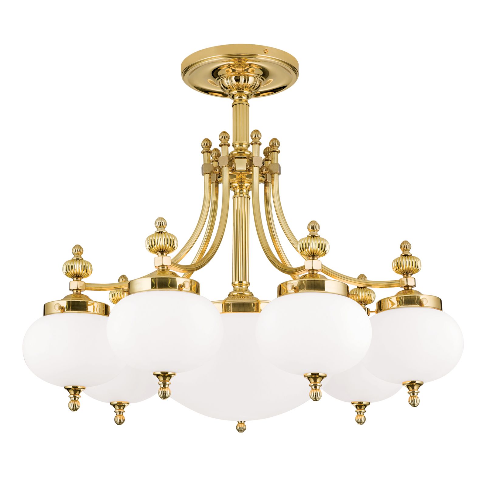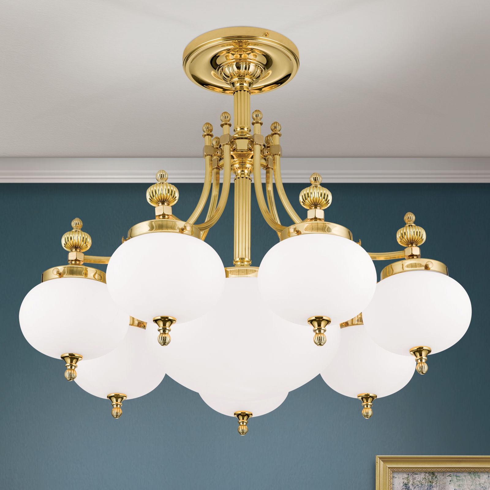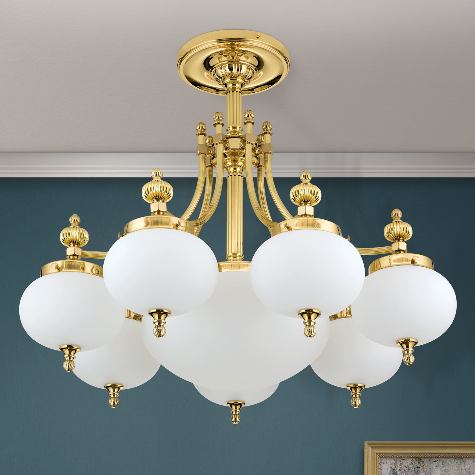 Ceiling chandelier WIENER NOSTALGIE, 7+1-flames, shiny brass, with opal matt glass
