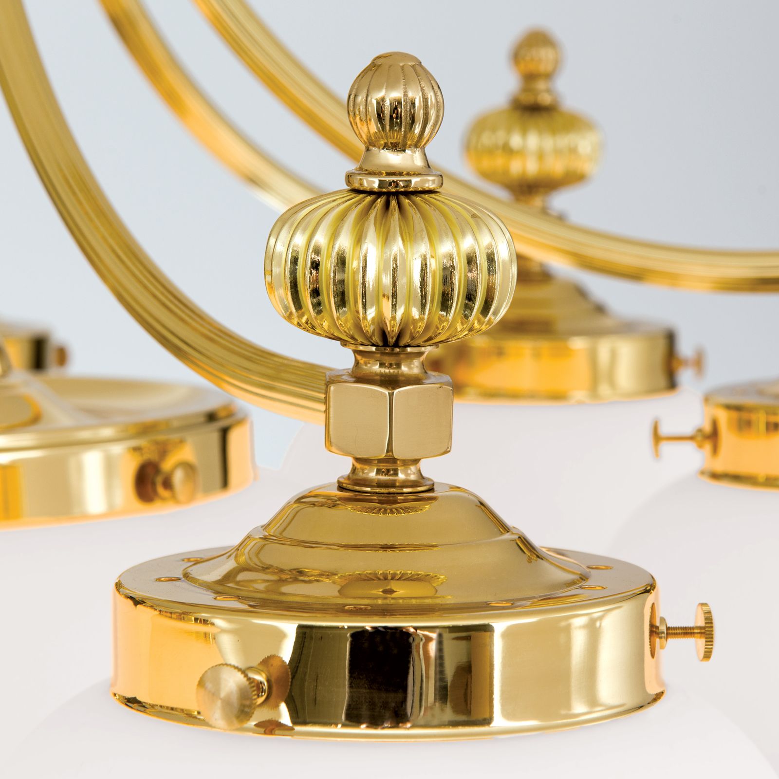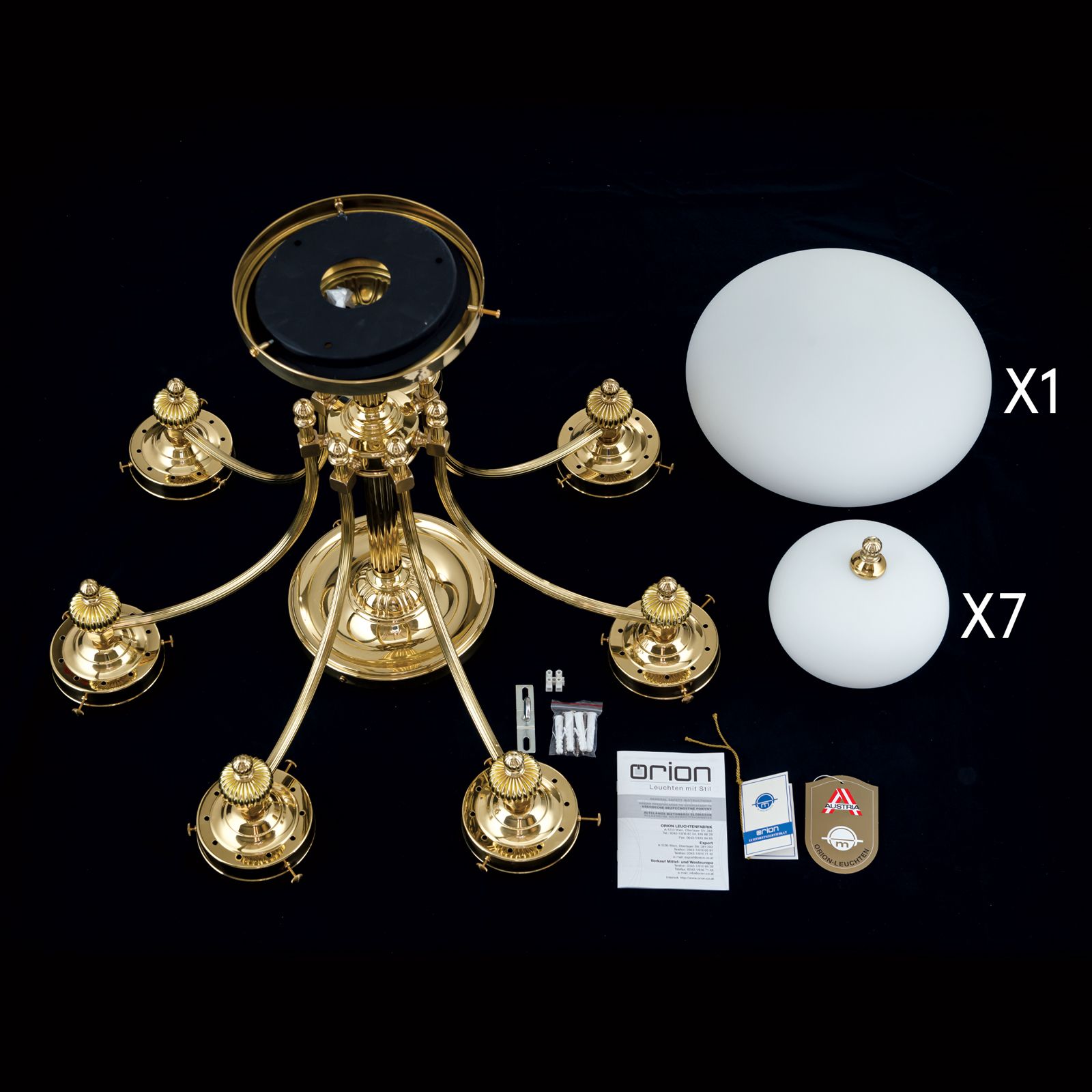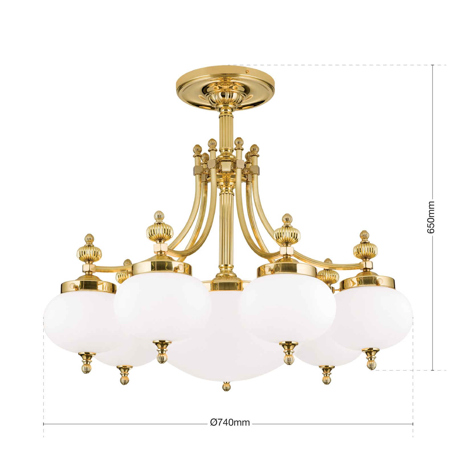 Ceiling chandelier WIENER NOSTALGIE, 7+1-flames, shiny brass, with opal matt glass