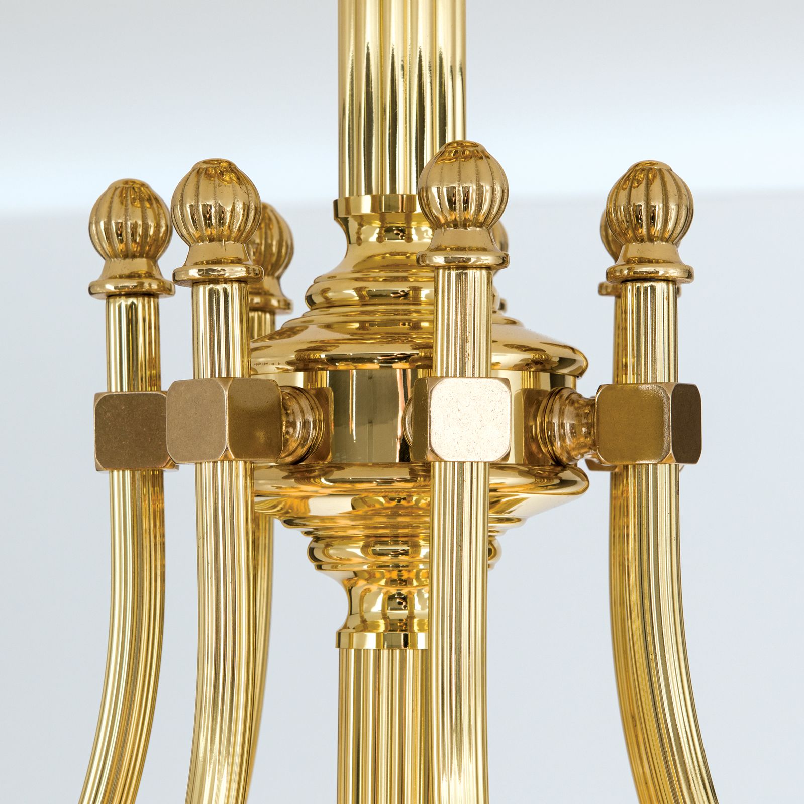 The 8-flame ceiling chandelier from the WIENER NOSTALGIE series is a spectacular eye-catcher. Placing a chandelier in the centre of any room always attracts special attention. This one, however, enchants with its Viennese coffee house mélange of antique splendour and clarity of the dawning age of Modernism. A fluted column and grooved decorative knobs are arranged in strict ellipses and powerful, simple arches. With a maximum output of 420 watts in total, a salon of up to 40 square metres can be illuminated. The light is equipped with seven E27 sockets for 60 watts maximum each and one E27 socket for up to 75 watts.