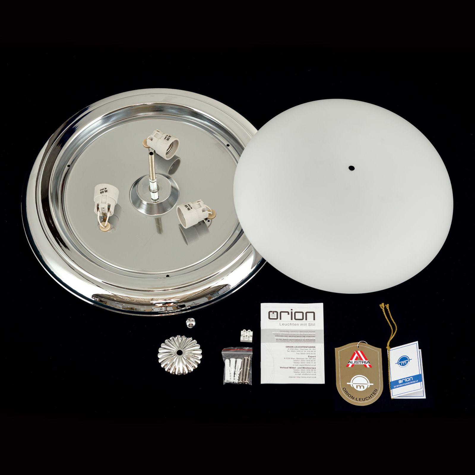 The ceiling light from the EMPIRE series features a flower-shaped knob at the centre of the glass shade. It crowns the theme of roundness, centrality, symmetry. Can anything be more perfect than a circle? The distance from centre to rim is identical everywhere, there are no corners, angles, slopes. This is why this shape is ideal for a ceiling light: the light is distributed absolutely evenly across the room, democratically, so to speak. In combination with curtains, draperies, carpets, this light will unfold its full warmth. Three E27 sockets provide 60 watts maximum each.