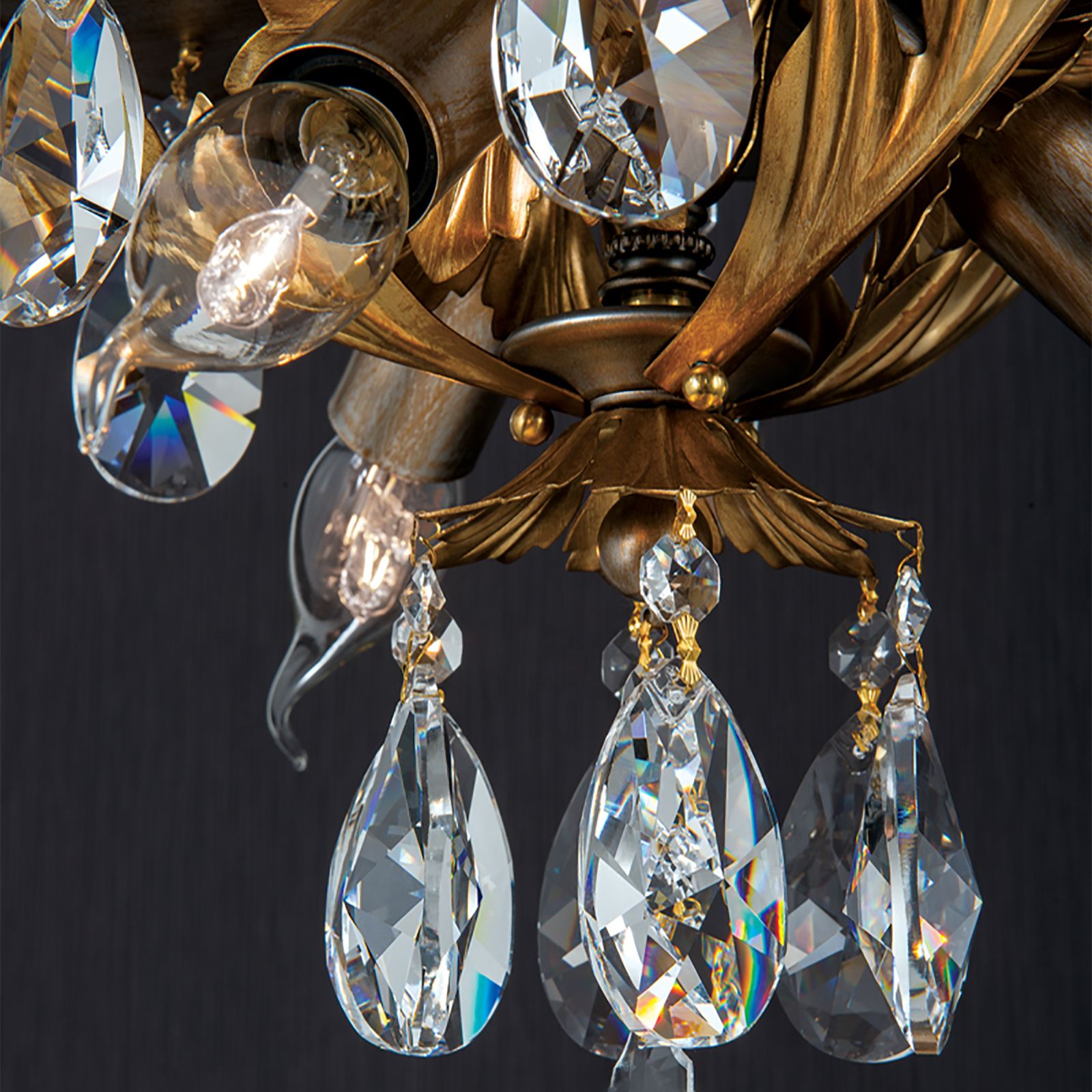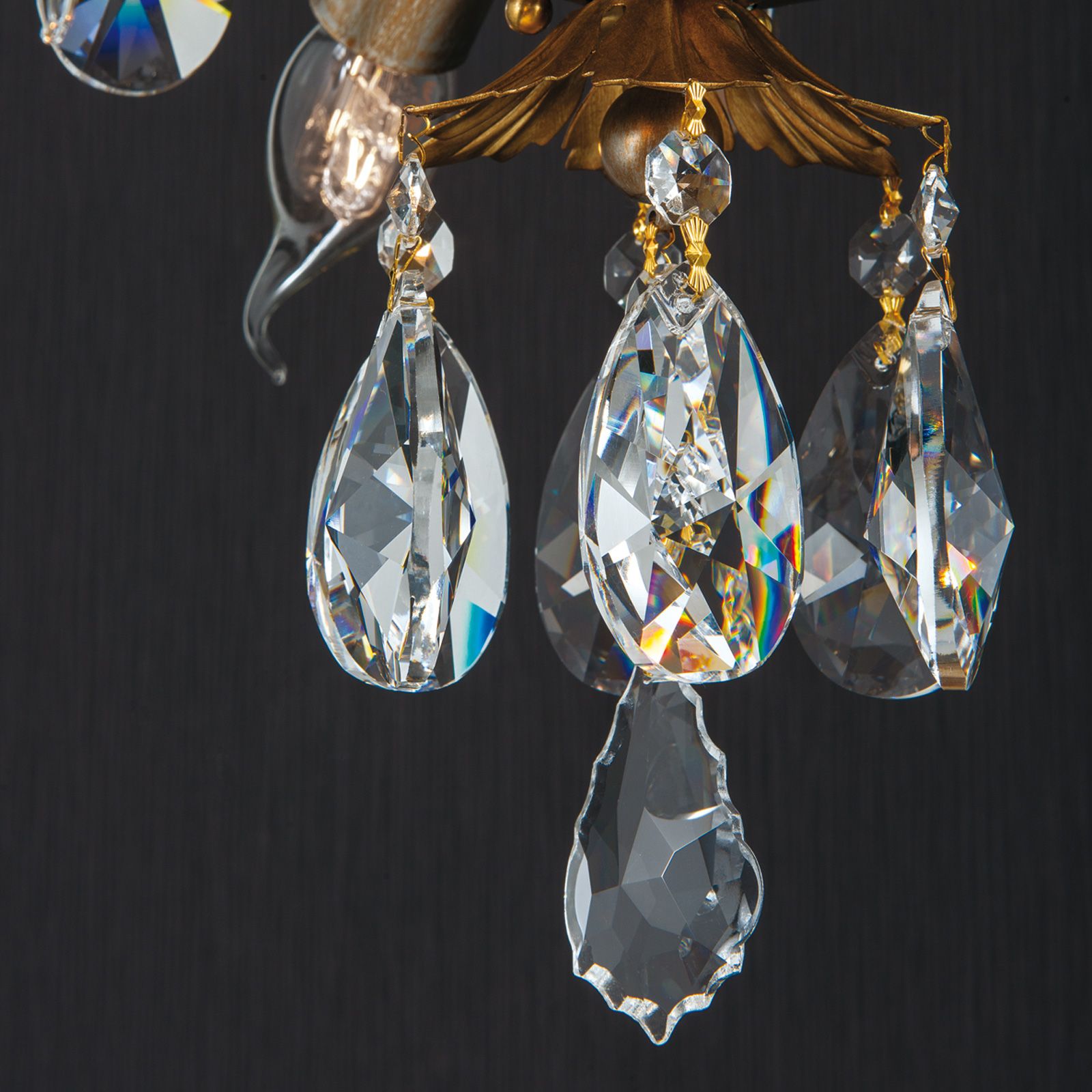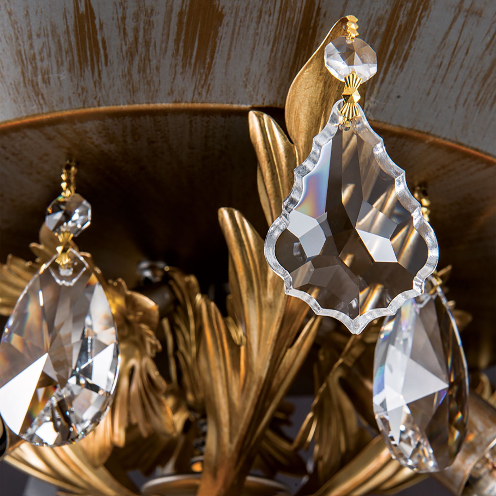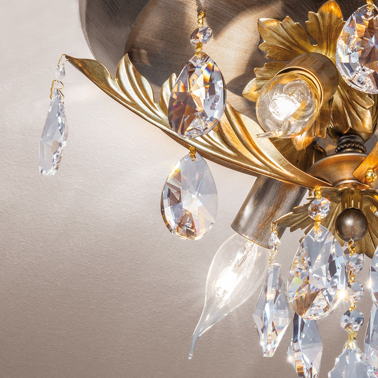 The 3-flames ceiling light from the MIRAMARE series proudly stretches its tendrils. Three hand-shaded candle spouts rise from an artfully designed sea of leaves. Equipped with wind gust candles, one imagines seeing the flickering of a fairytale creature. Exclusive crystal pendants reflect light casting dreamy shadow veils on the walls. Dining rooms with low ceiling and Baroque furnishings are particularly suited for this light. Likewise bedrooms with antique furniture or entrance hall. The light is fitted with three E14 sockets for 40 watts maximum each.