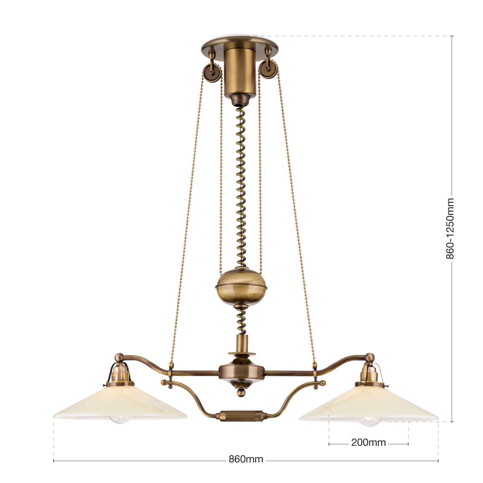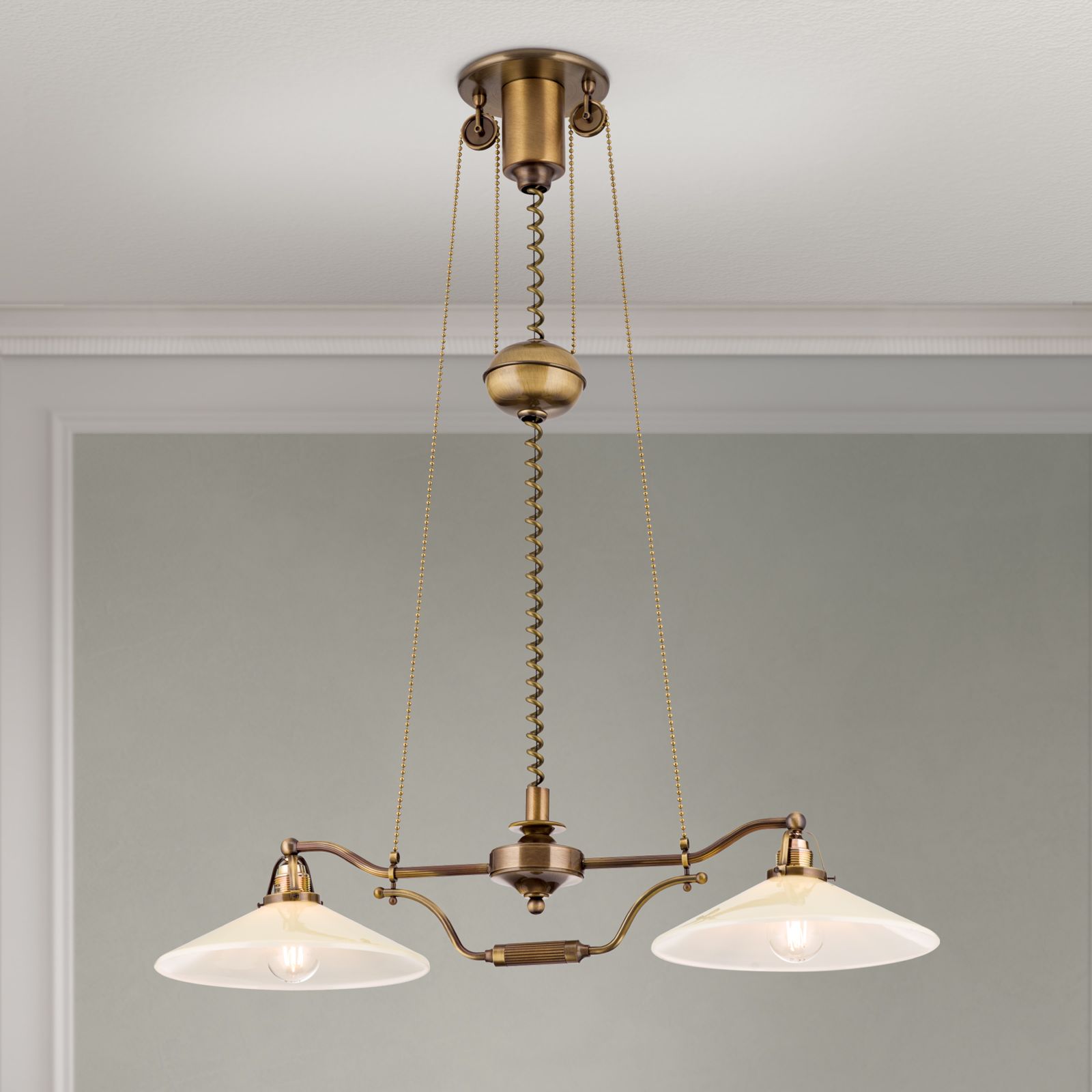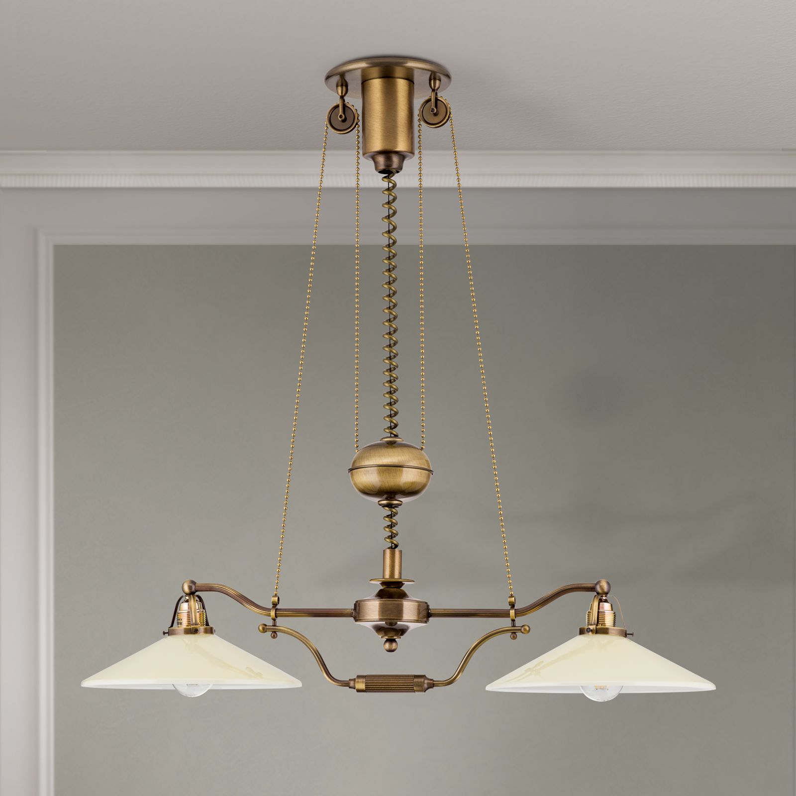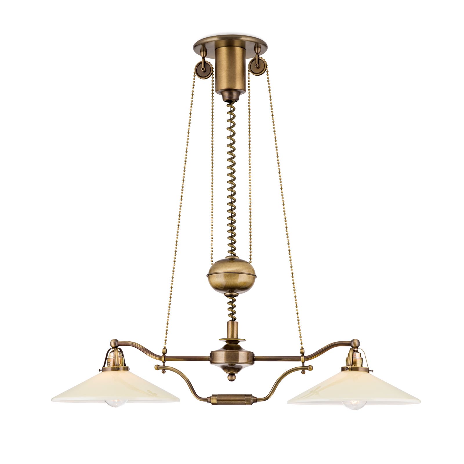 Chandelier ARTDESIGN in Antique Brass finish, champagne glasses, 2 lamps + pulley system