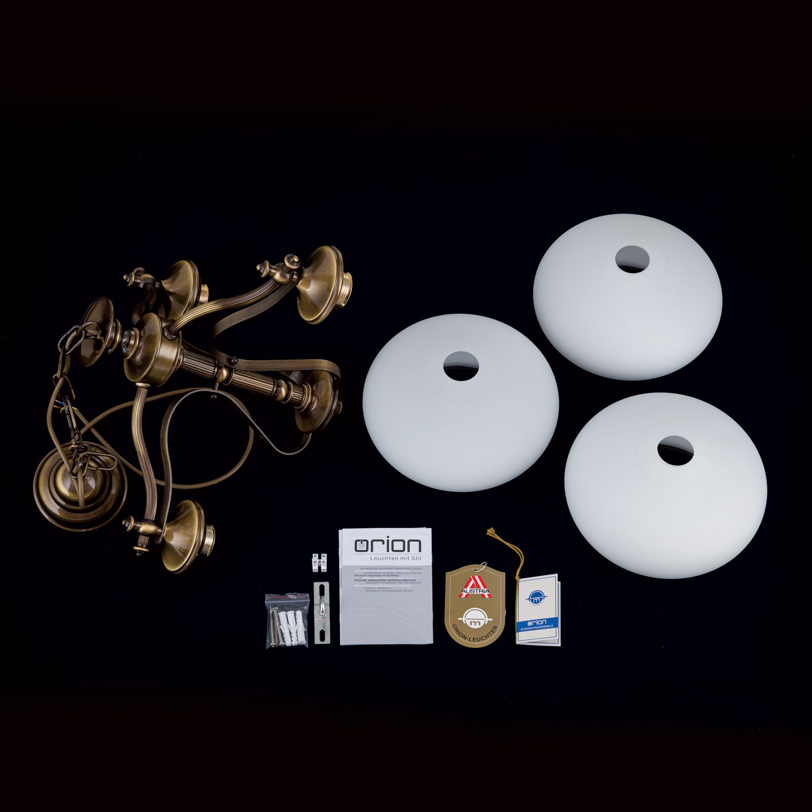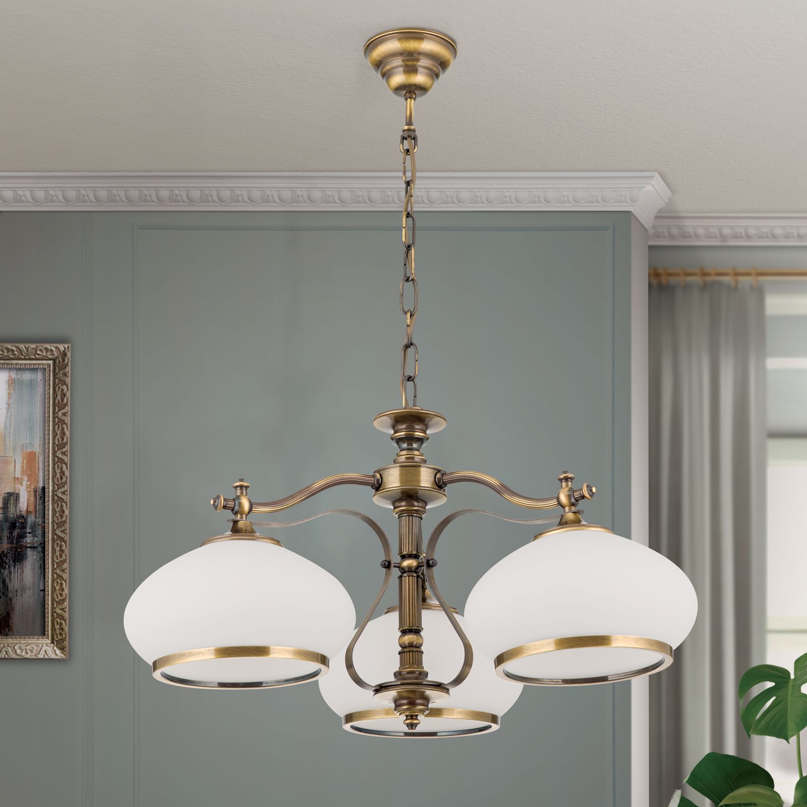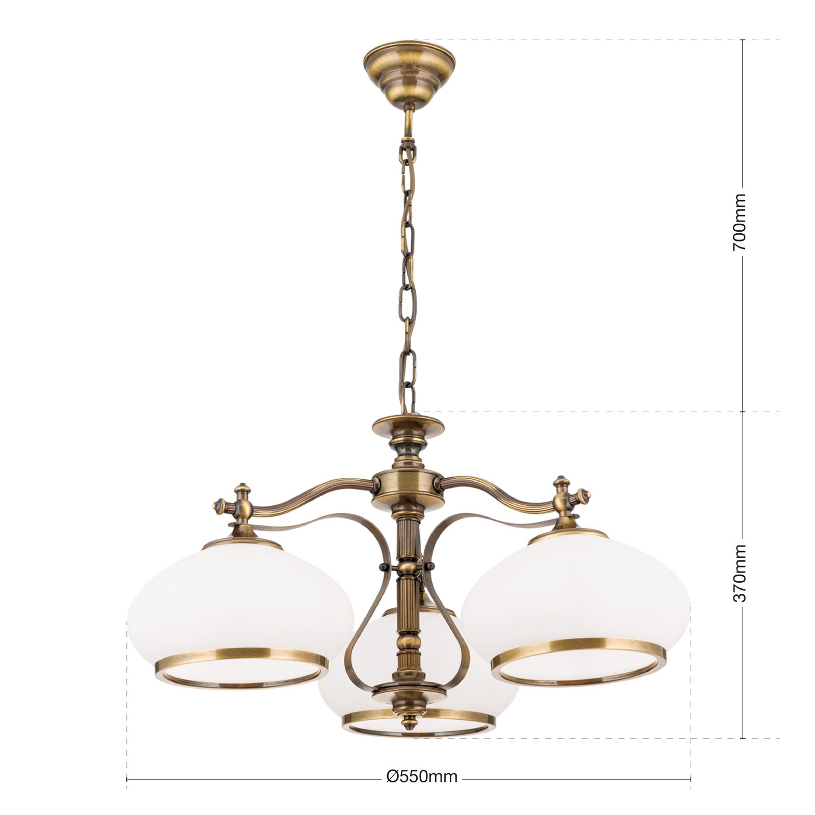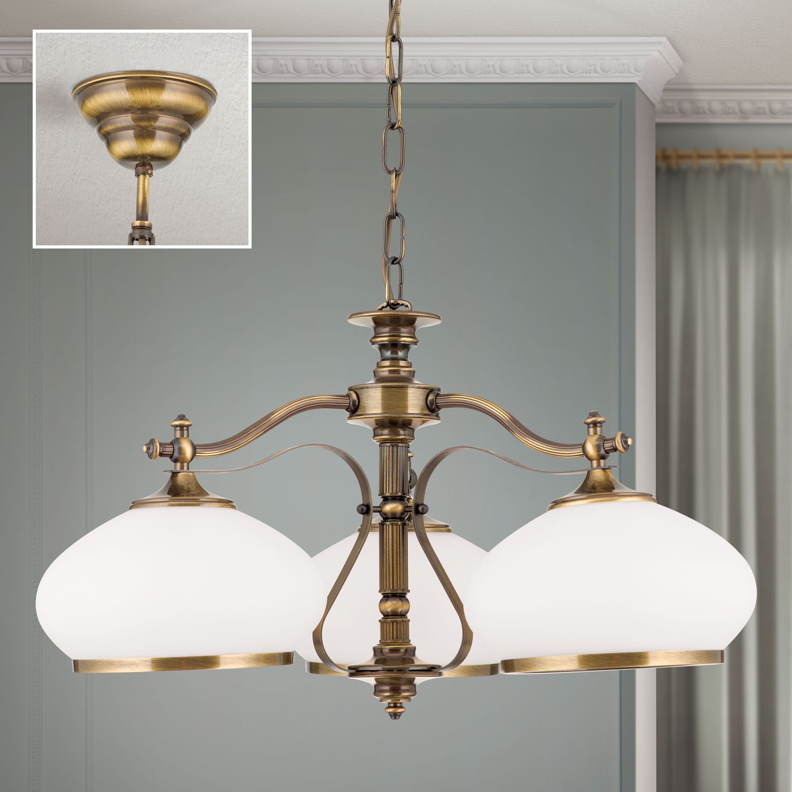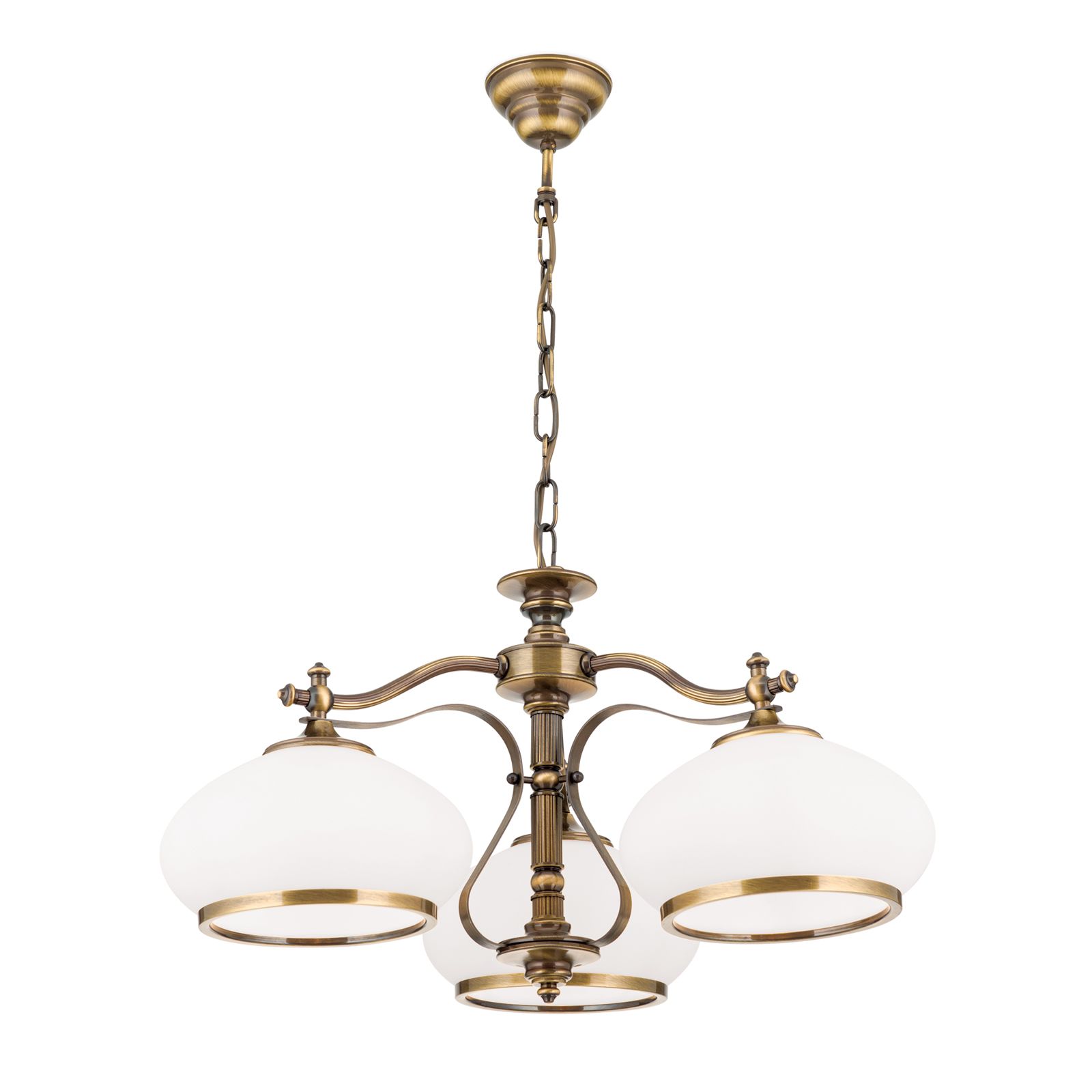 Chandelier EMPIRE, Antique Brass finish, with 3 opal glasses