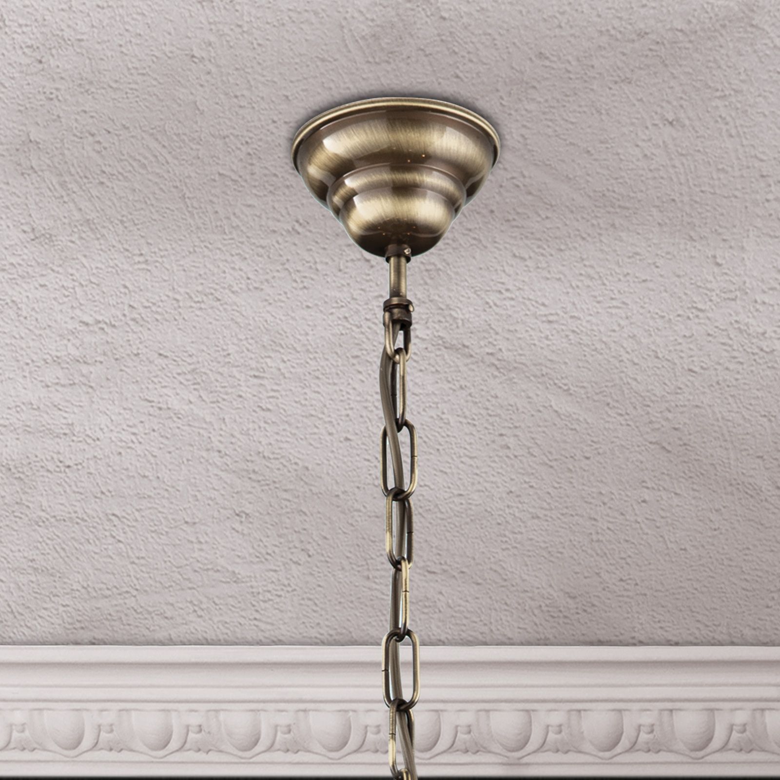 With the classic shape of a basket chandelier, the solid brass frame features a beautifully embossed decorative band to which the light arms are attached. Asfour crystals in knob shape linked to chains, form the frame's shade decorated with additional crystals in drop shape on the upper and lower bowl as well as below the decorative band. The 10 E14 sockets hidden behind the candle holder cover, operate with 40 watts maximum each. To create the perfect mood, brightness can be regulated with the help of a dimmer.