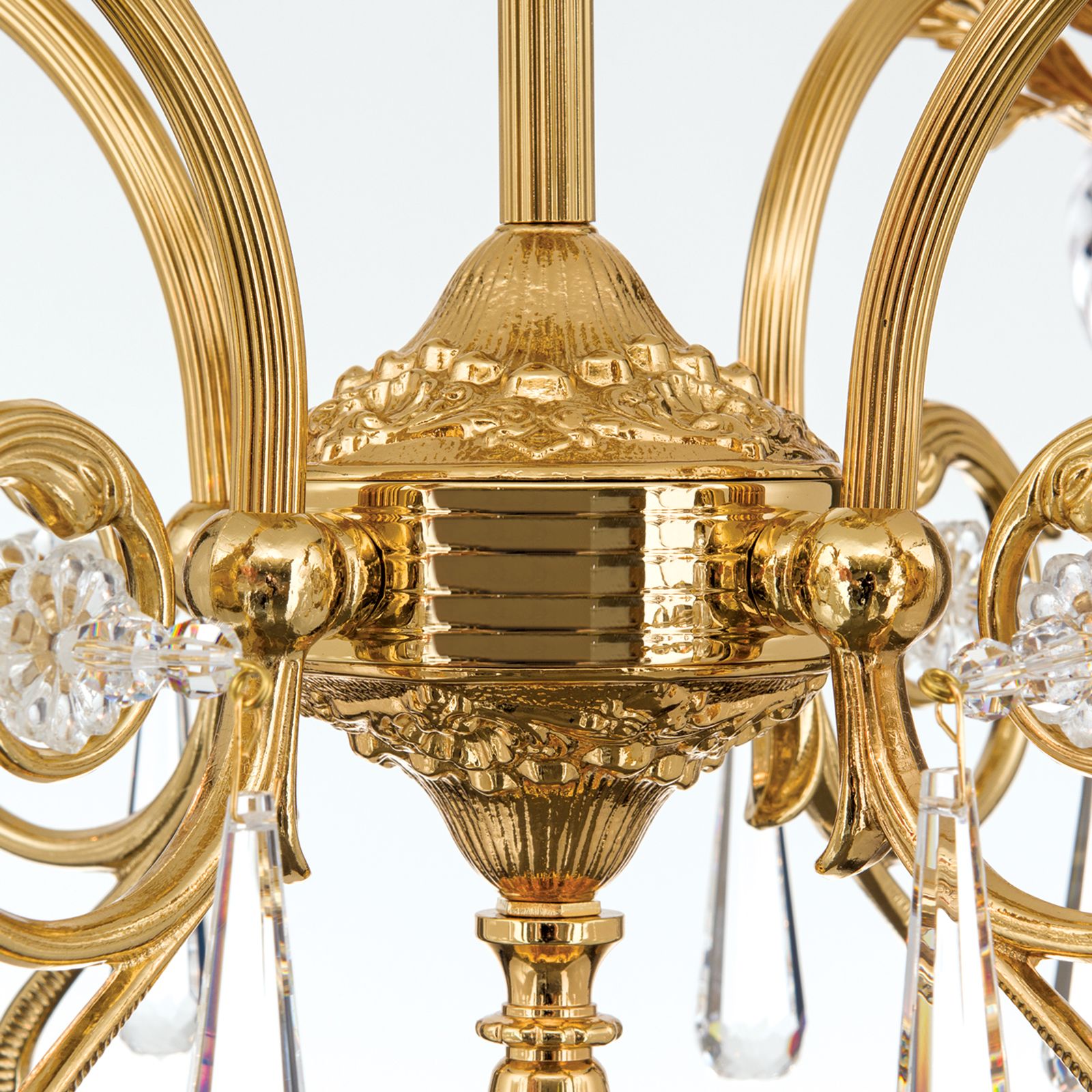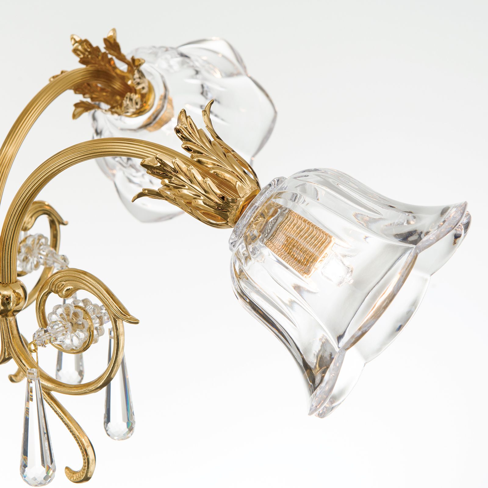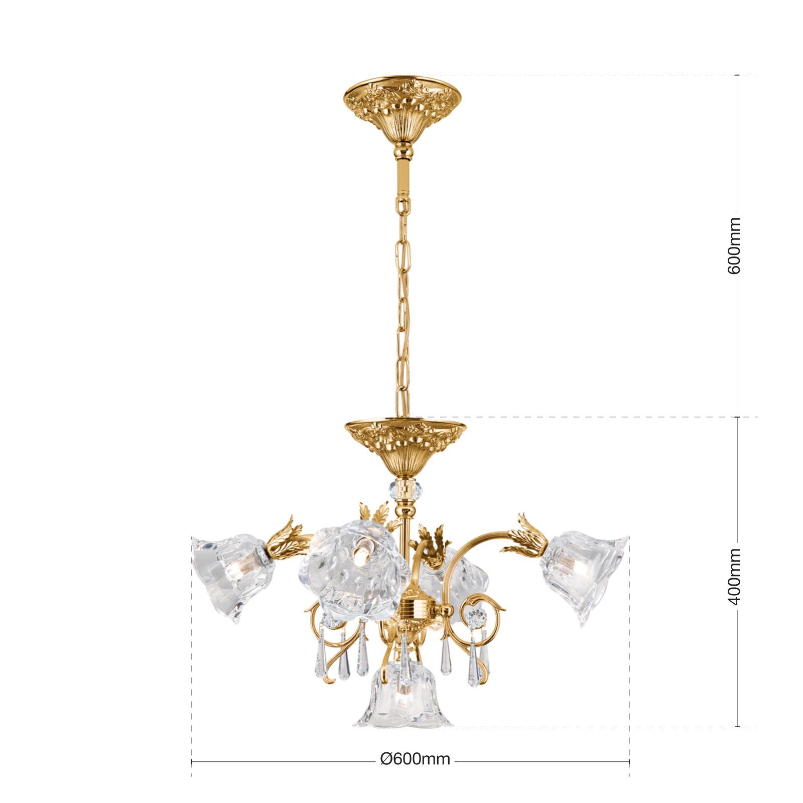 Made from solid brass, it is fitted with an ornately decorated ceiling rose. A column supports the 4 curved fluted arms with numerous droplet-shaped crystals. The intricately cut lead glass flower glasses not only look pretty, but also emit light in all directions. The chandelier can therefore be used for basic illumination.