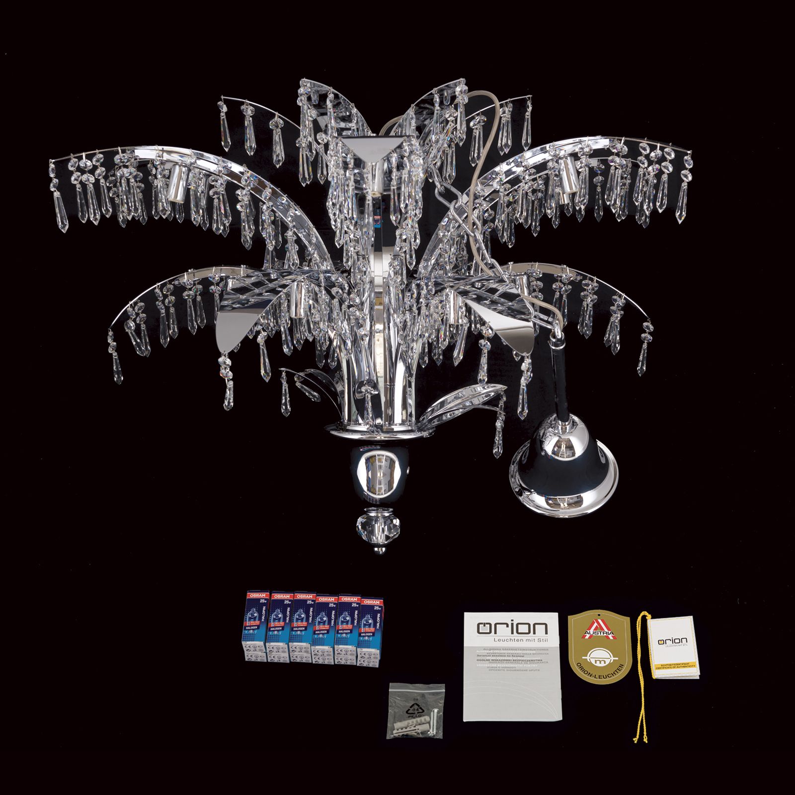 The PALME chandelier has been fitted with 12 G9 Lamp holders, giving you the freedom to choose your favourite bulbs to create the perfect atmosphere. The choice of high-quality G9 light sources allows for a bright and even illumination of the room and at the same time emphasises the fascinating play of light in the SCHÖLER CRYSTAL® elements.