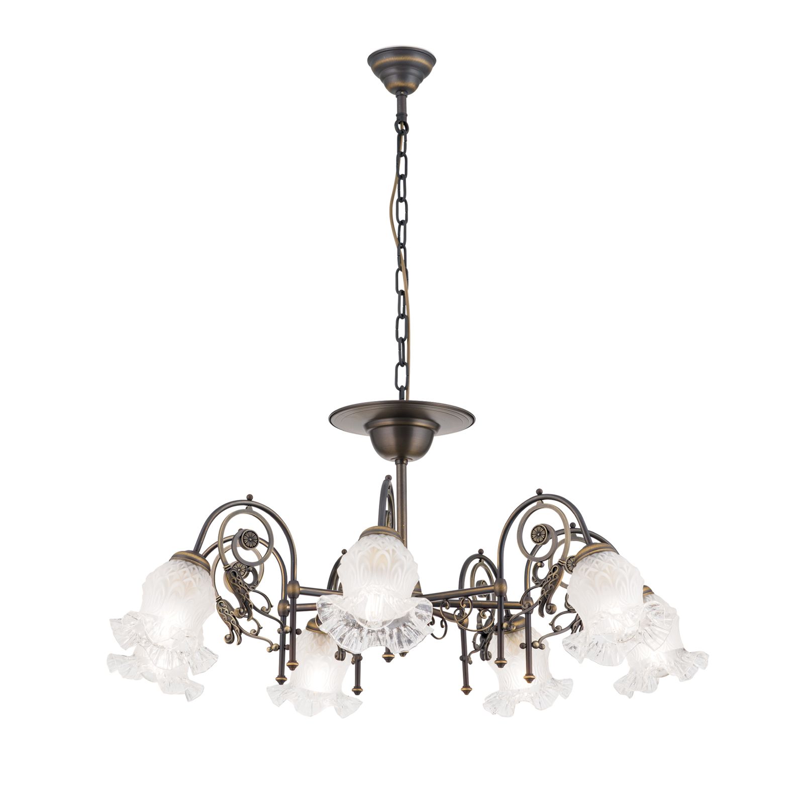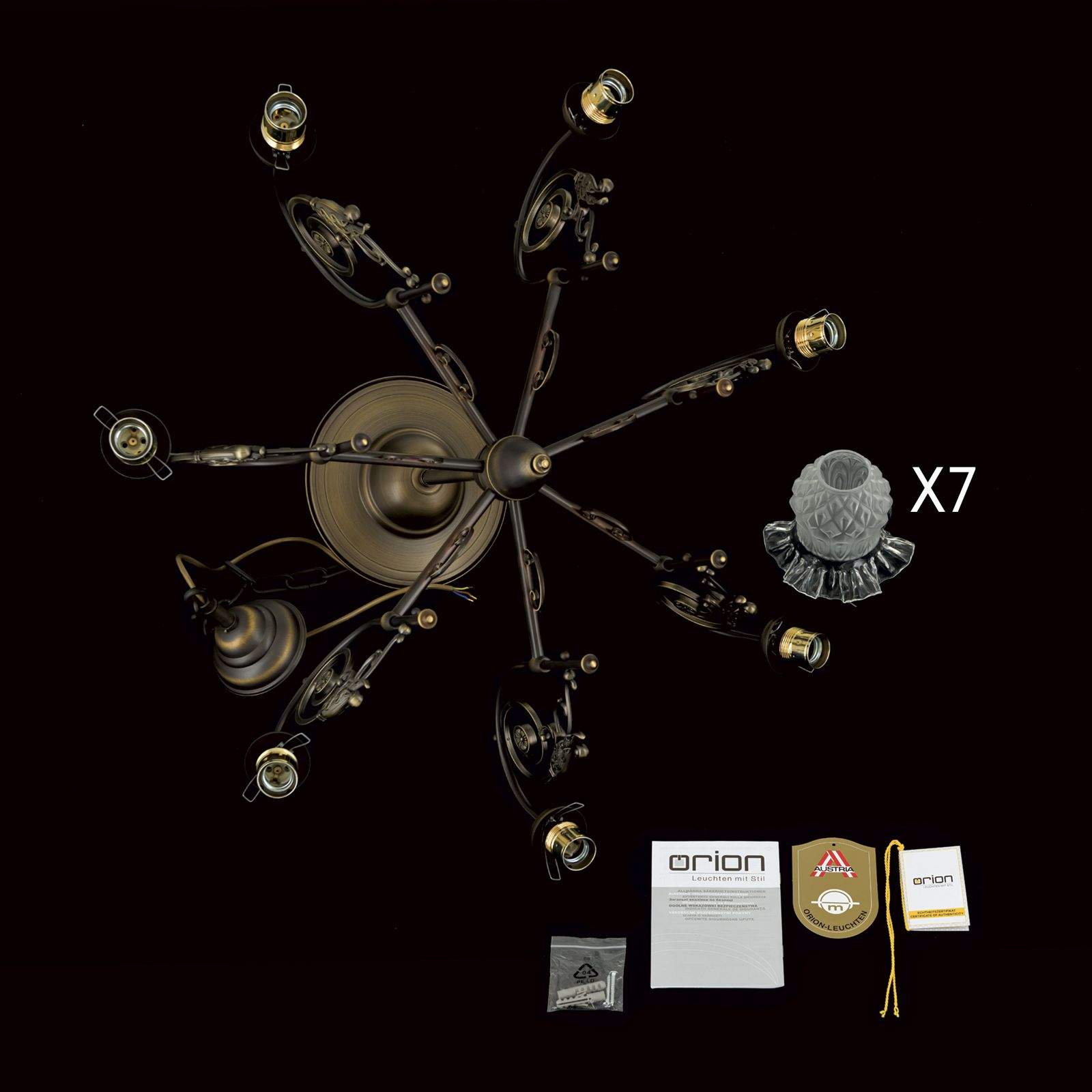 Experience timeless elegance and fascinating lighting with our RINGSTRASSE chandelier in antique patina and a seven-burner version. This magnificent chandelier will not only brighten up your home but also add an amazing aesthetic touch.