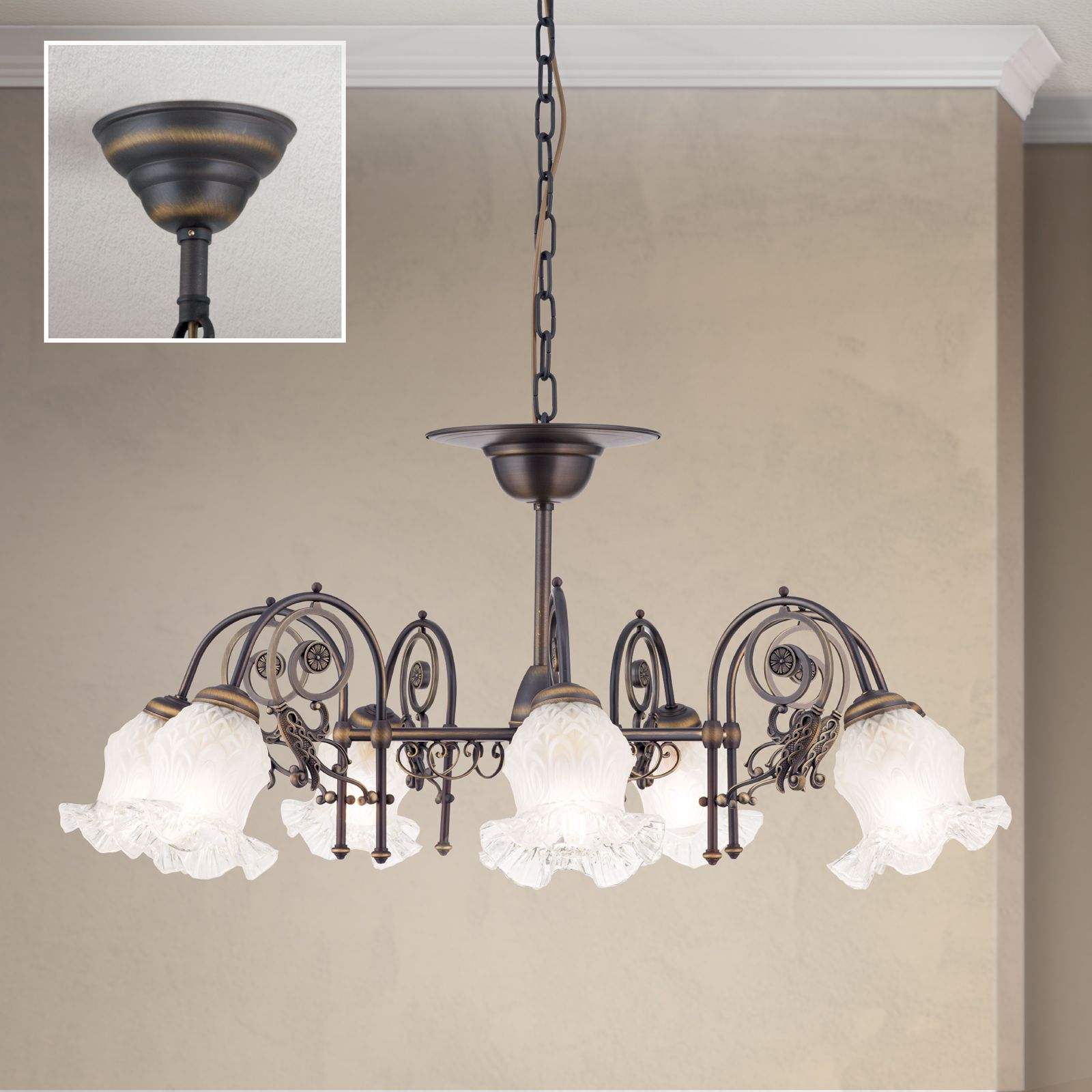 A special highlight of this chandelier are the flower glasses that surround the light bulbs. These glasses give the RINGSTRASSE chandelier a romantic and playful touch and provide a soft light diffusion that bathes your room in a warm and inviting ambience.