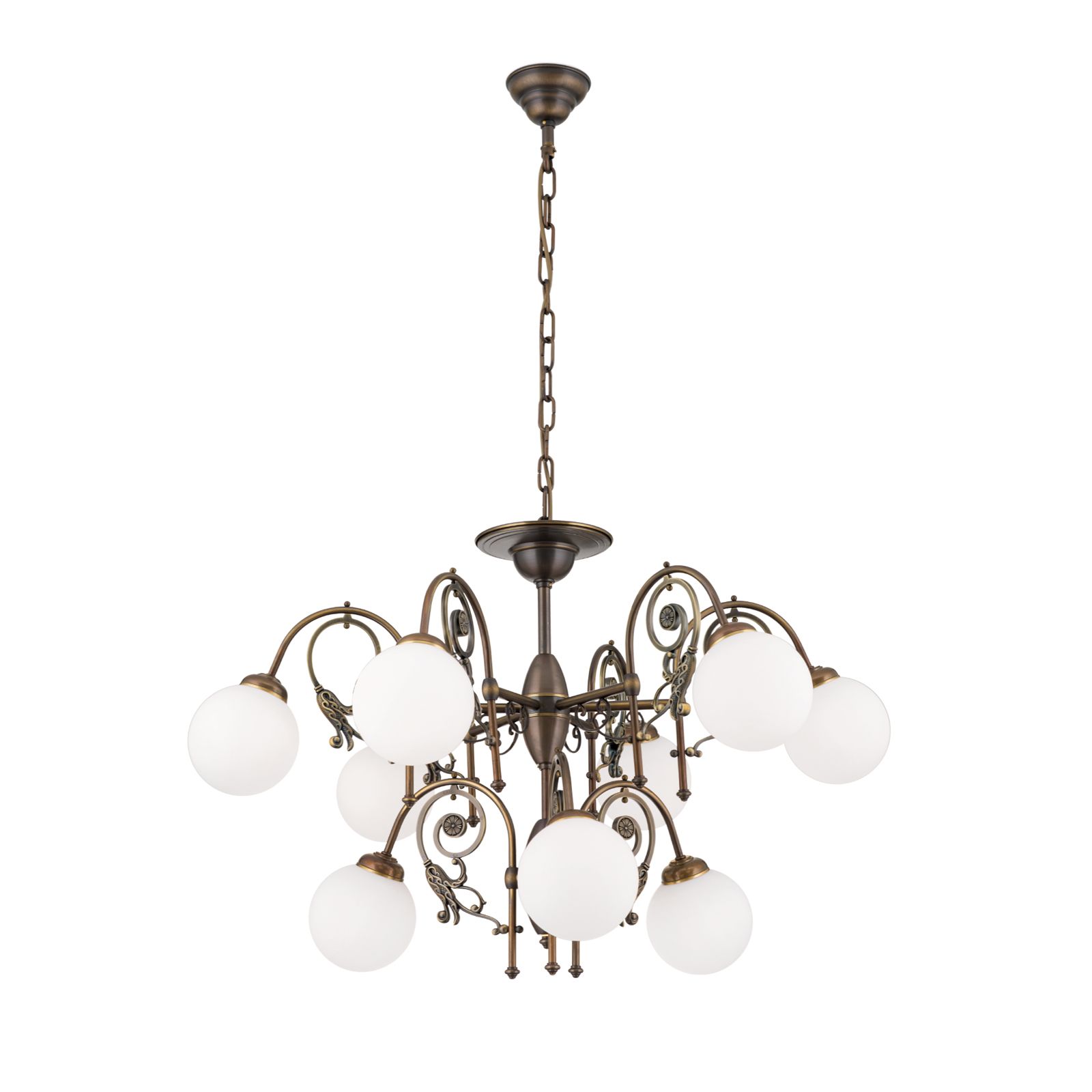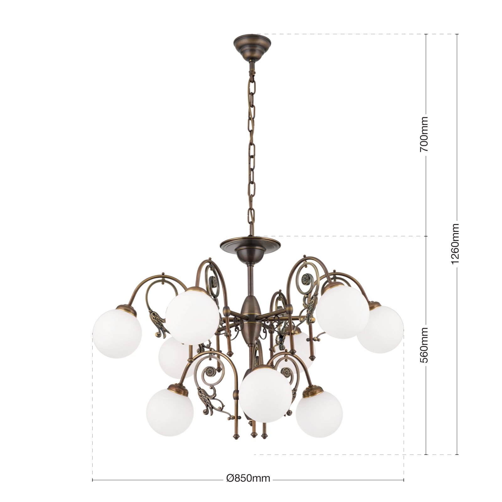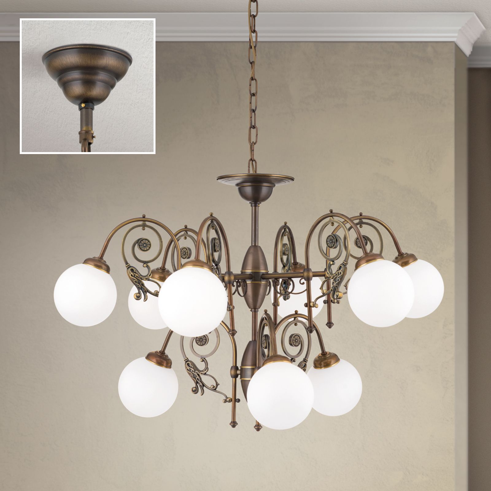 Discover the elegant RINGSTRASSE chandelier - a ceiling light with nine flames that bathes your rooms in an enchanting light while exuding a touch of classic luxury. With its aged patina finish and opal matt spherical glasses, this chandelier is not only a practical source of light, but also an artistic decorative object.