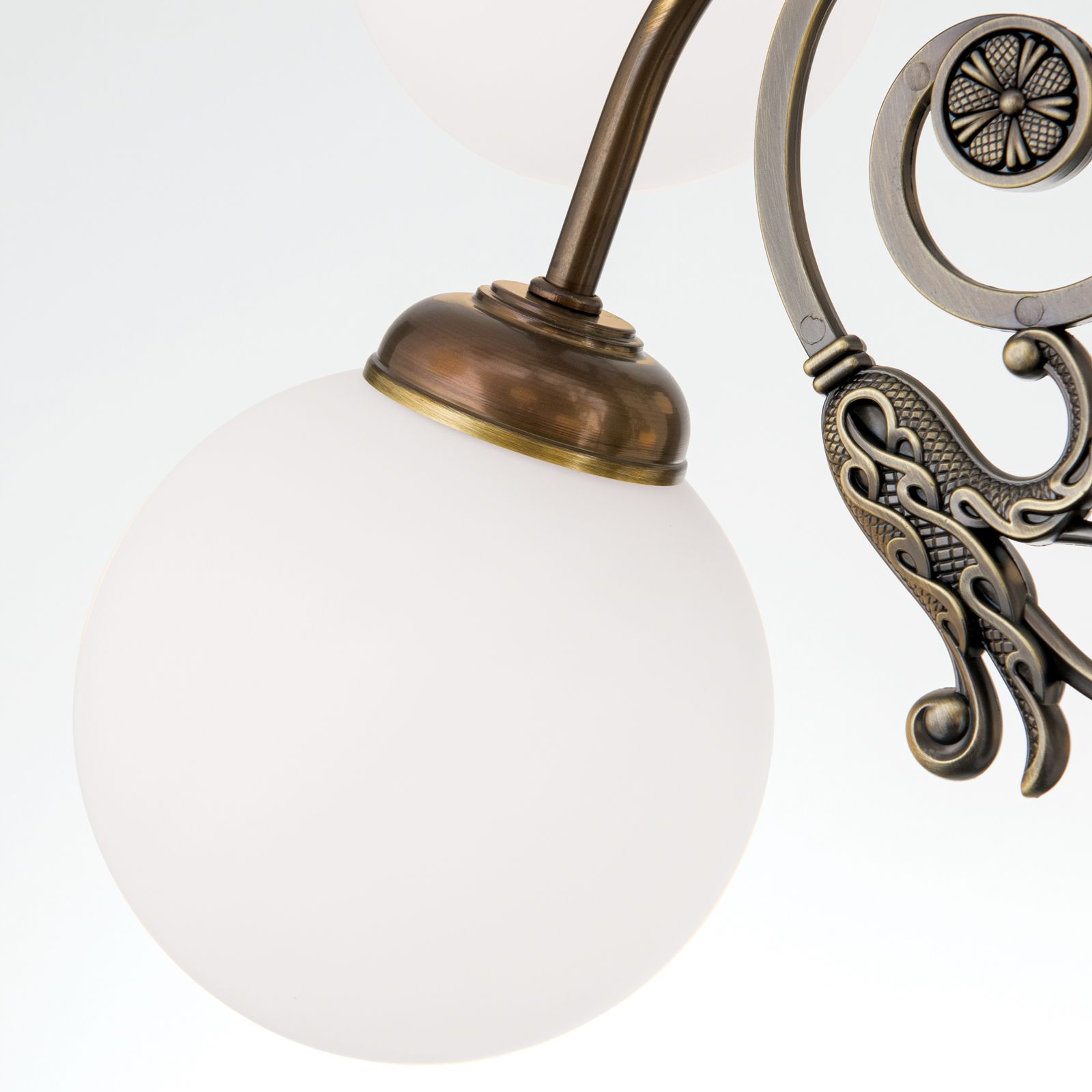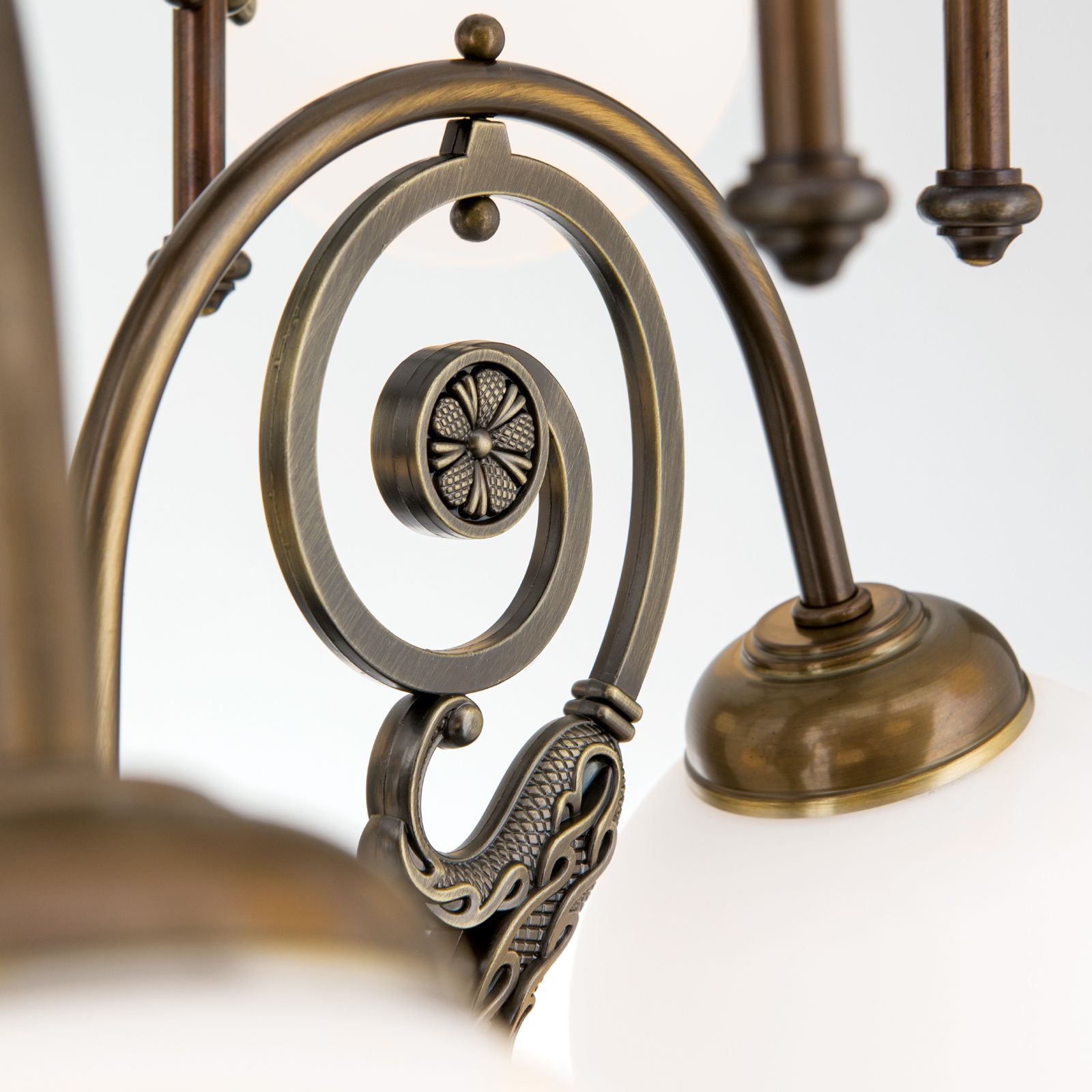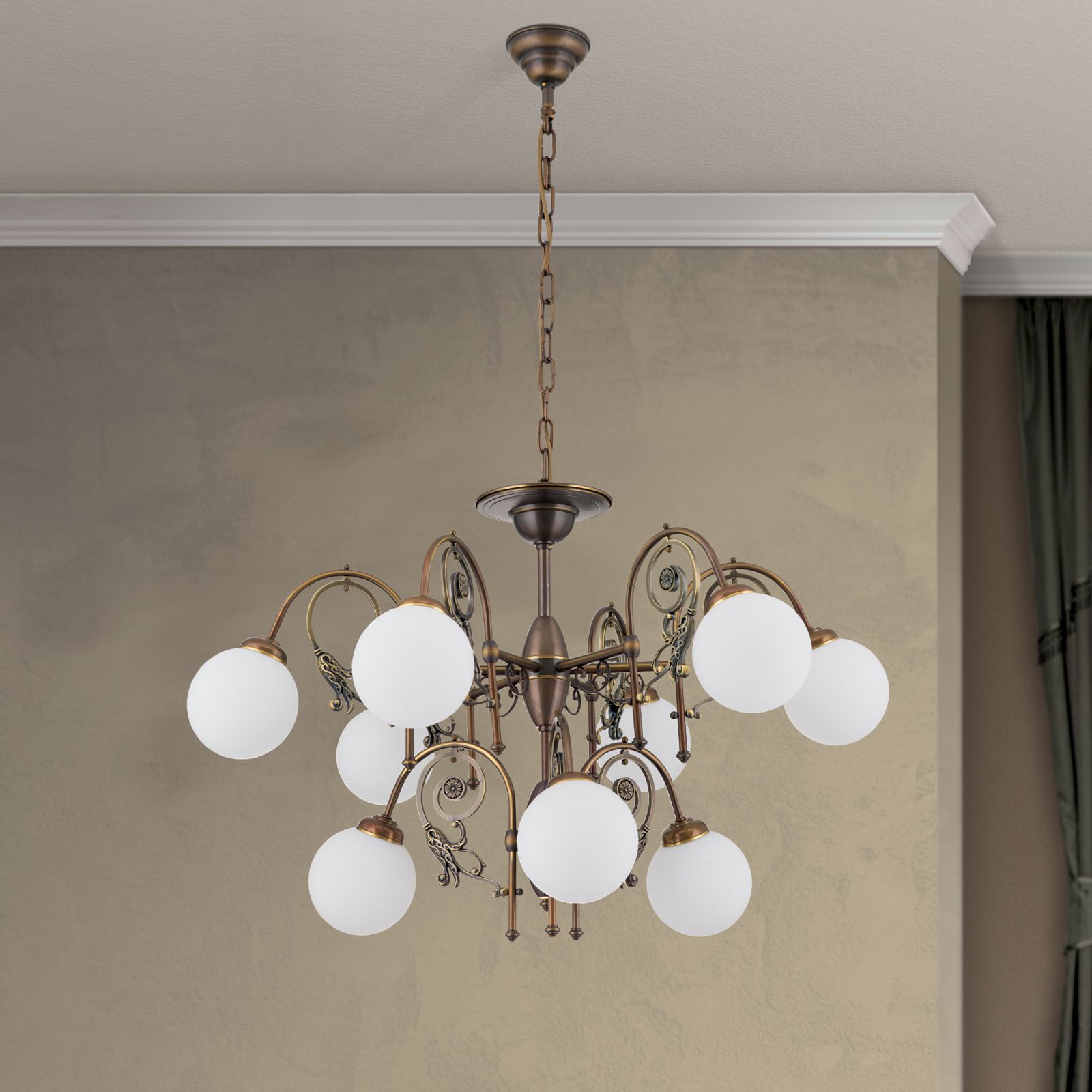 Discover the elegant RINGSTRASSE chandelier - a ceiling light with nine flames that bathes your rooms in an enchanting light while exuding a touch of classic luxury. With its aged patina finish and opal matt spherical glasses, this chandelier is not only a practical source of light, but also an artistic decorative object.