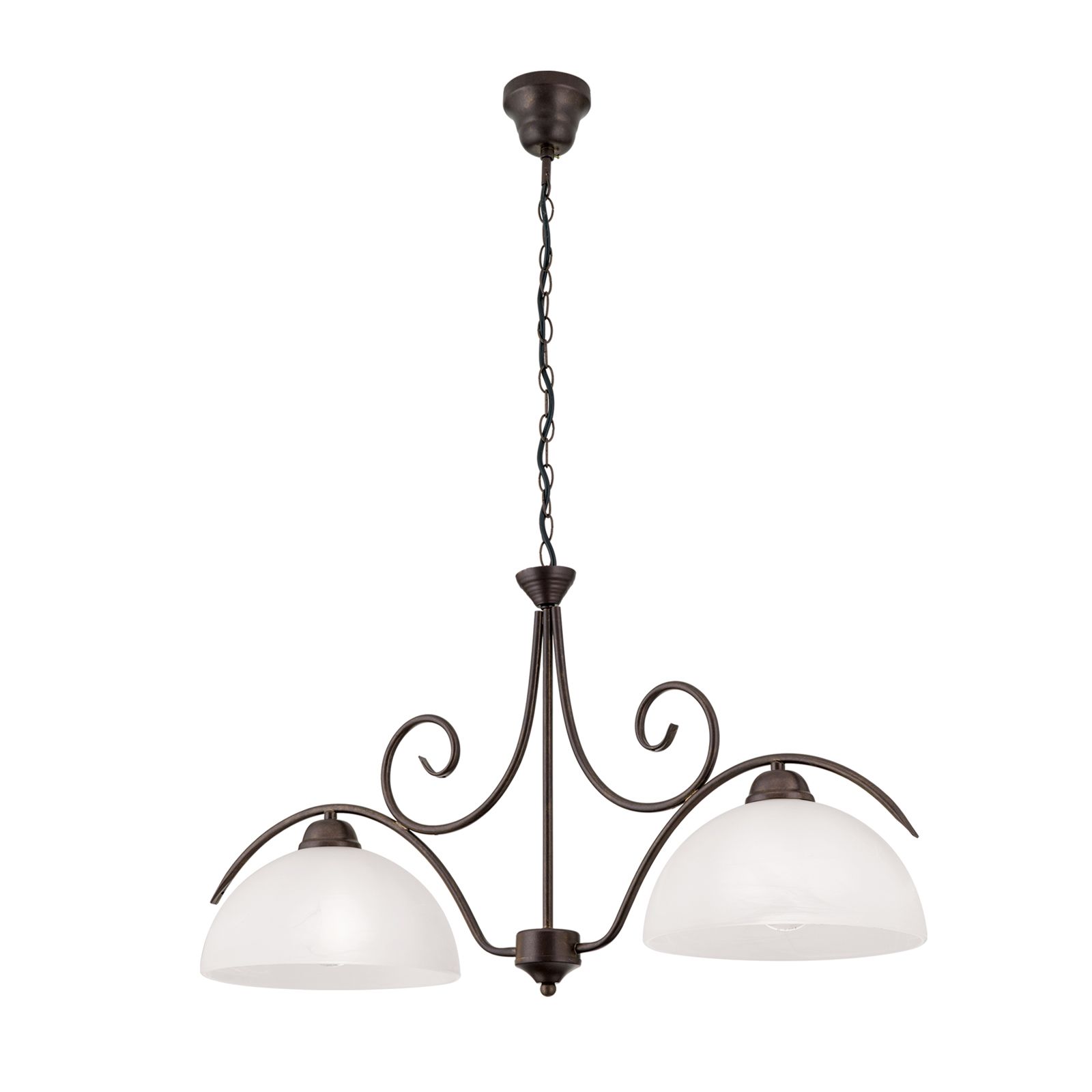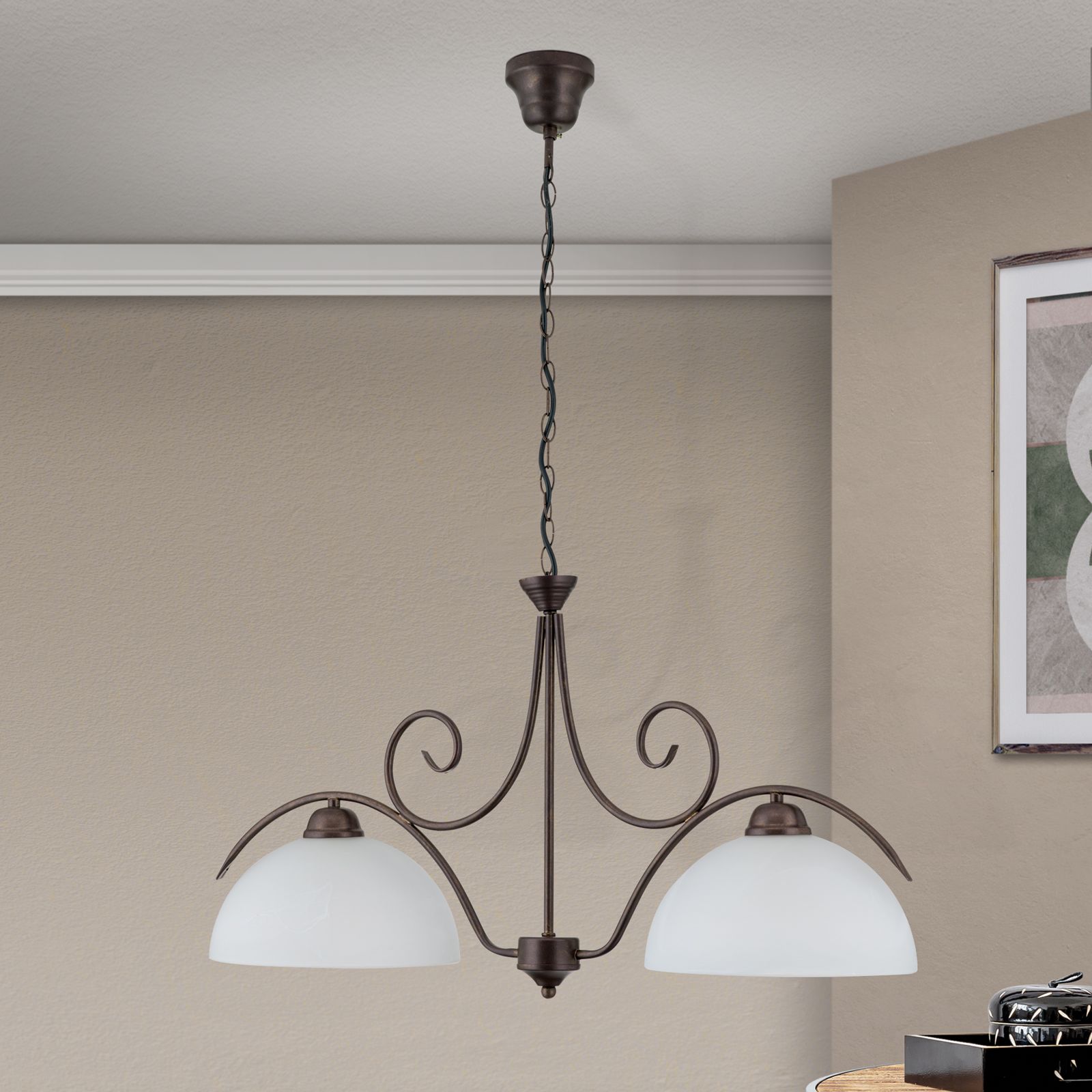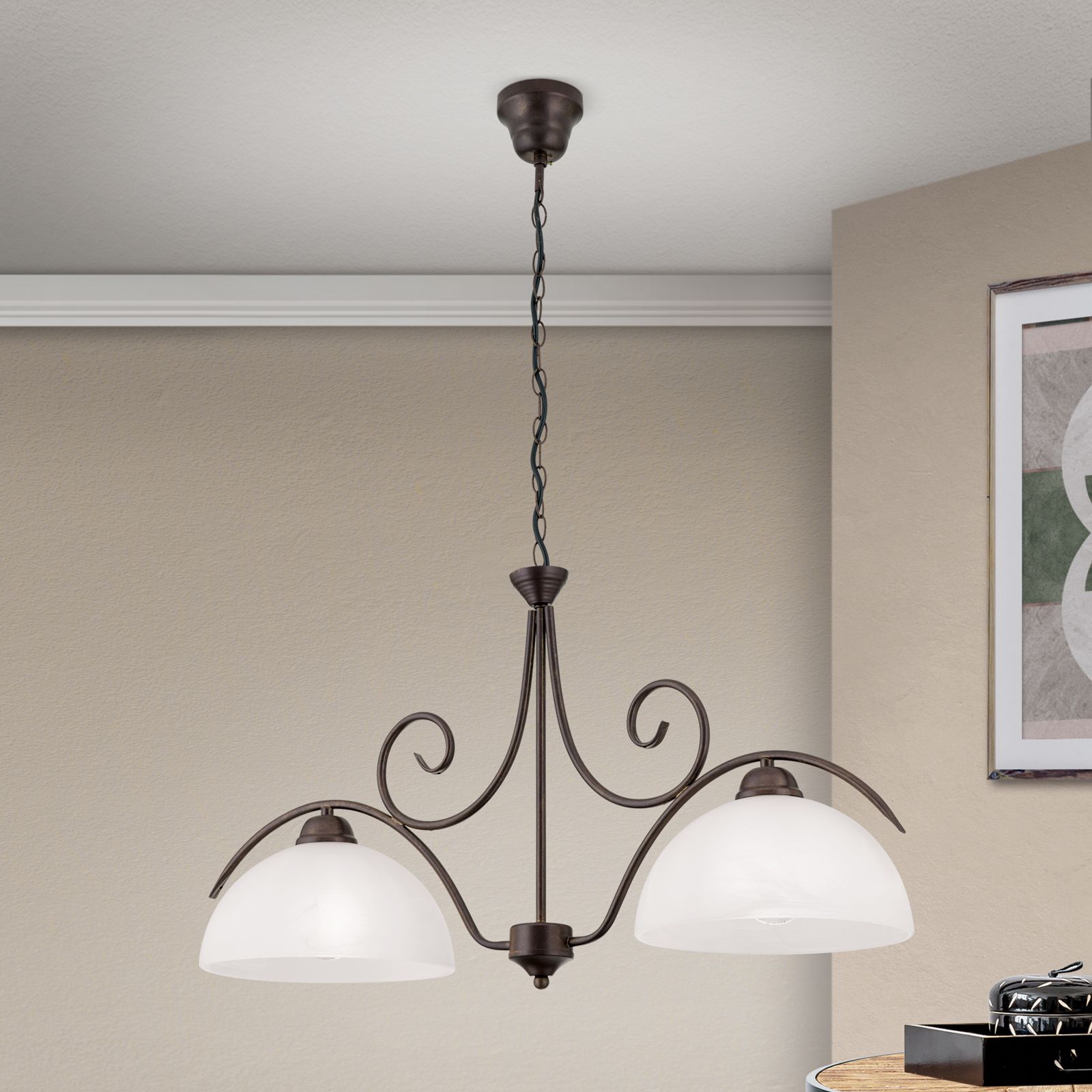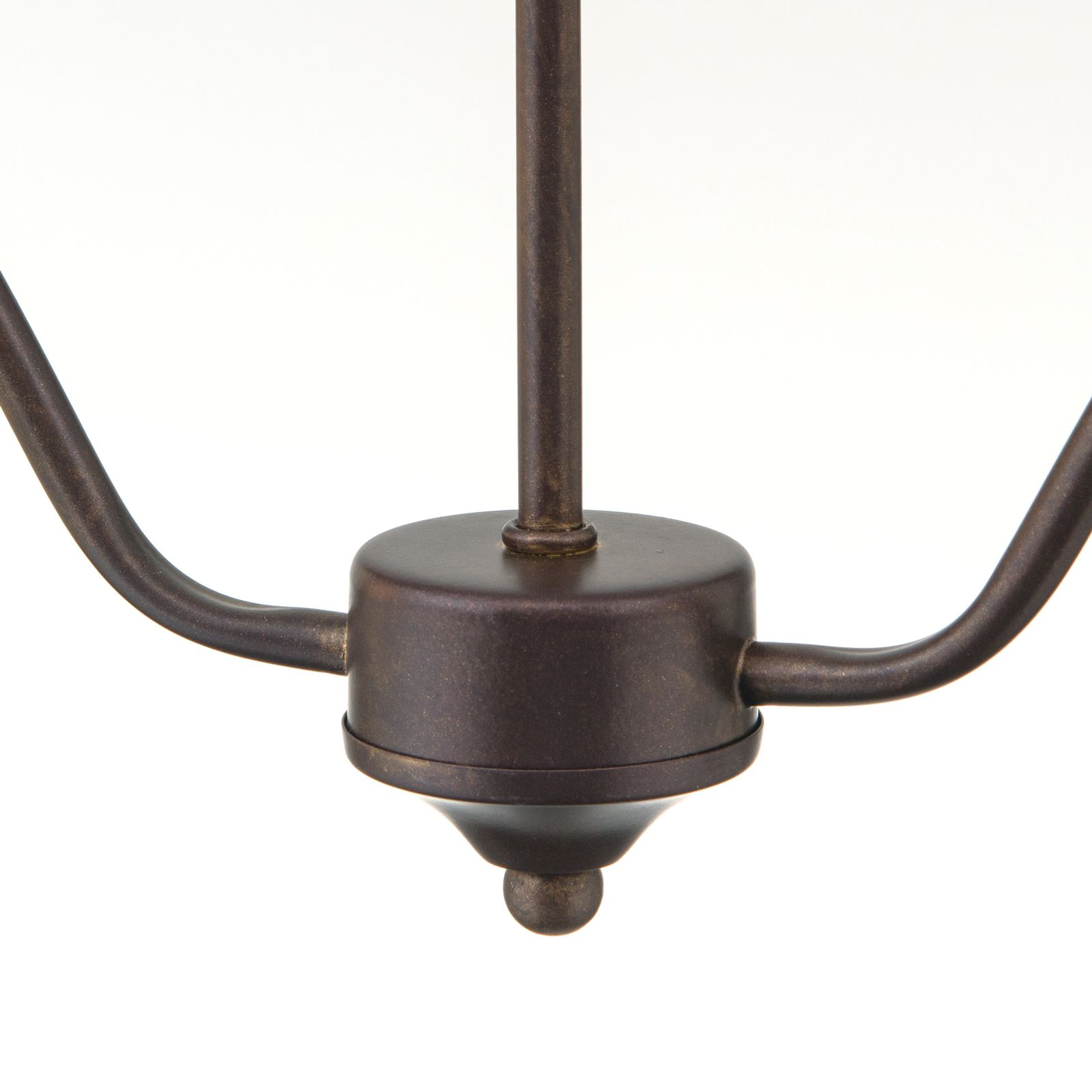Three opal matt glass shades are attached to the antique brown curved metal frame supplying cosiness without dazzling. The chandelier is equipped with a chain suspension that can be shortened during assembly if necessary. Two E27 sockets can be fitted with a maximum of 60 watts per socket. Round matt white LED lamps in the shape of drops are ideally suited.