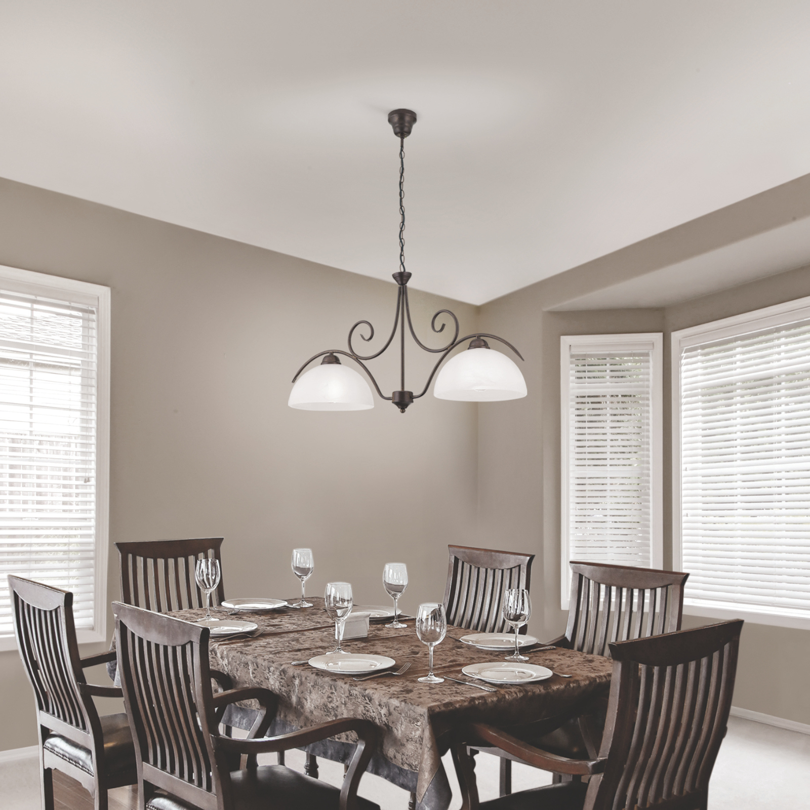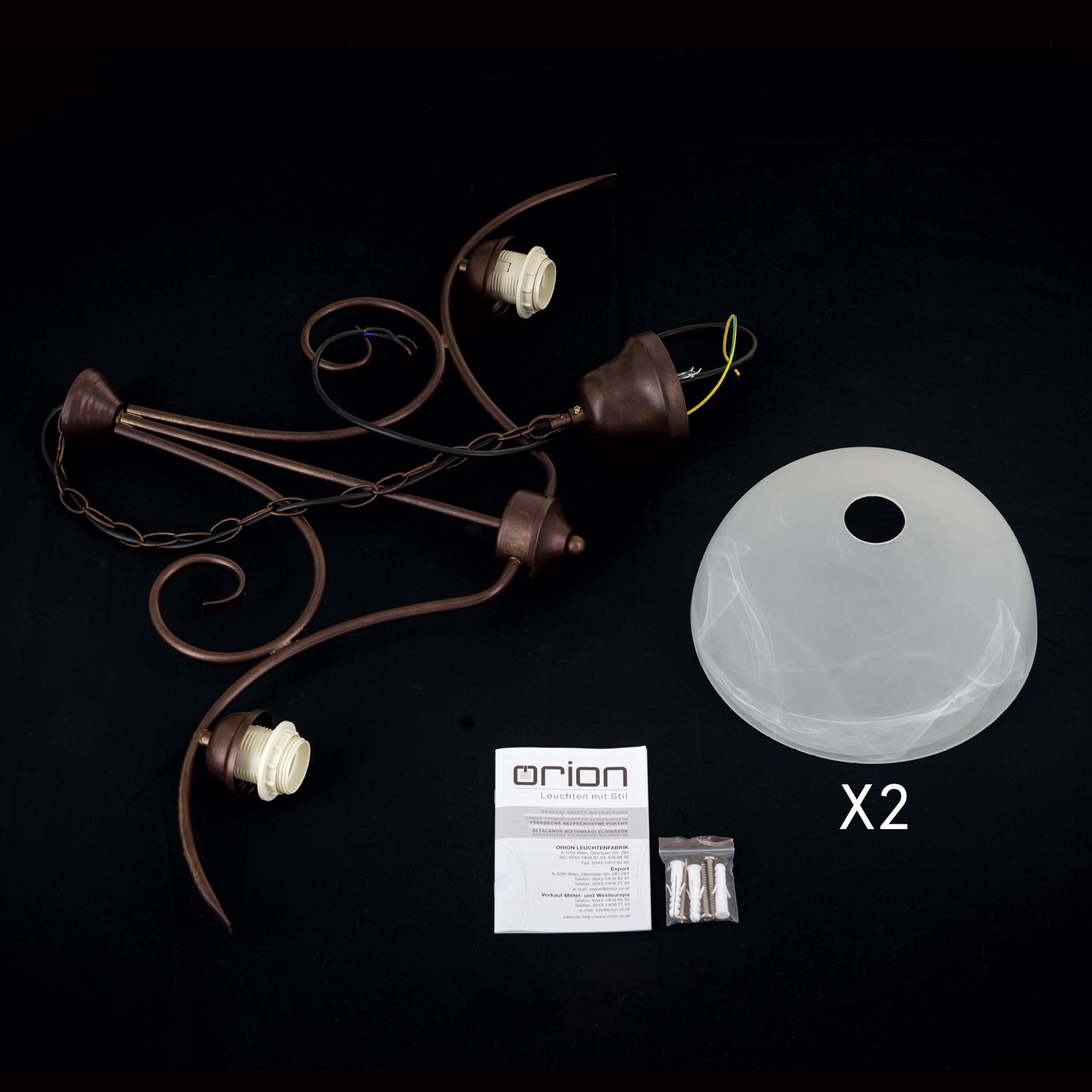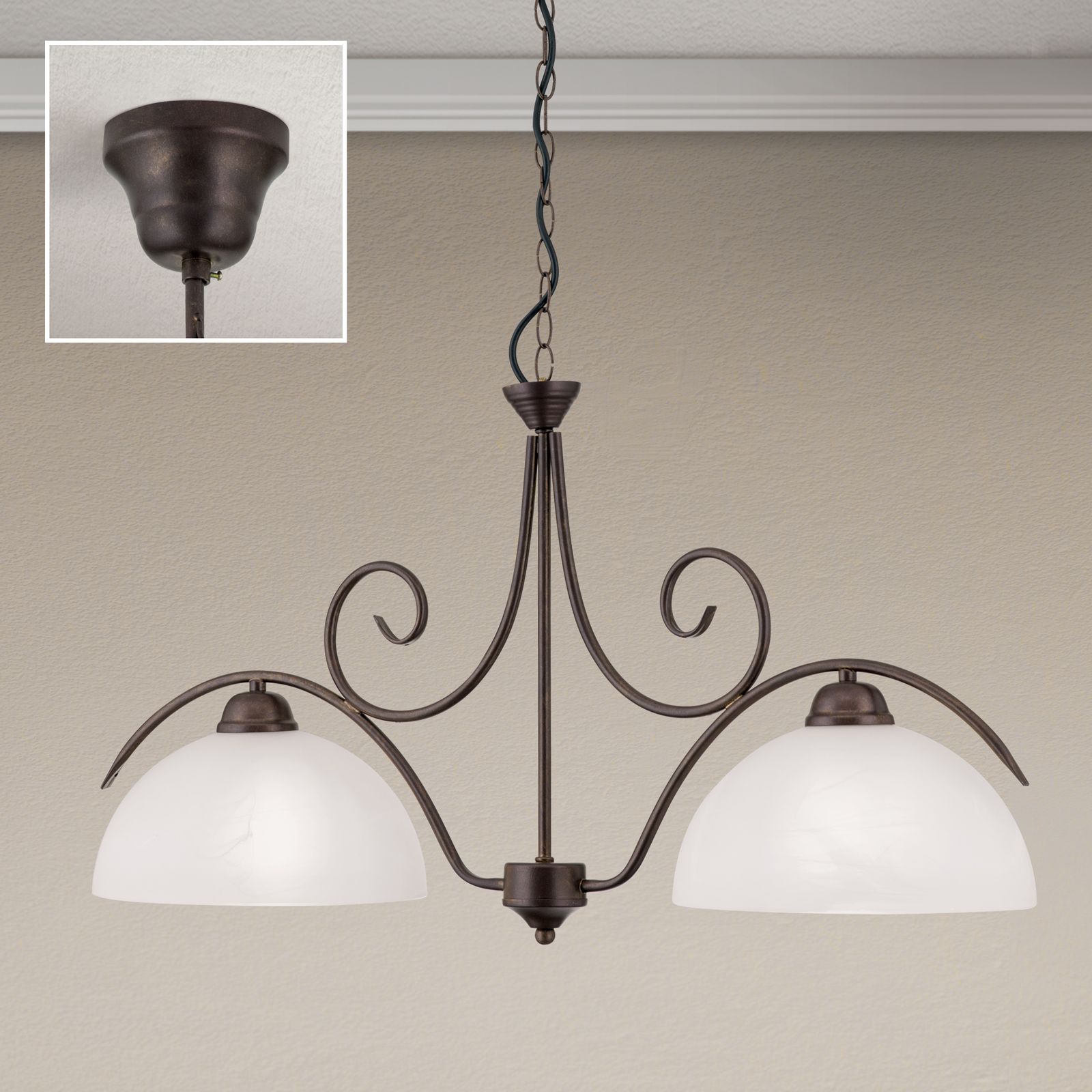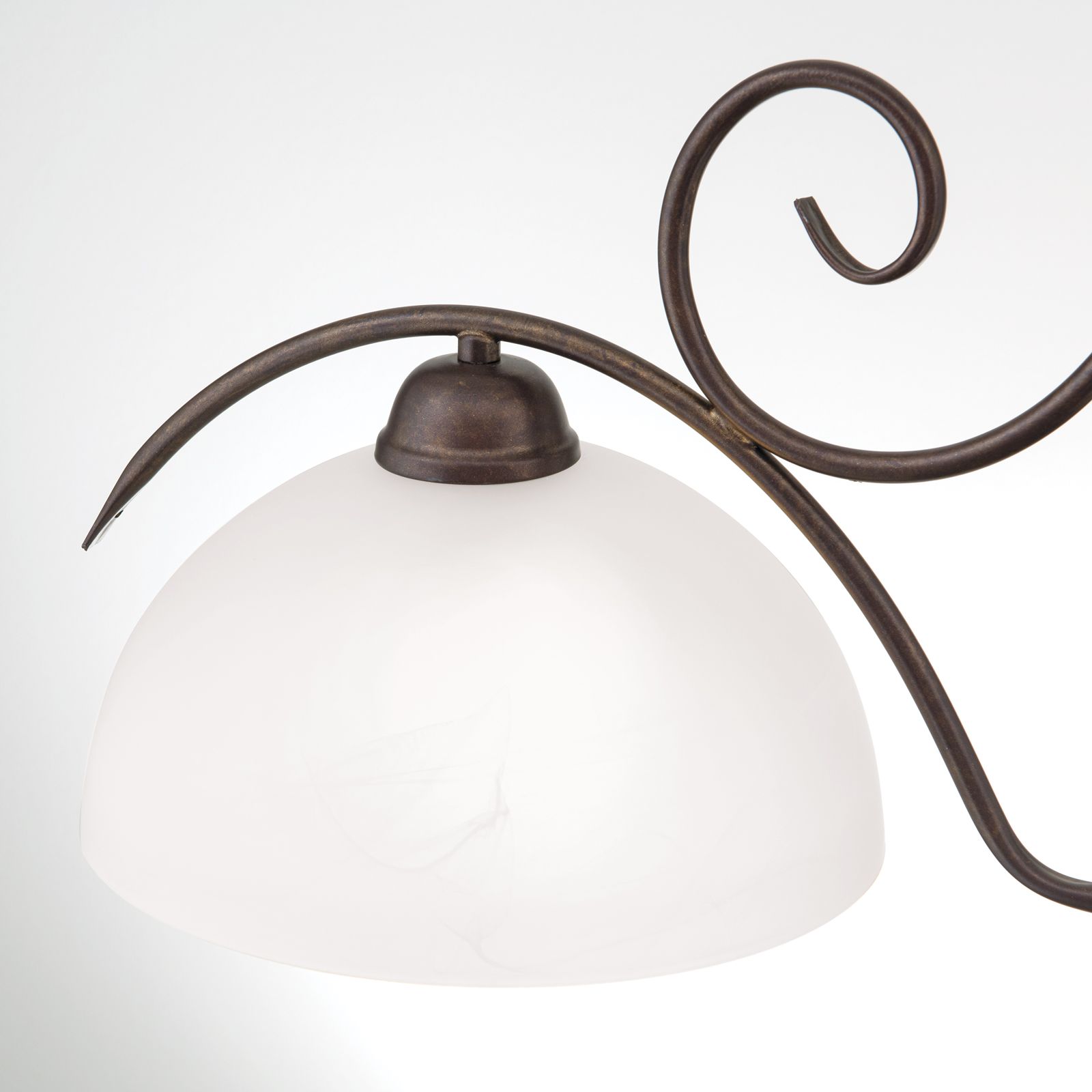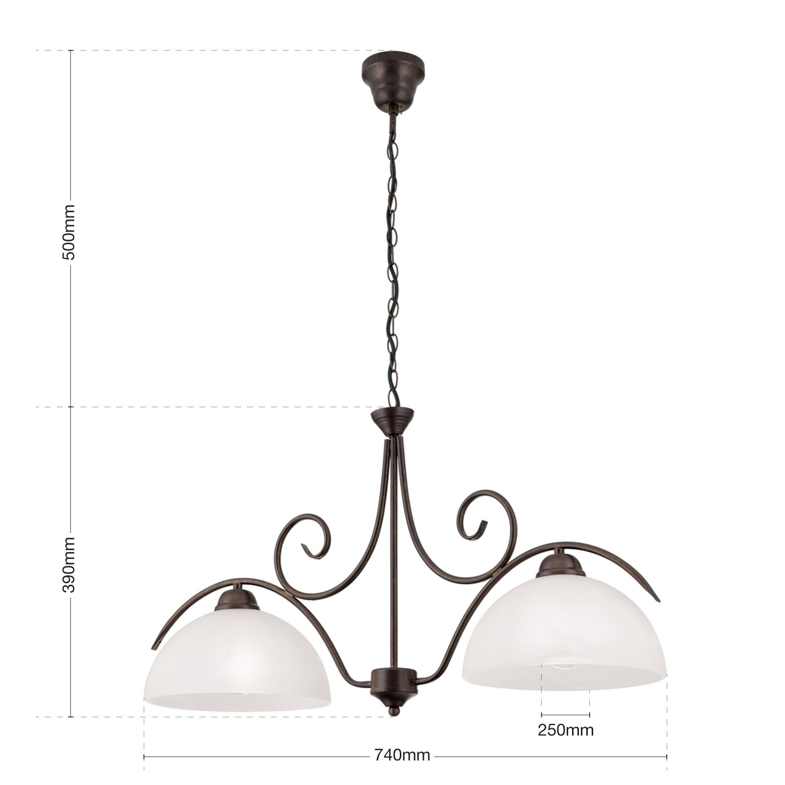Three opal matt glass shades are attached to the antique brown curved metal frame supplying cosiness without dazzling. The chandelier is equipped with a chain suspension that can be shortened during assembly if necessary. Two E27 sockets can be fitted with a maximum of 60 watts per socket. Round matt white LED lamps in the shape of drops are ideally suited.