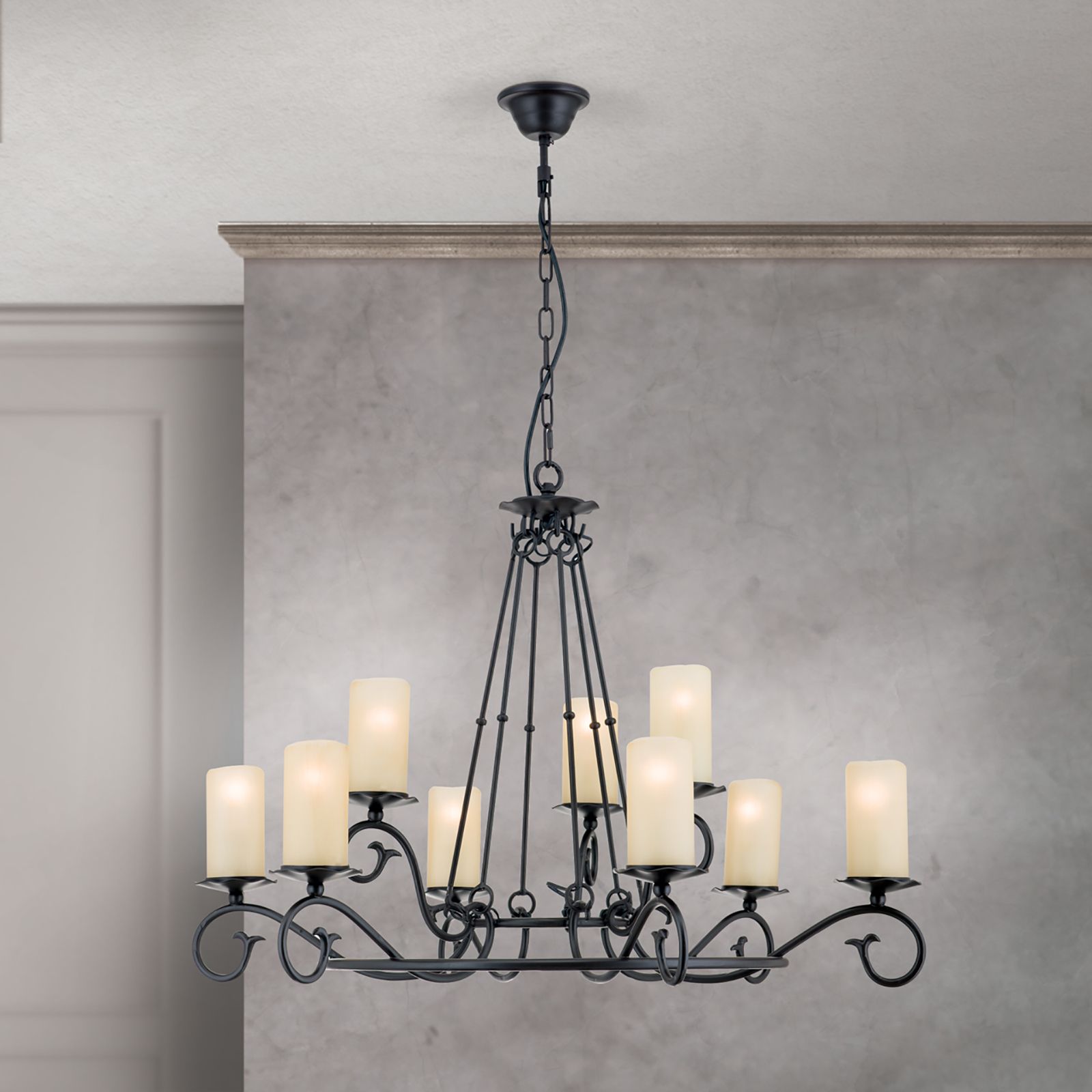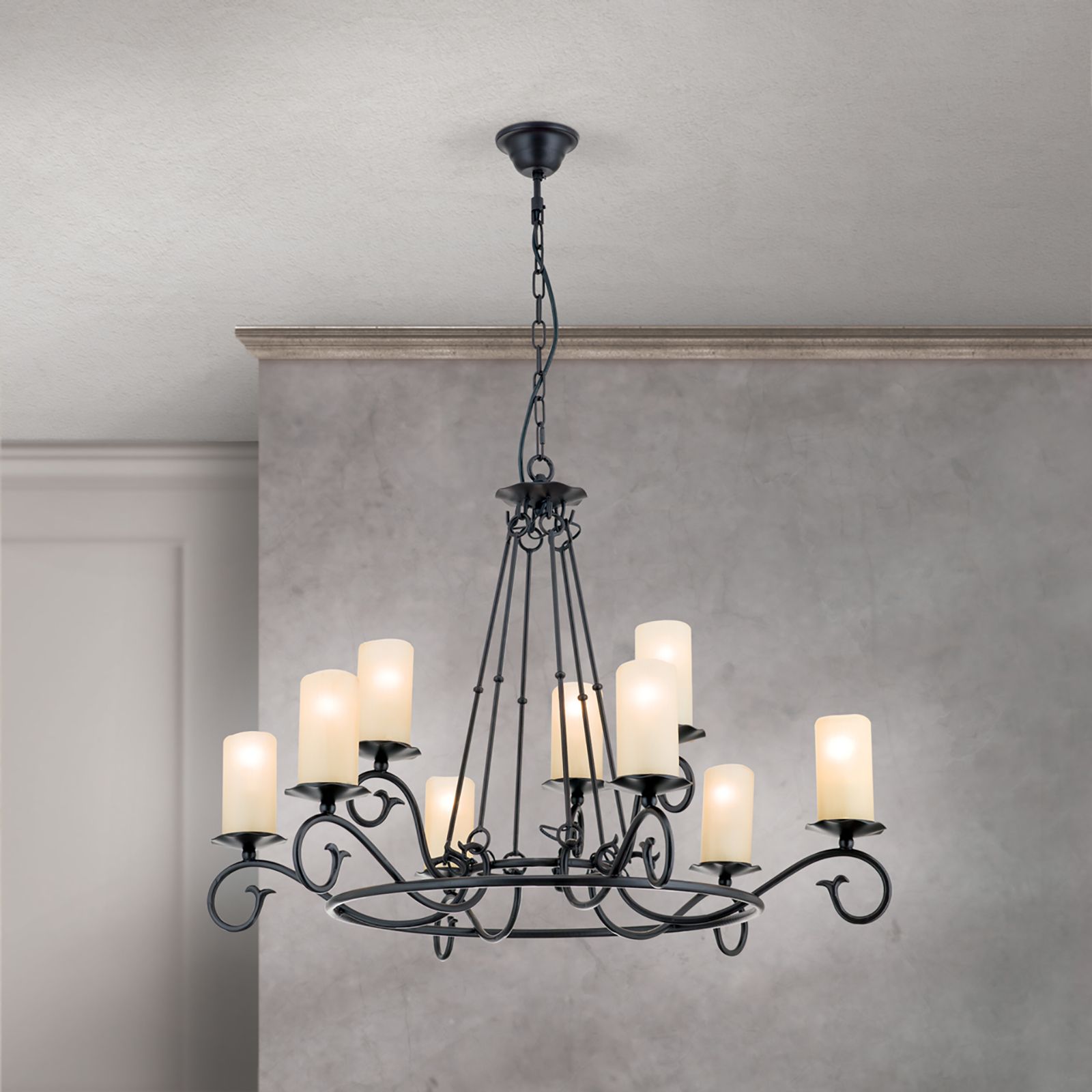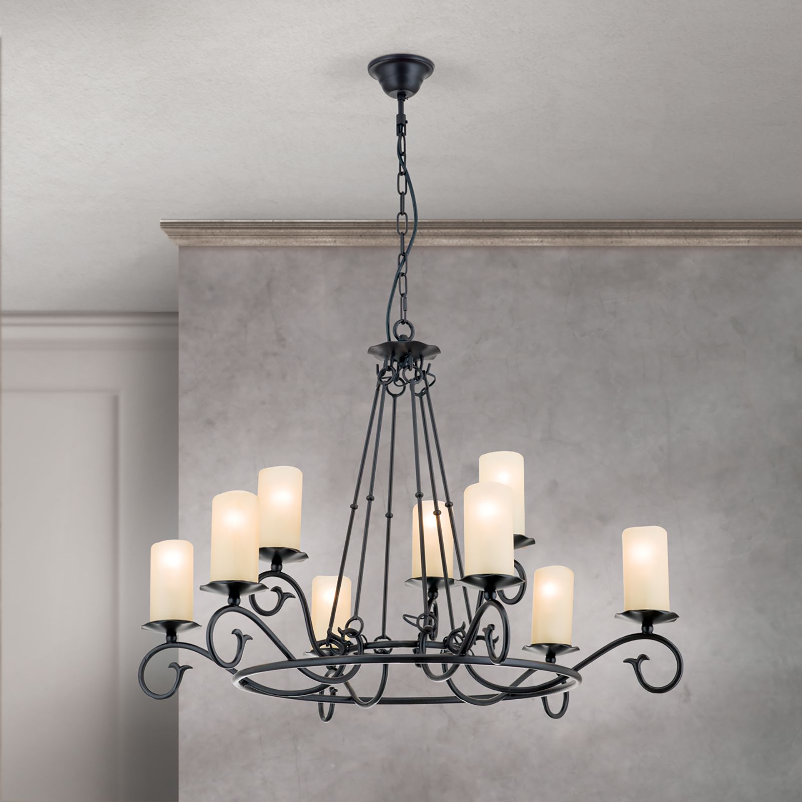 RUSTICKA fits perfectly into country style interiors, where the rustic chandelier in forged design can unfold its full effect. Nine curved arms in romantic spirals are attached to a solid metal ring topped with drop catchers. Cylindrical, opal-matt glasses, reminiscent of wax candles, provide glare-free and pleasant basic illumination. In combination with a dimmer, light brightness can be individually adjusted and different lighting scenarios created The chandelier has 9 E14 sockets that can be fitted with 40 watts maximum. With economical LEDs, it can also be used for permanent, energy-efficient basic illumination.