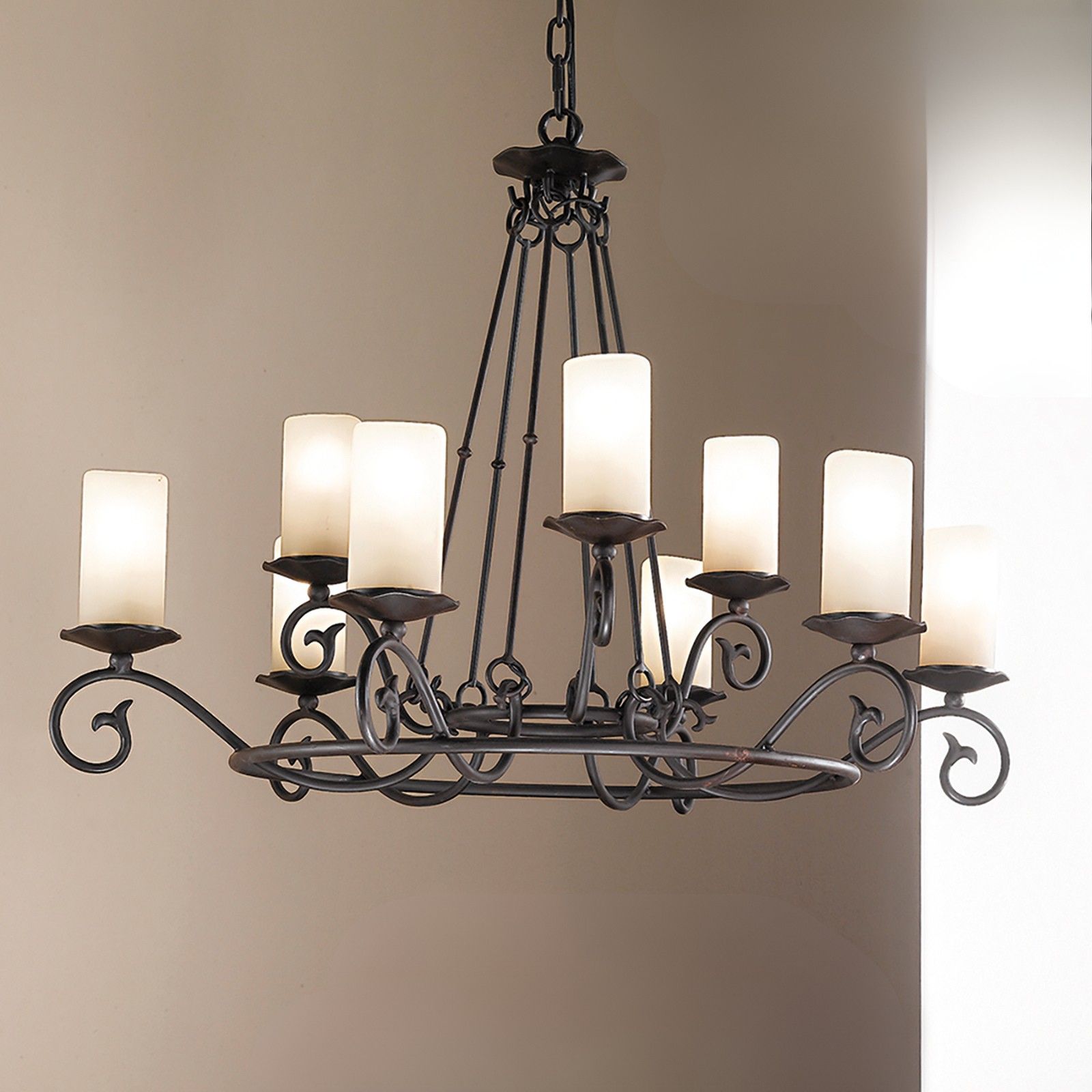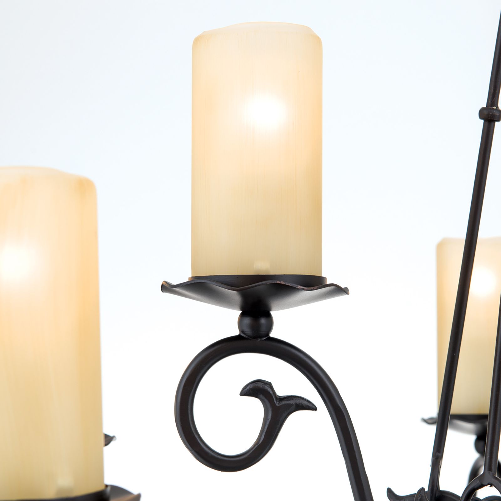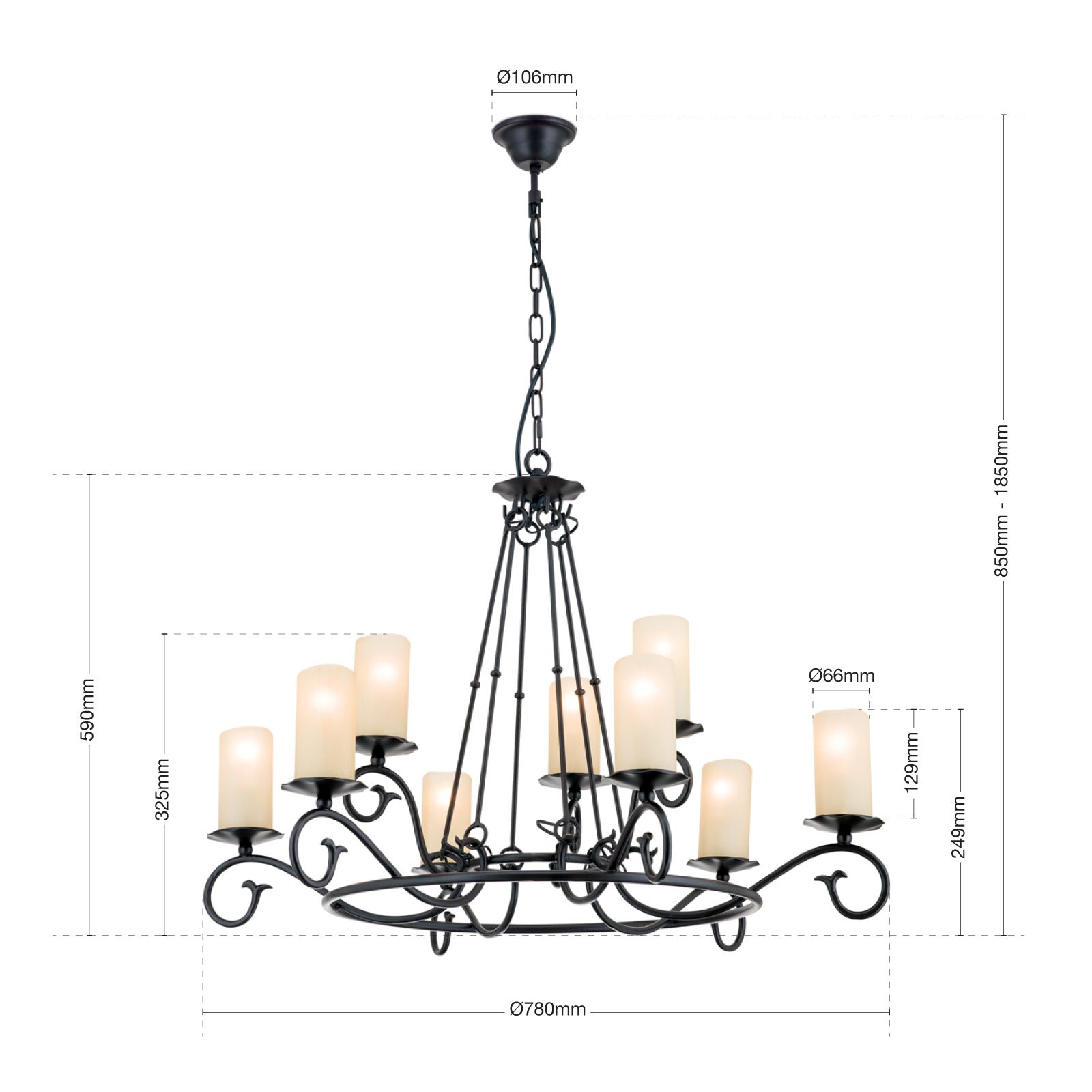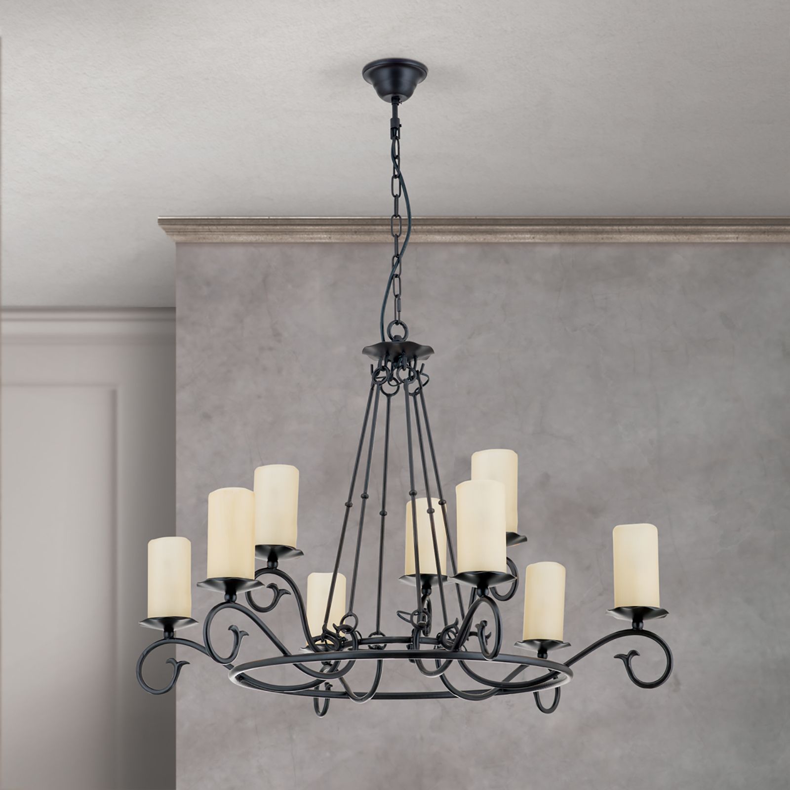 RUSTICKA fits perfectly into country style interiors, where the rustic chandelier in forged design can unfold its full effect. Nine curved arms in romantic spirals are attached to a solid metal ring topped with drop catchers. Cylindrical, opal-matt glasses, reminiscent of wax candles, provide glare-free and pleasant basic illumination. In combination with a dimmer, light brightness can be individually adjusted and different lighting scenarios created The chandelier has 9 E14 sockets that can be fitted with 40 watts maximum. With economical LEDs, it can also be used for permanent, energy-efficient basic illumination.
