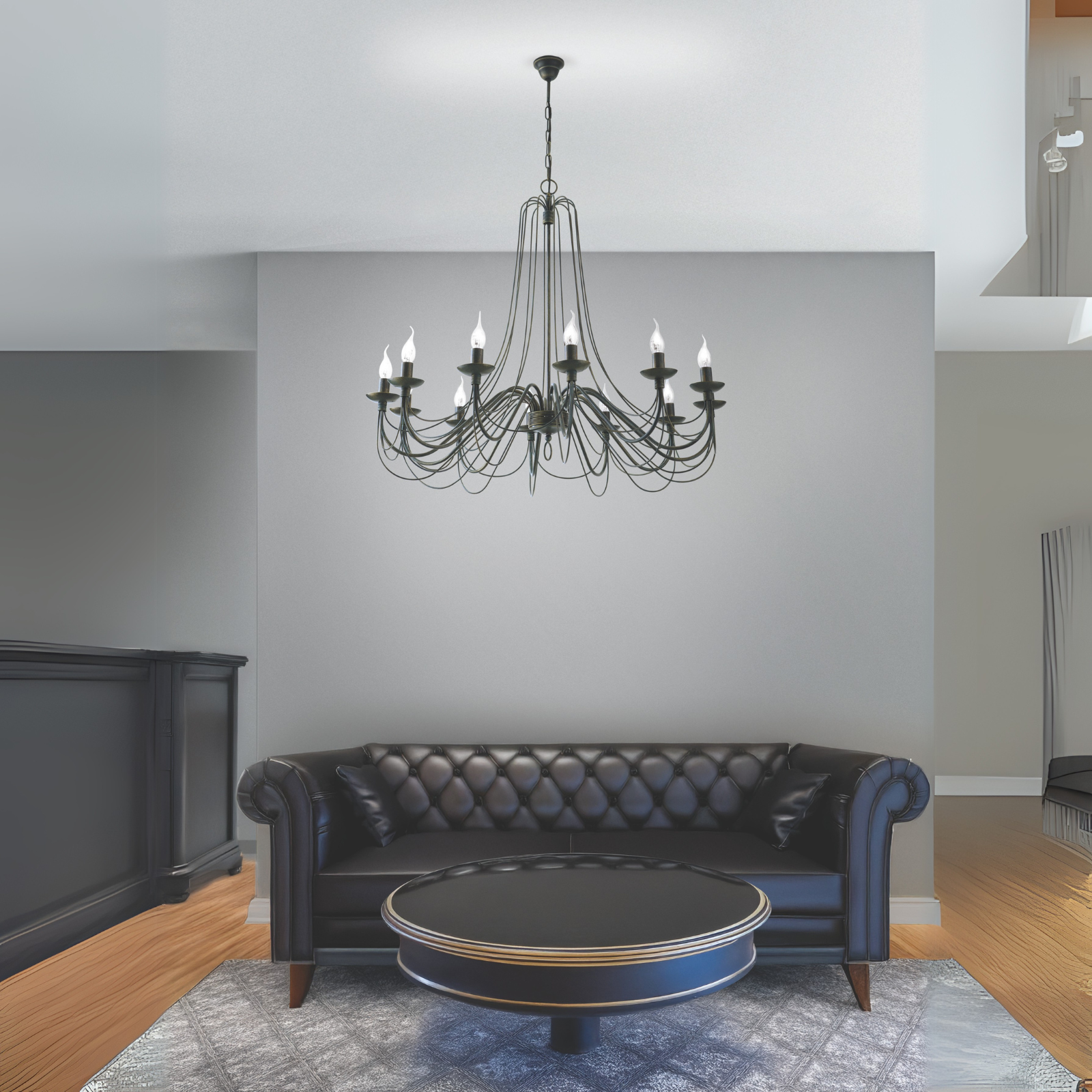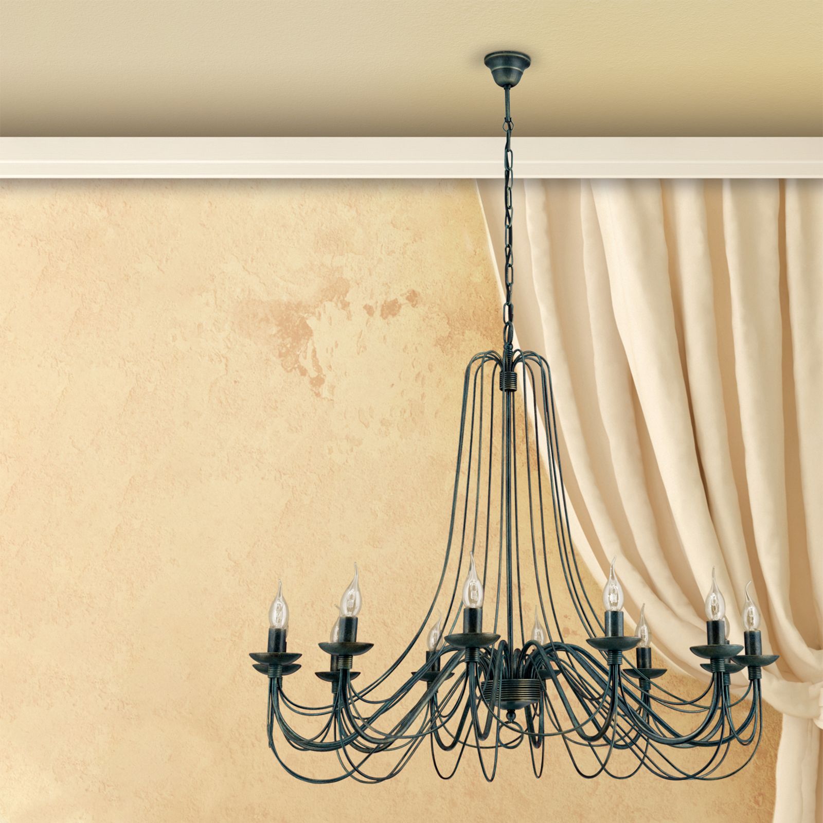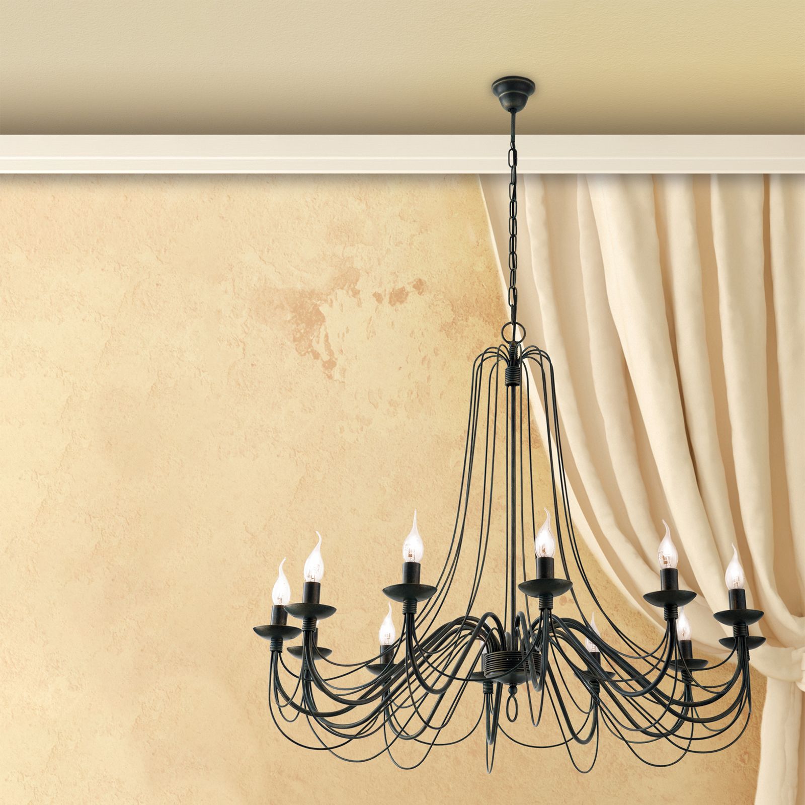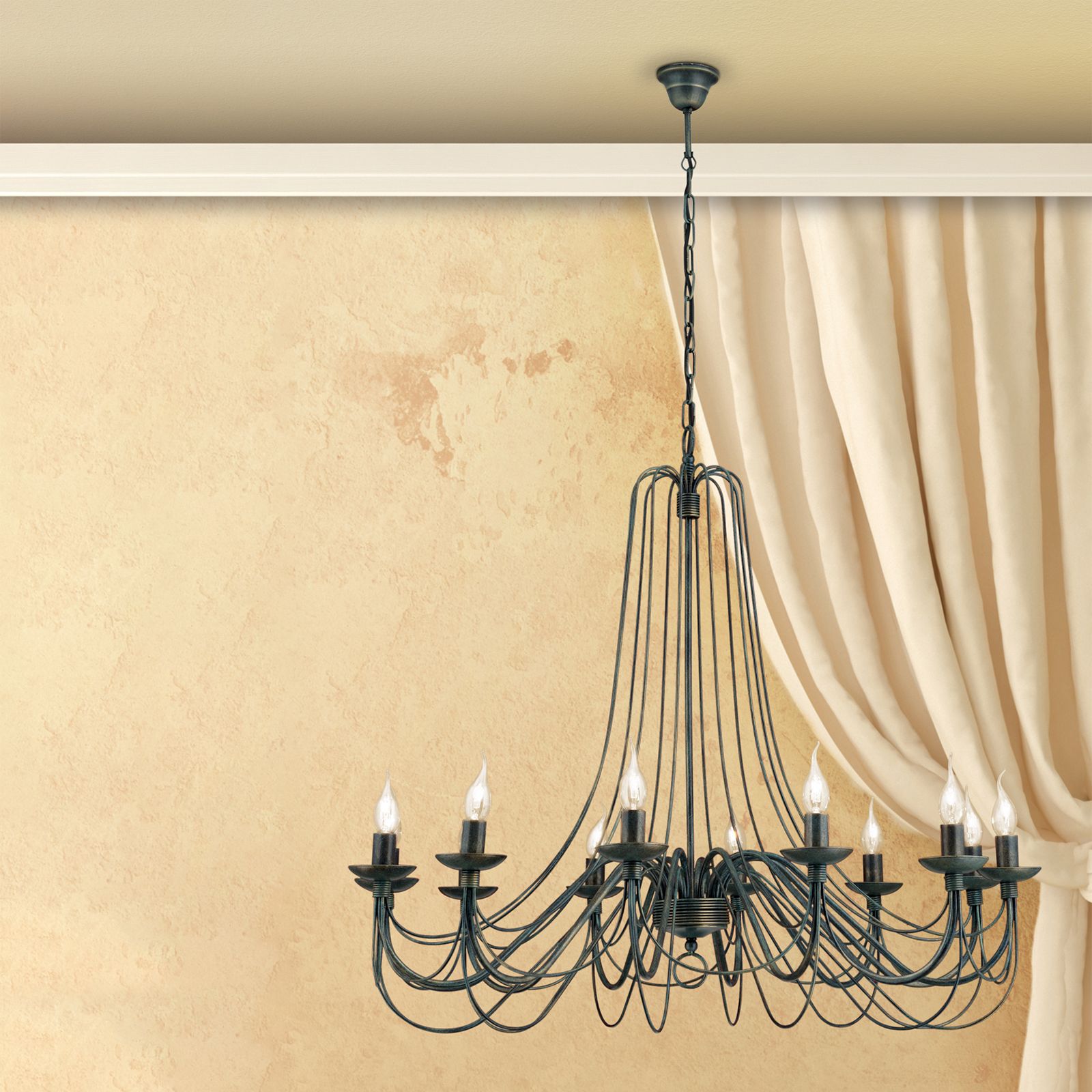 The 12-flames chandelier from the VELA series is characterised by artfully filigree design elements. The arms are the modern version of classic S-bows from baroque chandeliers. Fine wrought iron runs into the arm base. From the shaft top, fine metal threads seem to flow like water from a spring to the flames. The chandelier is attached to the ceiling a chain ending in a bell-shaped rosette. Twelve E14 sockets with up to 40 watts each let rooms shine splendidly.