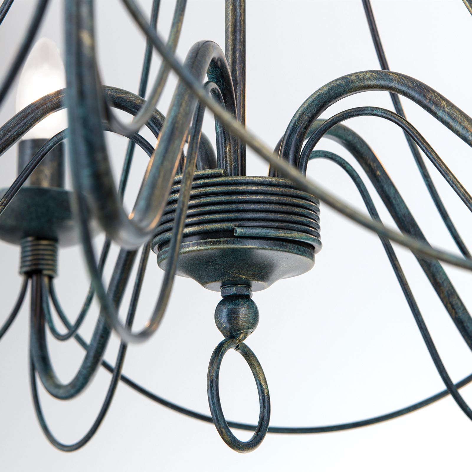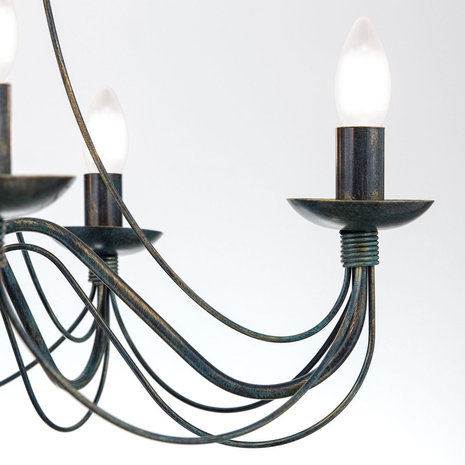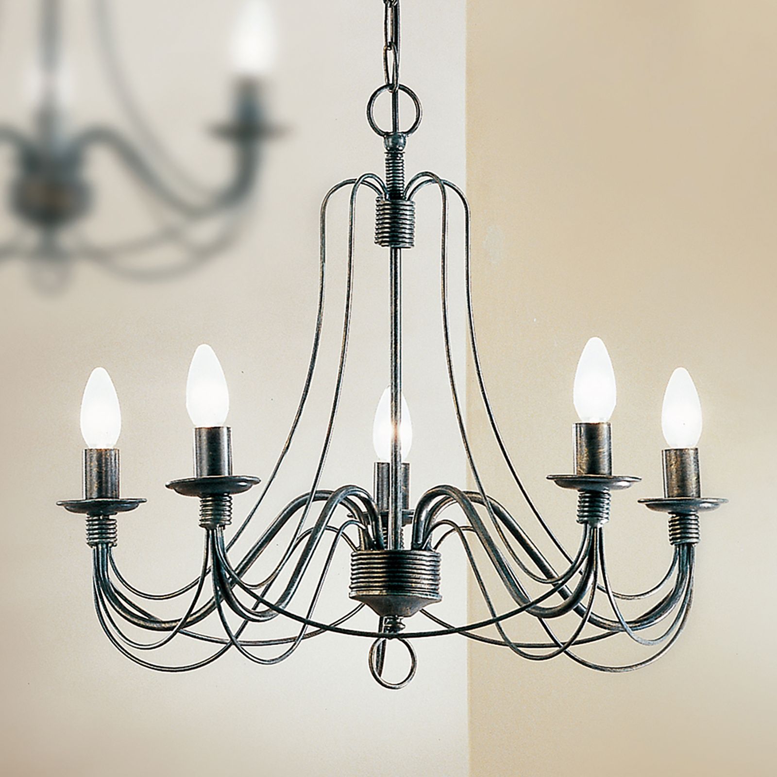 The 5-flames chandelier from the VELA series perpetuate the wrought iron artwork of Flemish and Lübeck master workshops. The fusion of different eras - Baroque, Rococo, Empire - with tastefully contemporary design elements results in a chandelier blending in well with antique décor as well as modern styles. The fine stays sweepingly connect the flames to the arm attachments from which the shaft top seems to spring like a fountain. The individual flames are connected in a ring pattern. The chandelier has five E14 sockets with 40 watts maximum each.